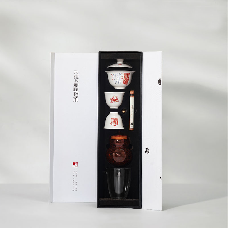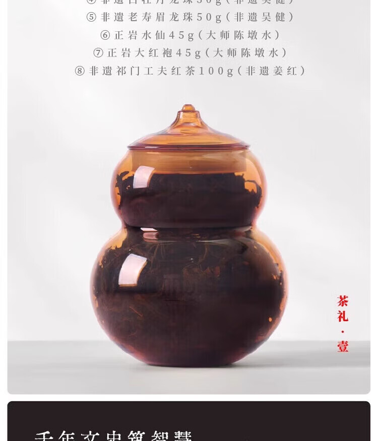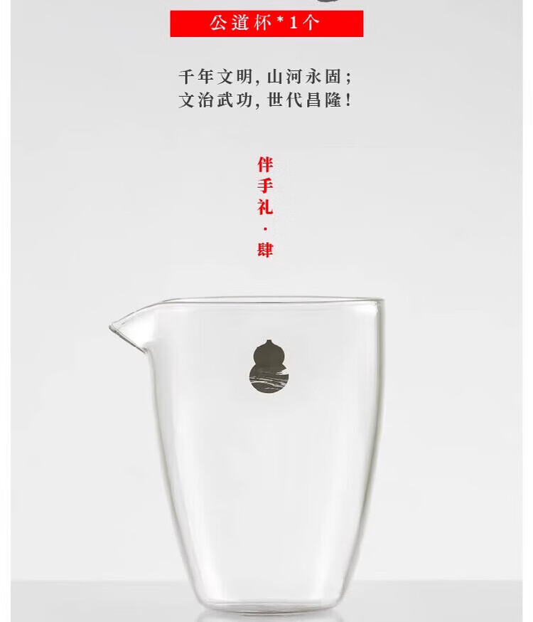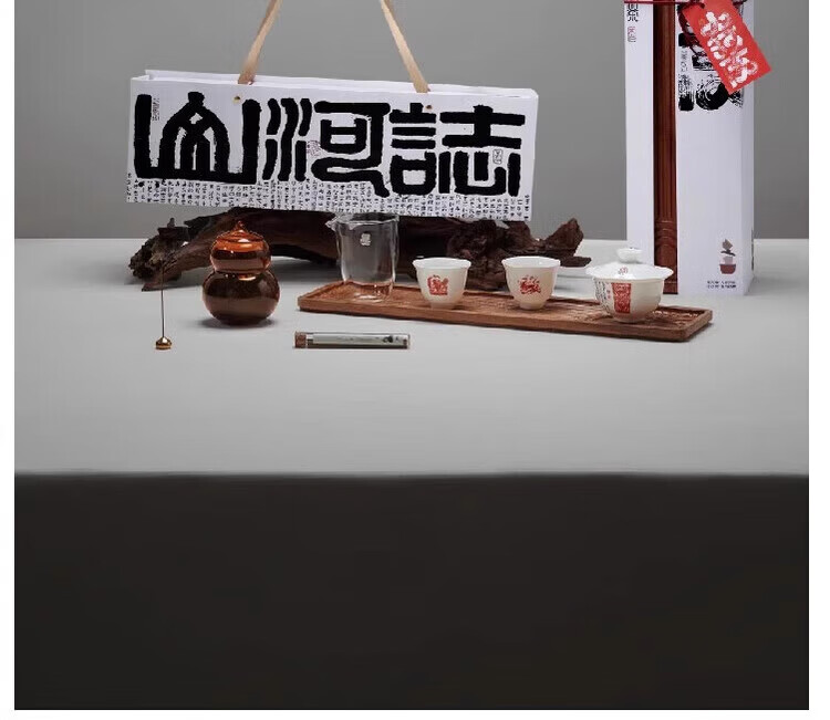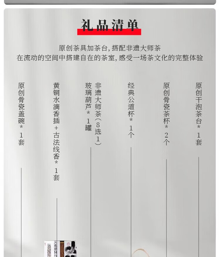 配置清单:礼盒*1 原创干泡茶台*1套 原创骨瓷盖碗*1套 原创骨瓷茶杯*2个 经典公道杯*1个 非遗茉莉花茶80g玻璃葫芦*1罐 黄铜水滴香插+古法线香*1套