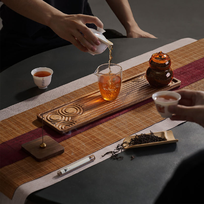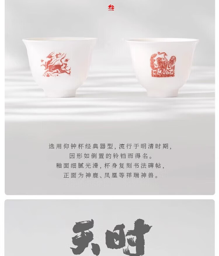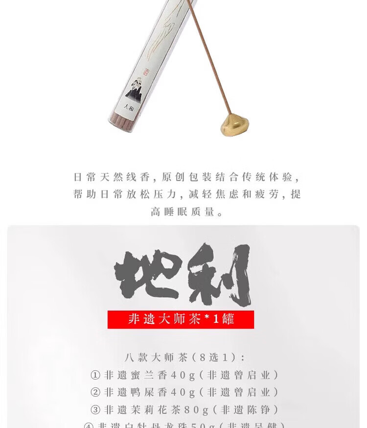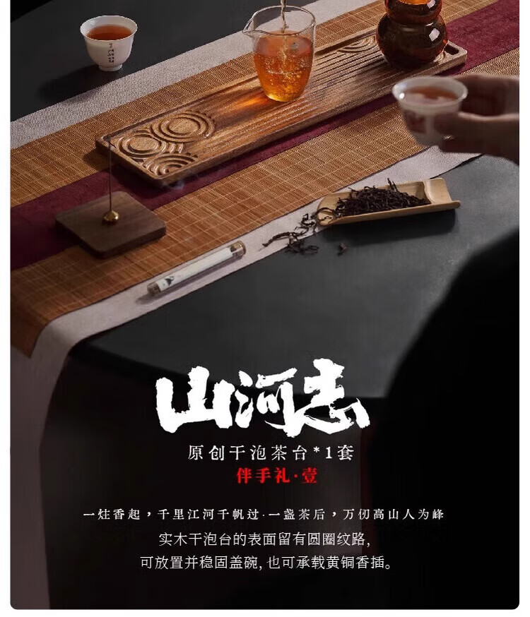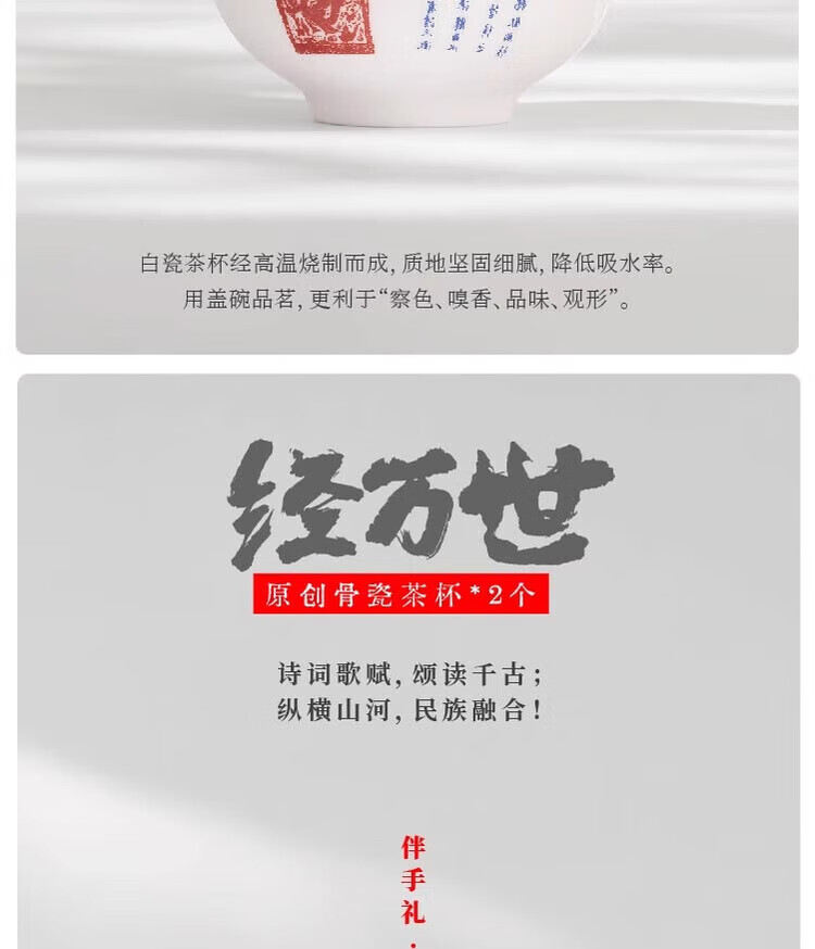 配置清单:礼盒*1 原创干泡茶台*1套 原创骨瓷盖碗*1套 原创骨瓷茶杯*2个 经典公道杯*1个 非遗茉莉花茶80g玻璃葫芦*1罐 黄铜水滴香插+古法线香*1套