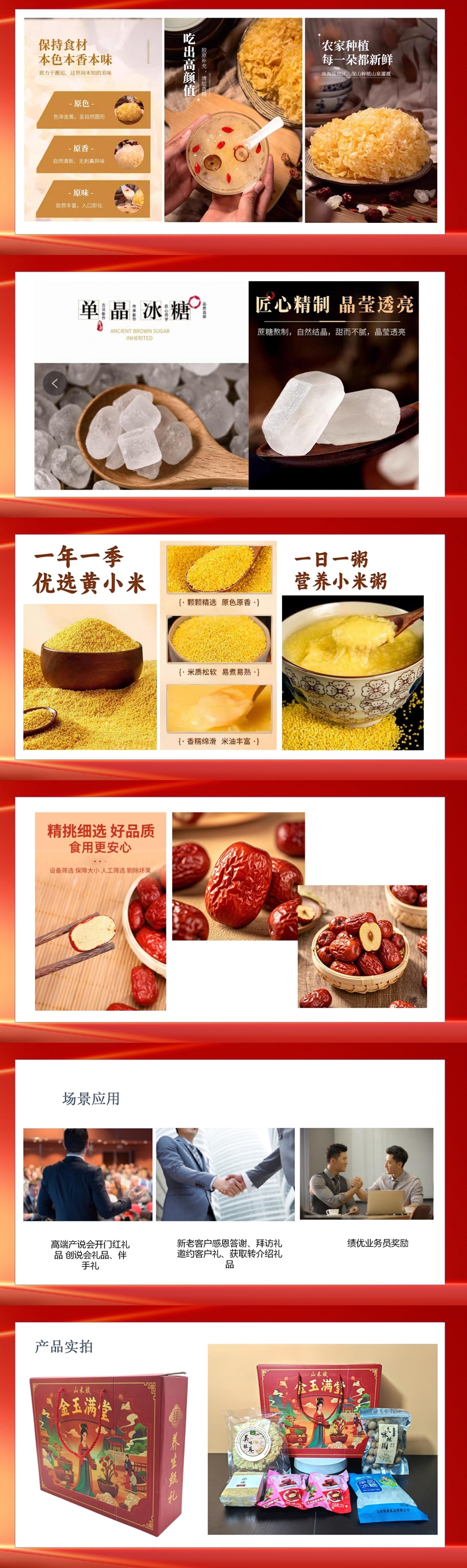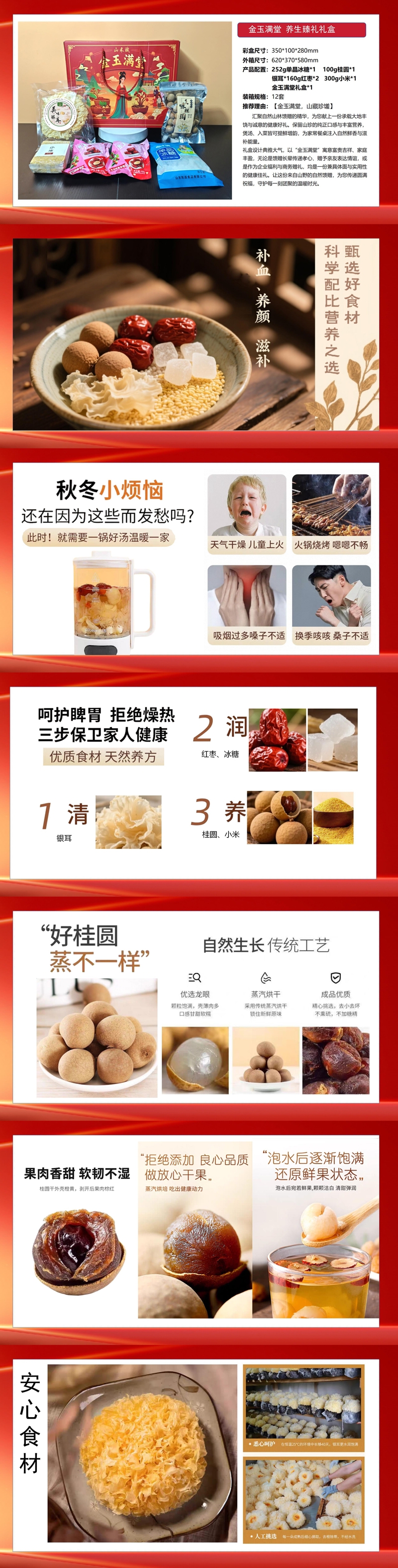 配置清单:彩盒尺寸:350*100*280mm 外箱尺寸:620*370*580mm 产品配置:252g单晶冰糖*1袋、100g桂圆*1袋 银耳*1朵、60g红枣*2袋 300g小米*1袋 金玉满堂礼盒*1个 装箱规格:12套