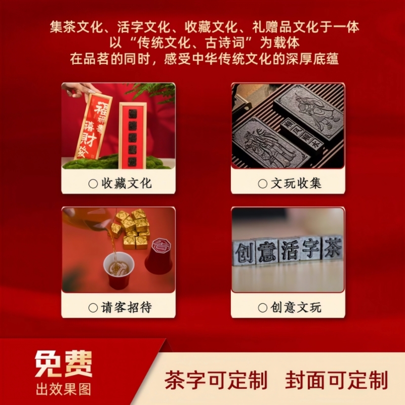 活字与茶叶的创意组合,一字一茶以字表意;高山料有趣茶,茶汤橙黄入口醇厚回甘;专属定制,让员工/客户感受到独一无二的心意