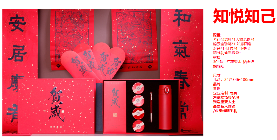 配置:名仕保温杯*1古树龙珠*4 锦云宝珠笔*1 如意团扇 对联*1-红包*4 门神*2 精装礼盒手提袋*1