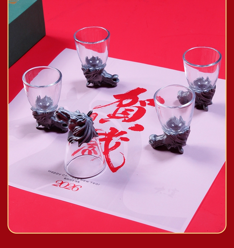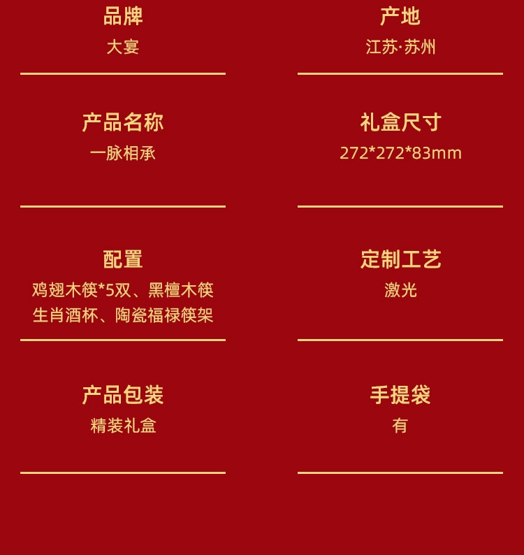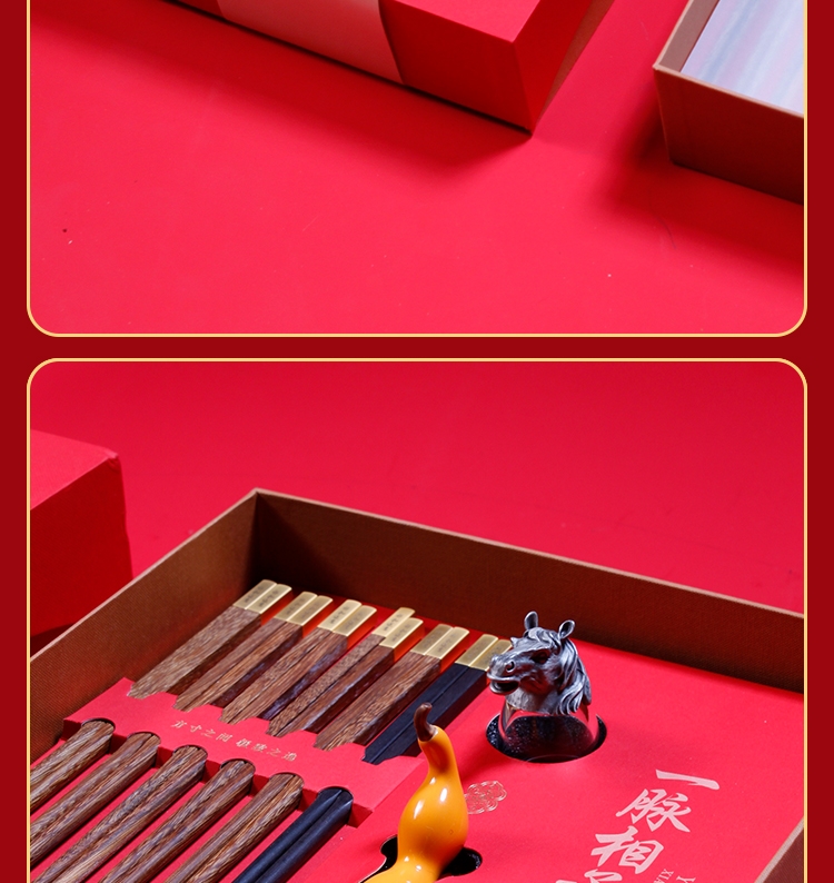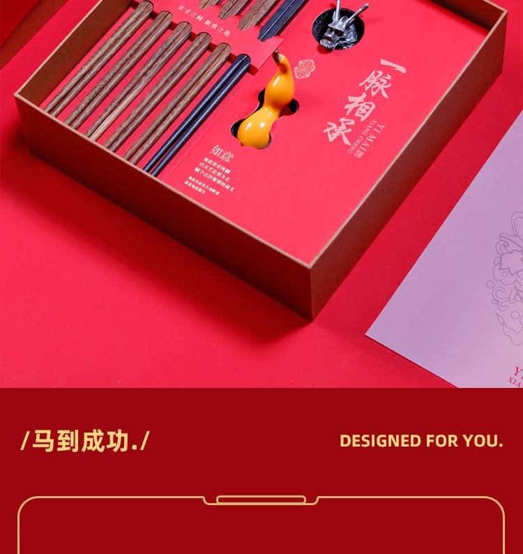 配置:鸡翅木筷*5黑檀木筷子x1 生肖酒杯x1(默认马首) 福禄陶瓷筷架x1 7.3*3cm 精装礼盒手提袋