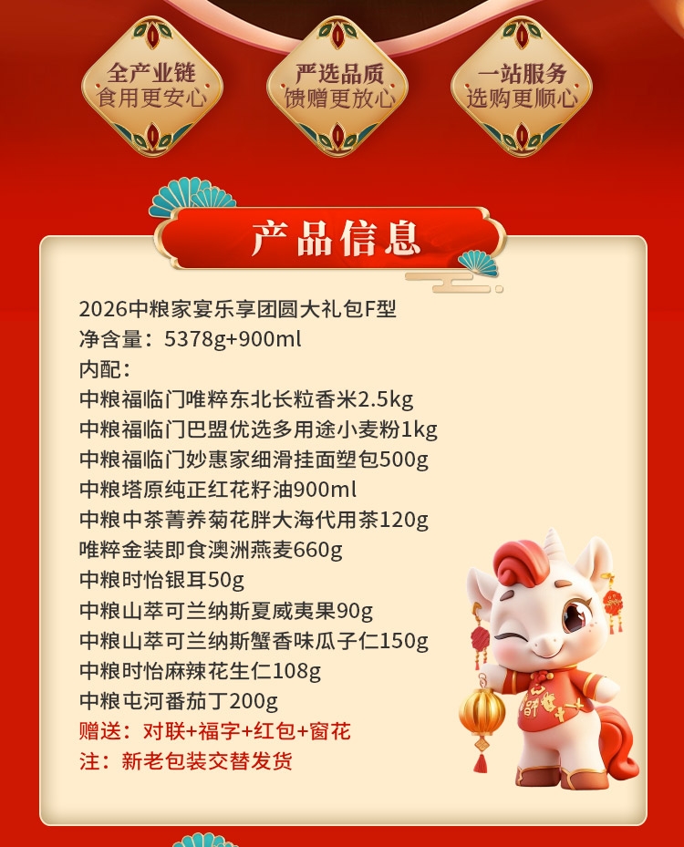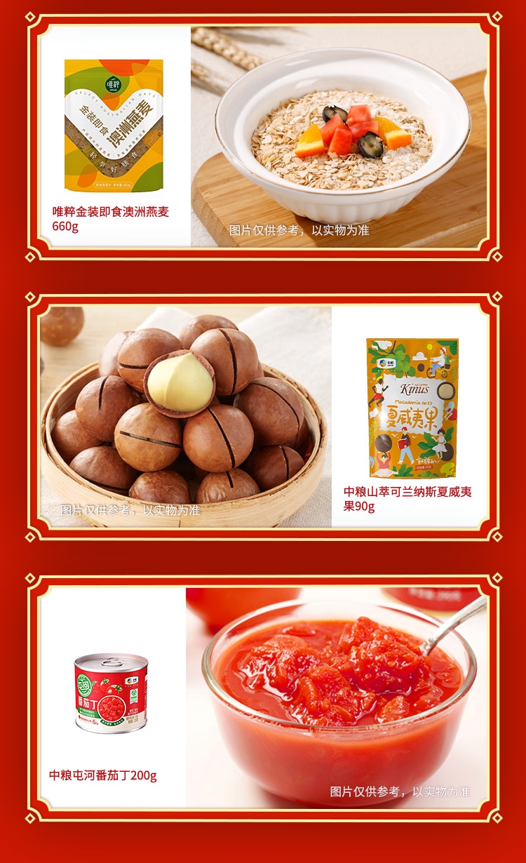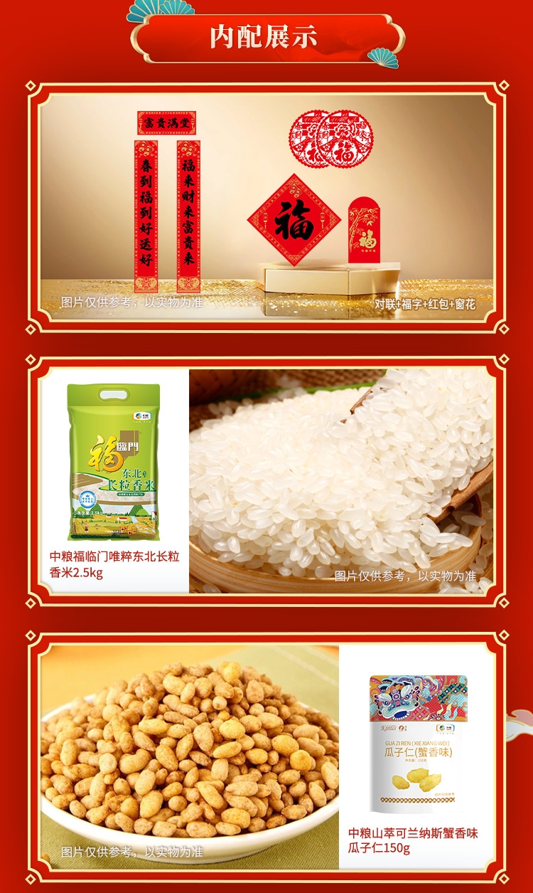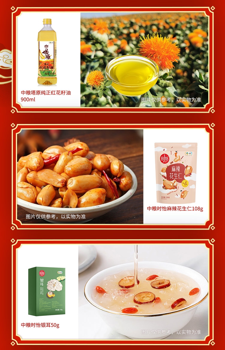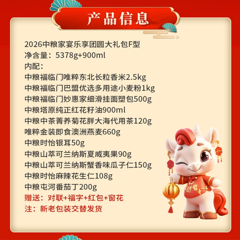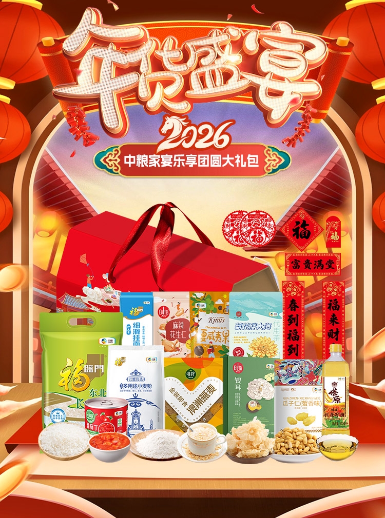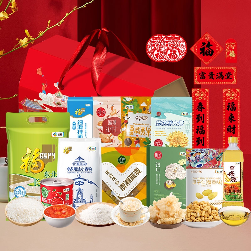 配置清单:净含量:5378g+900ml 内配: 中粮福临门唯粹东北长粒香米2.5kg 中粮福临门巴盟优选多用途小麦粉1kg 中粮福临门妙惠家细滑挂面塑包500g 中粮塔原纯正红花籽油900ml 中粮中茶菁养菊花胖大海代用茶120g 中粮时怡银耳50g 中粮山萃可兰纳斯夏威夷果90g 中粮时怡麻辣花生仁108g 中粮山萃可兰纳斯蟹香味瓜子仁150g 唯粹金装即食澳洲燕麦660g 中粮屯河番茄丁200g 赠送:对联+福字+红包+窗花