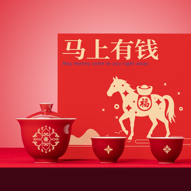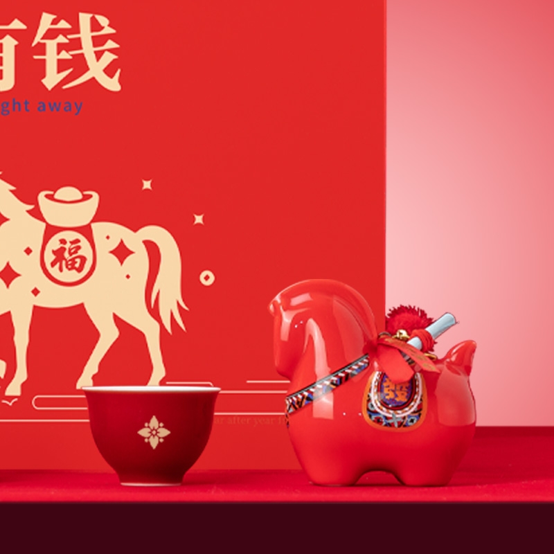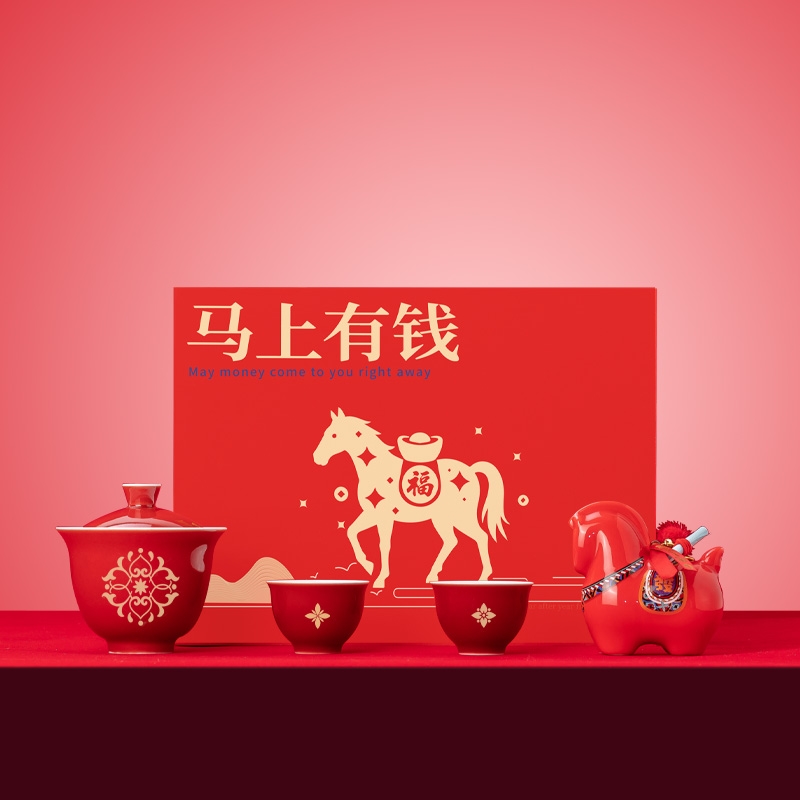 马年生肖主题,“马上有钱” 寓意招财,贺岁送礼佳选;茶具 + 马摆件组合,品茶赏玩一器多能;霁红缠枝莲纹饰,传统工艺显高级质感;茶具 + 摆件 + 贺卡,礼品配置丰富又贴心;马年开门红礼品,商务亲友馈赠心意之选