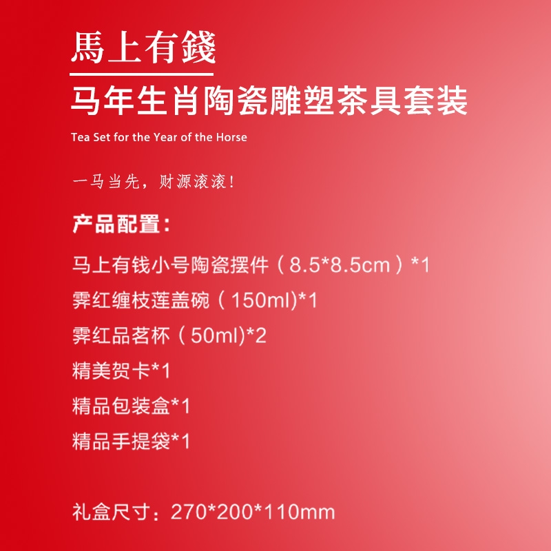 配置清单:马上有钱小号陶瓷摆件(8.5*8.5cm)*1 霁红缠枝莲盖碗(150ml)*1 霁红品茗杯(50ml)*2 精美贺卡*1 精品包装盒*1 精品手提袋*1