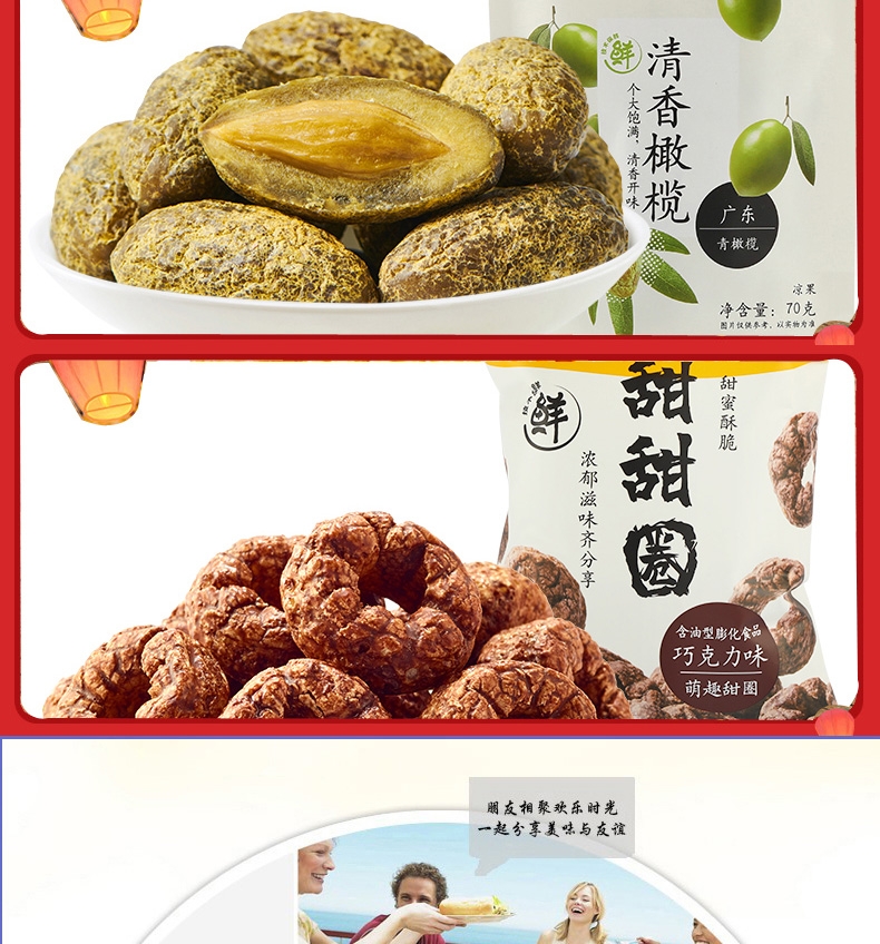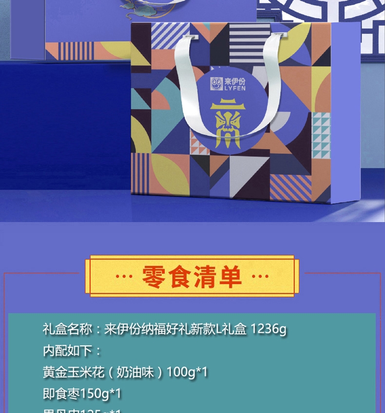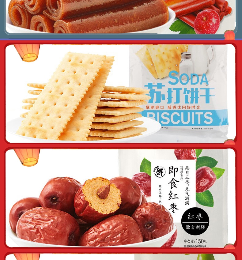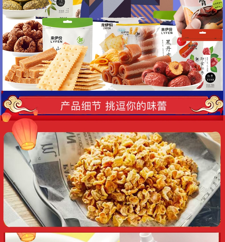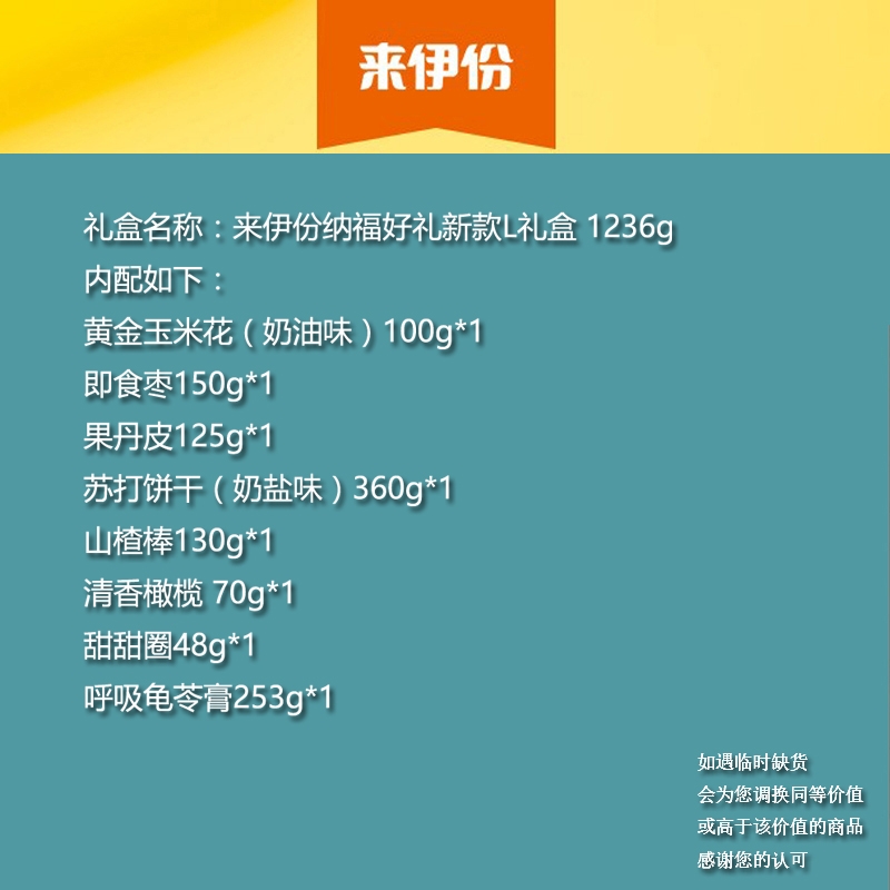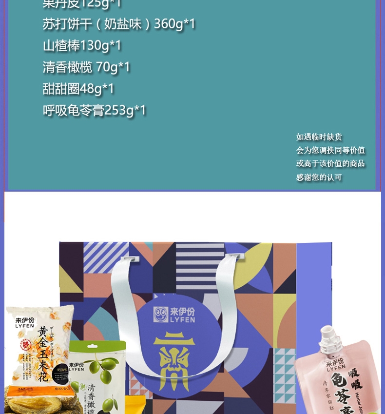 配置:黄金玉米花(奶油味)100g*1 即食枣150g*1 果丹皮125g*1 苏打饼干(奶盐味)360g*1 山楂棒130g*1 清香橄榄 70g*1 甜甜圈48g*1 呼吸龟苓膏253g*1