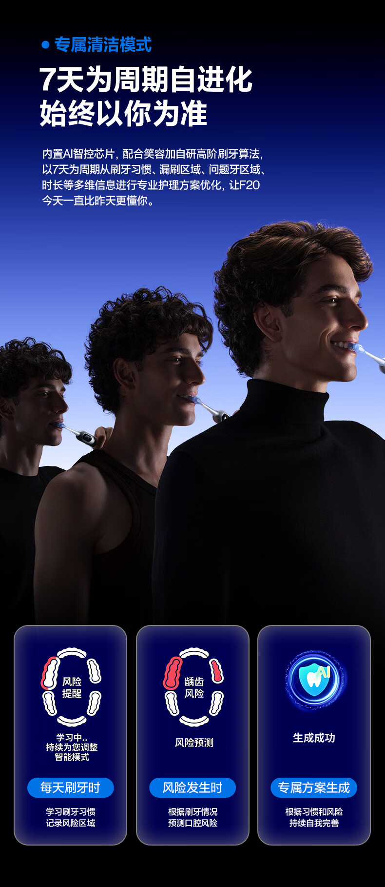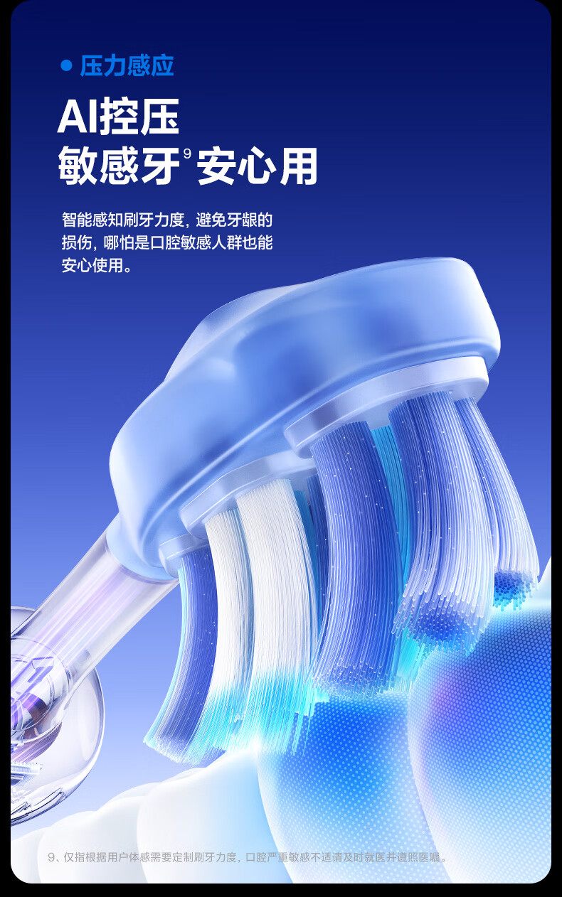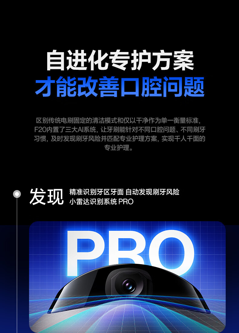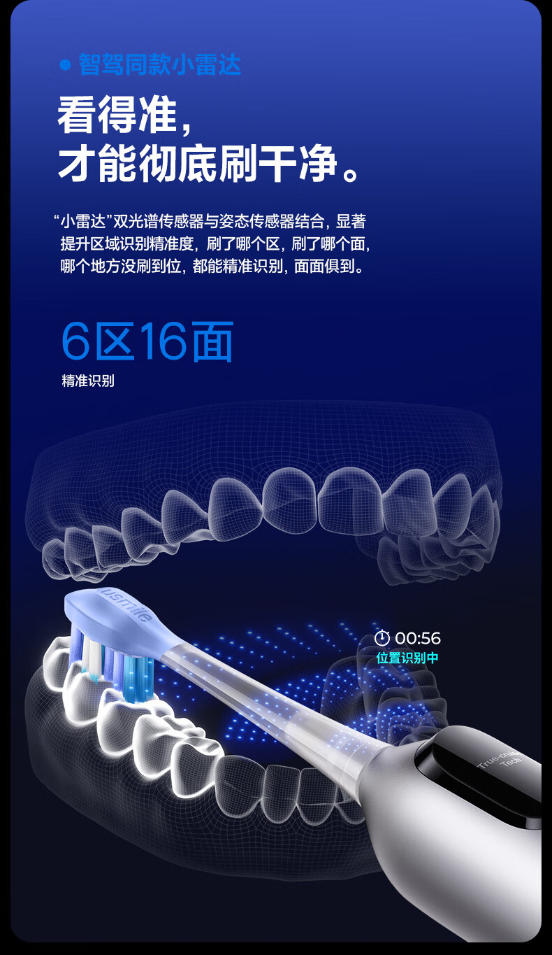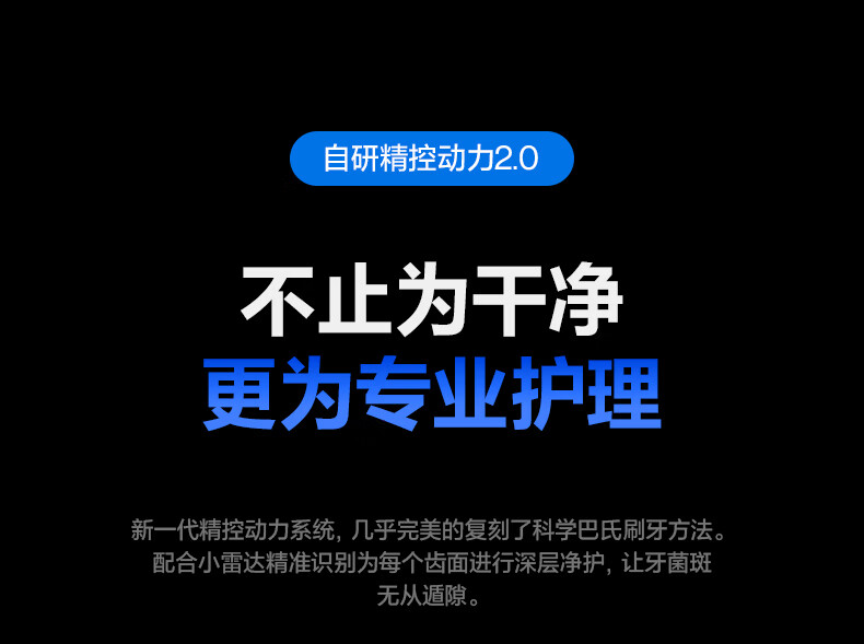 自研蓝鲸™动力系统,去除12倍牙菌斑* ;双光谱雷达精准刷,3.3倍覆盖率*;14000种清洁参数,AI生成专属护理方案