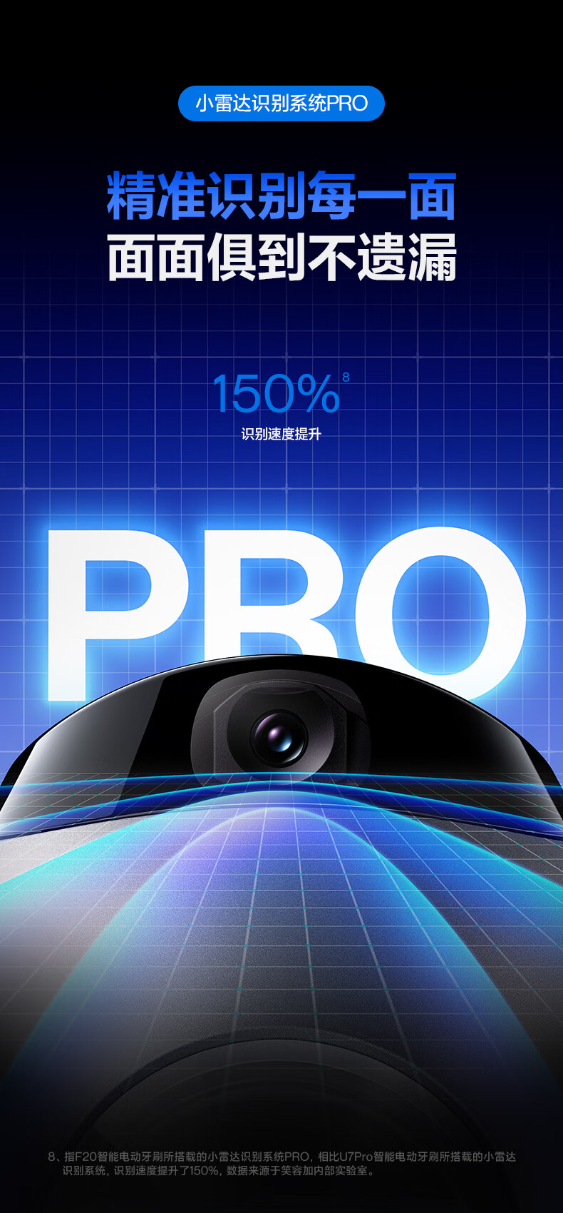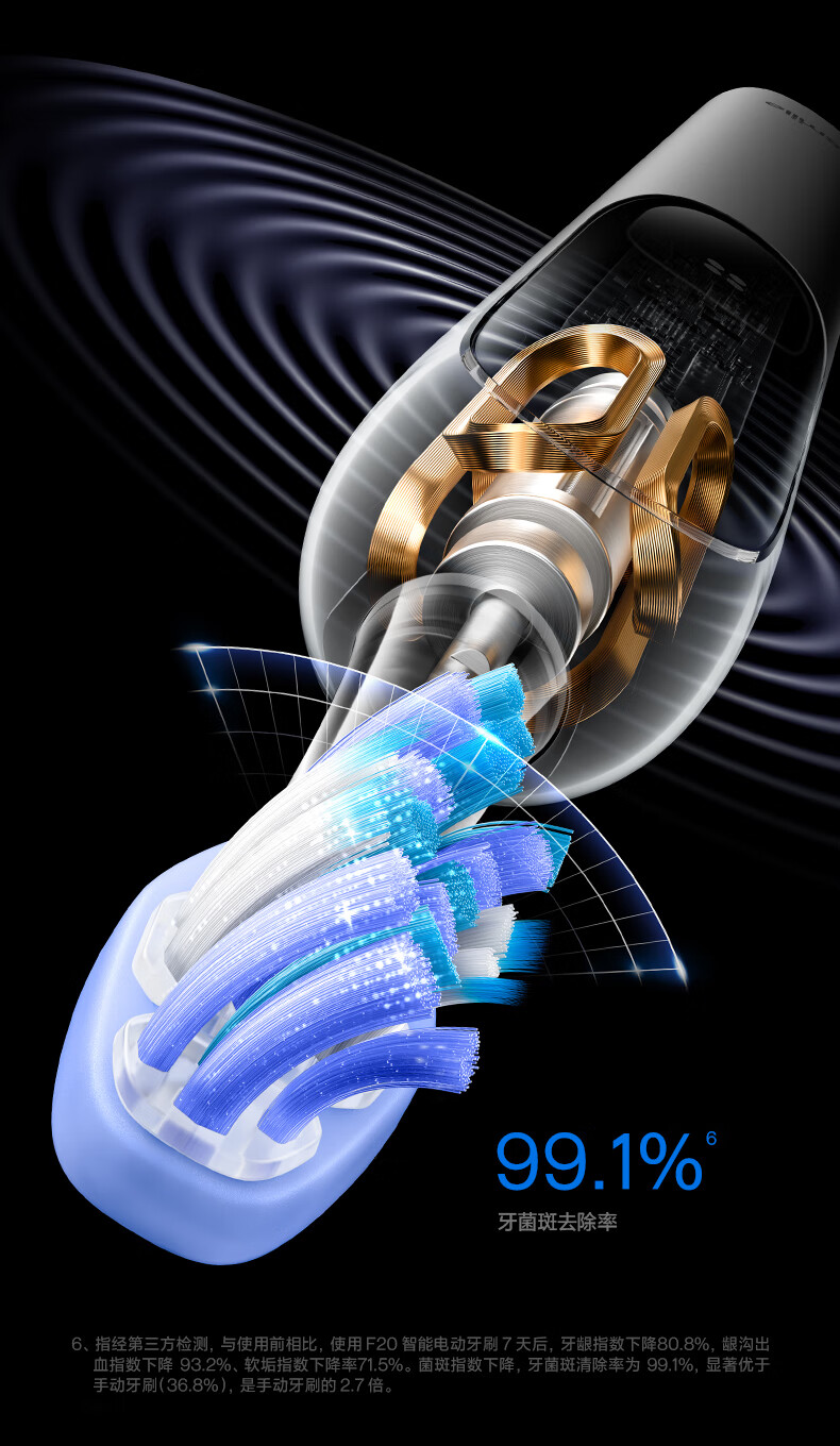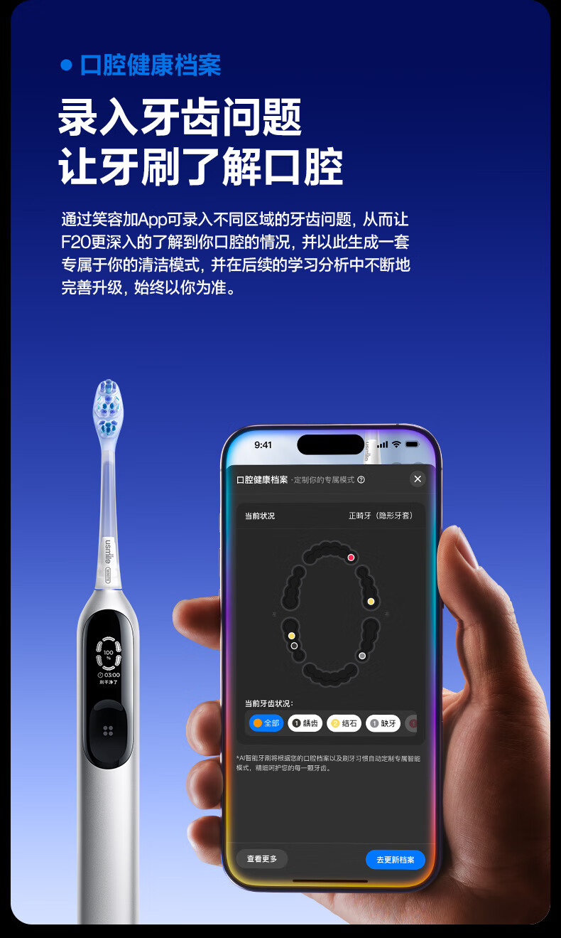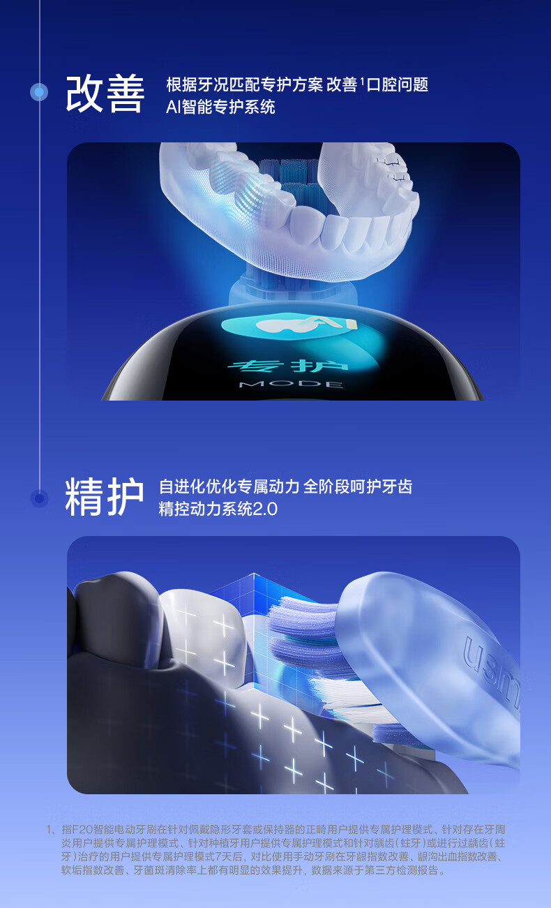 自研蓝鲸™动力系统,去除12倍牙菌斑* ;双光谱雷达精准刷,3.3倍覆盖率*;14000种清洁参数,AI生成专属护理方案