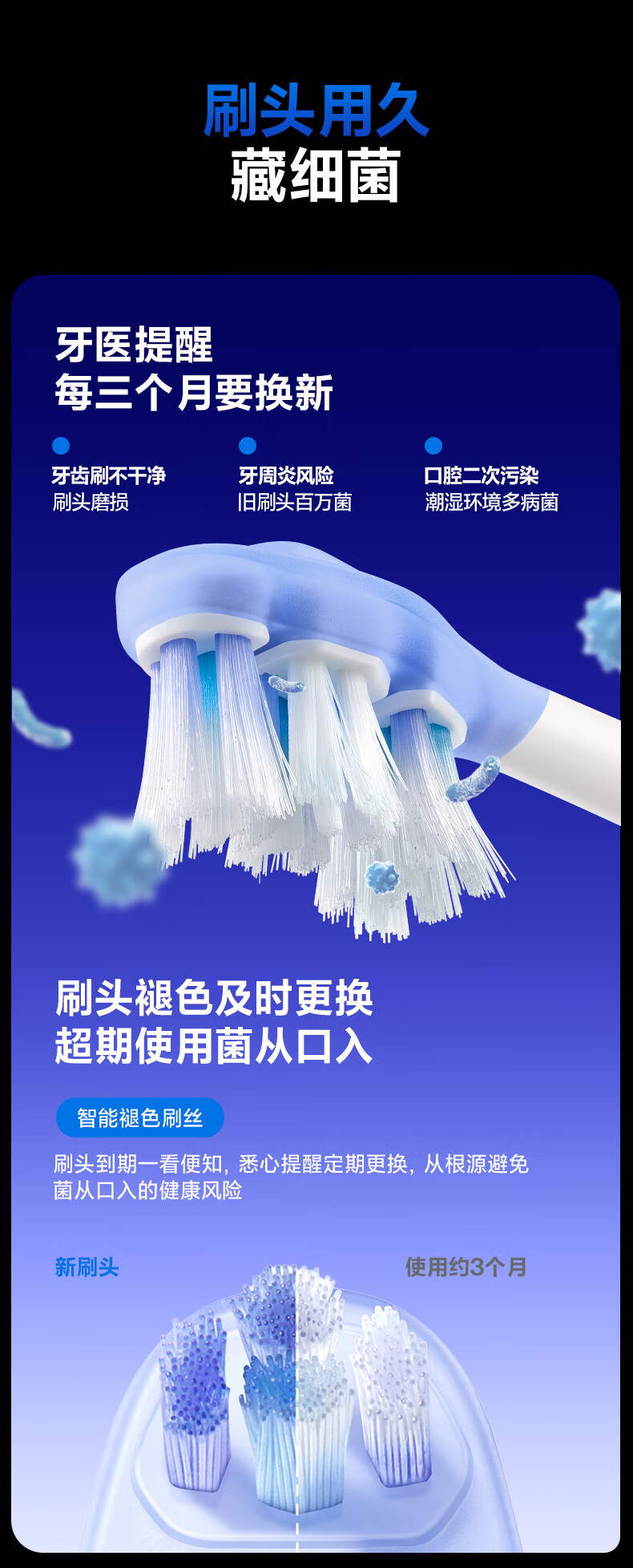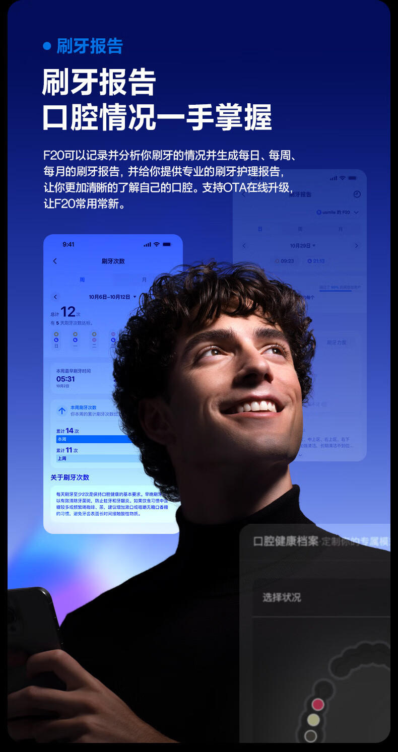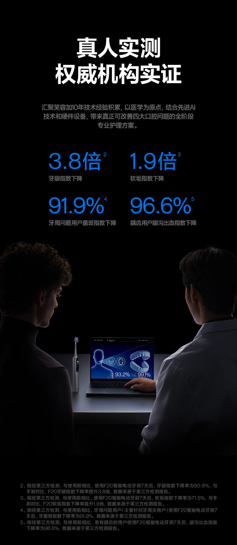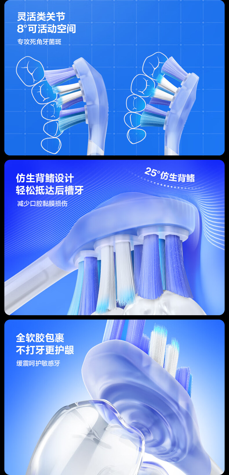 自研蓝鲸™动力系统,去除12倍牙菌斑* ;双光谱雷达精准刷,3.3倍覆盖率*;14000种清洁参数,AI生成专属护理方案