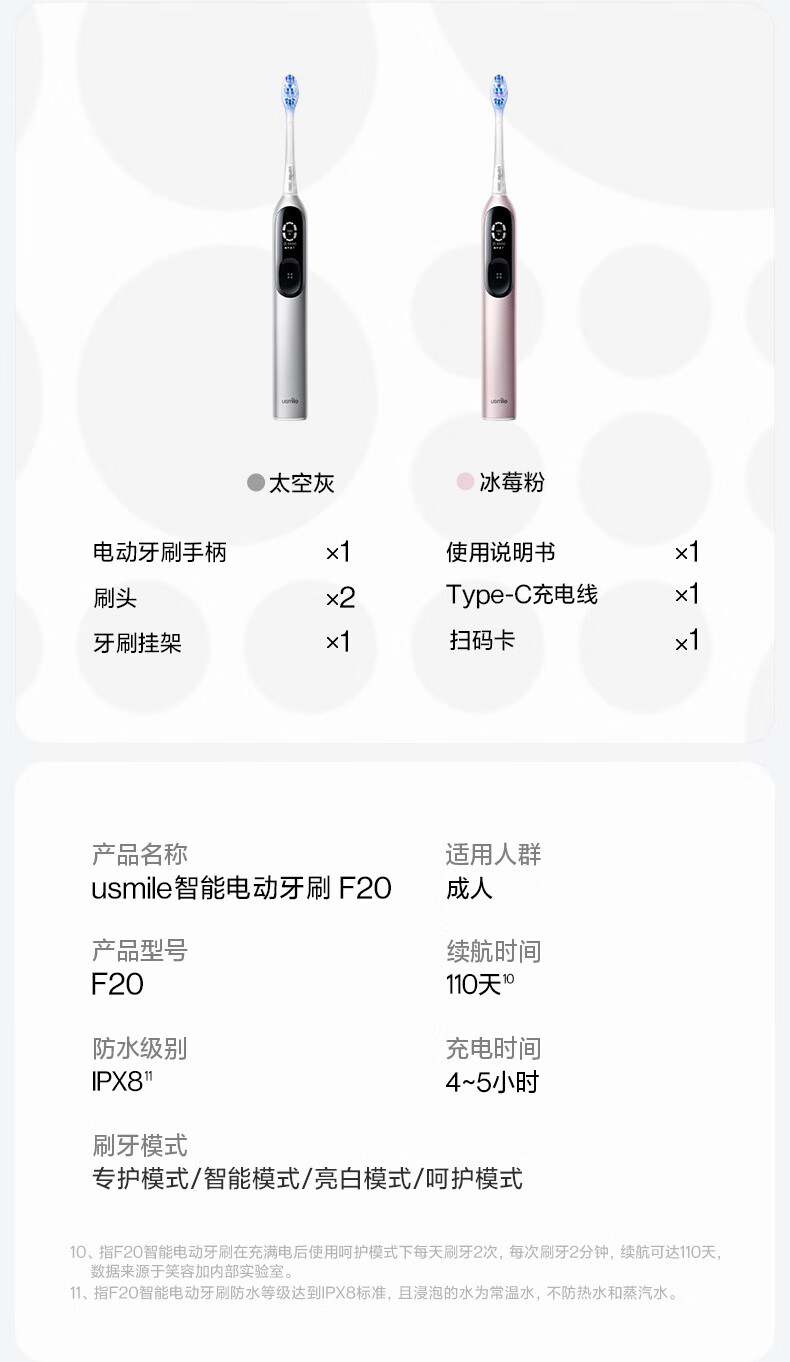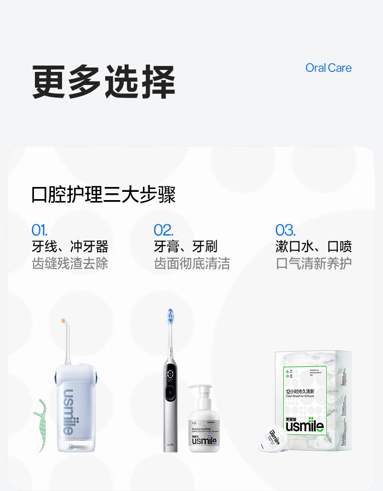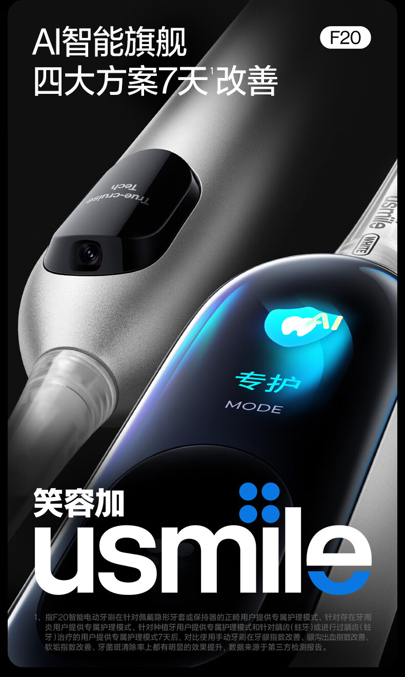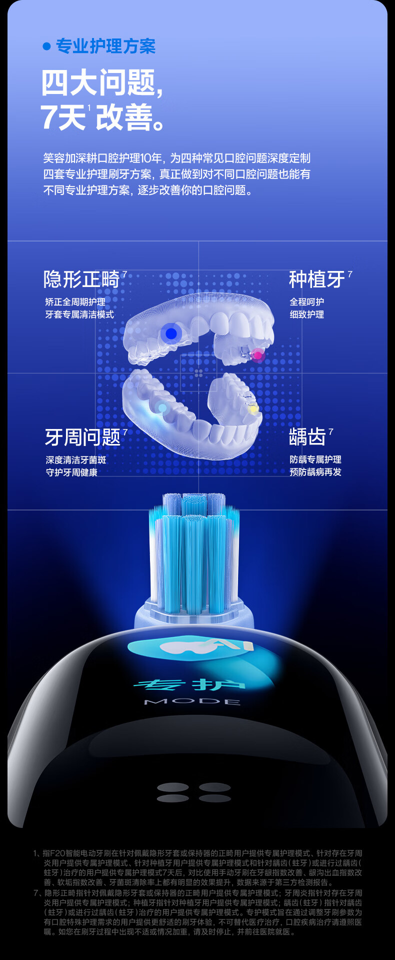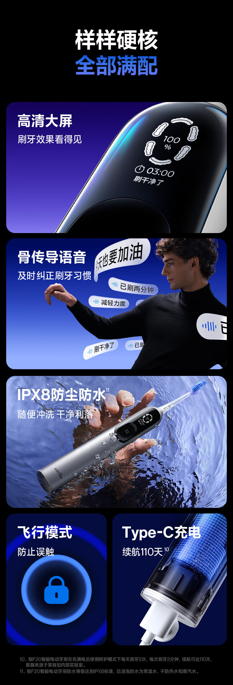 自研蓝鲸™动力系统,去除12倍牙菌斑* ;双光谱雷达精准刷,3.3倍覆盖率*;14000种清洁参数,AI生成专属护理方案