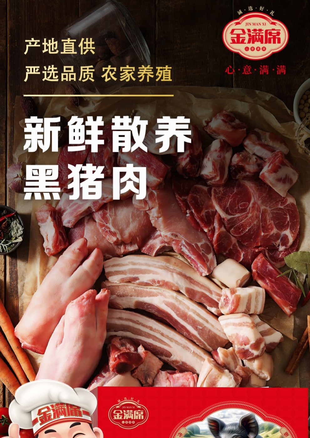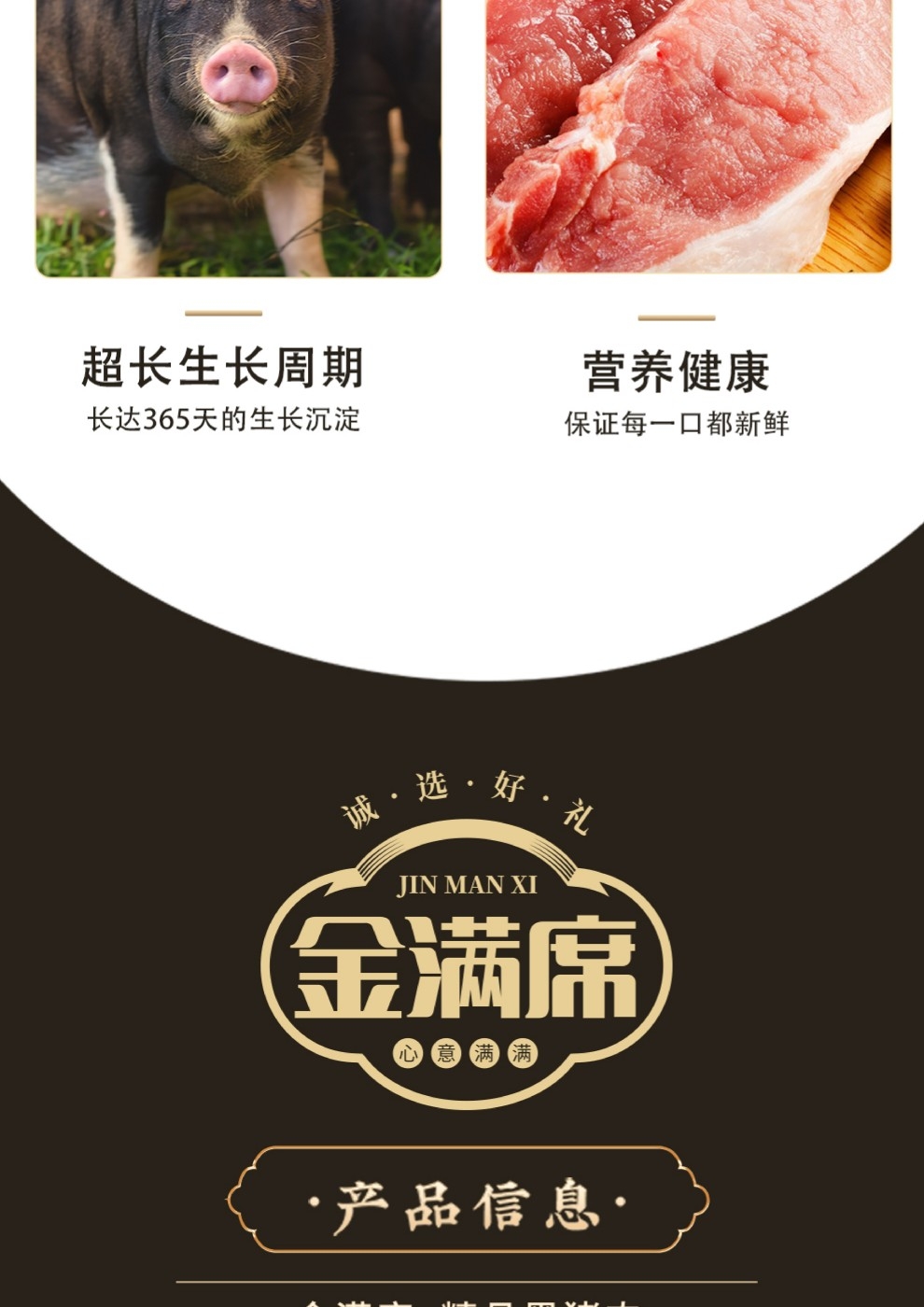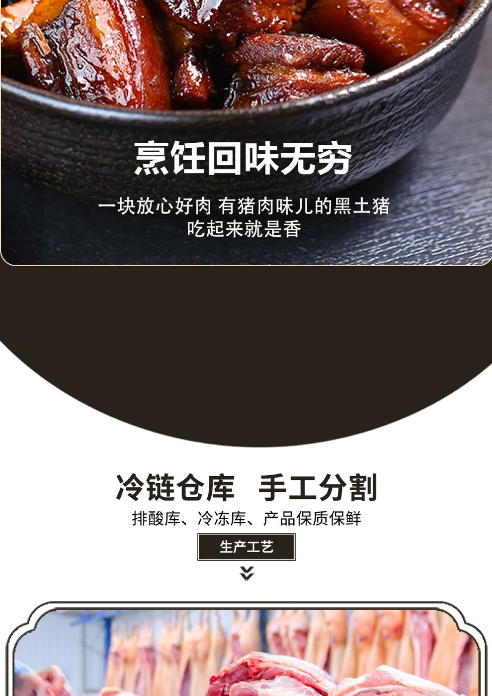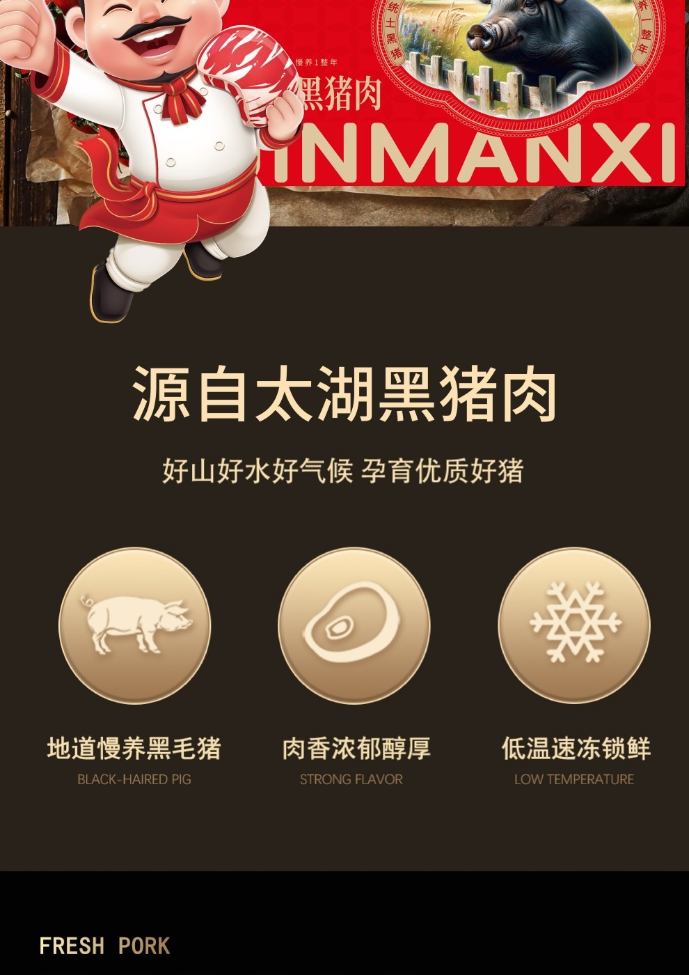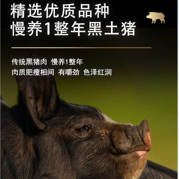 人工育养 带给你最健康纯净猪肉;谷物喂养 不吃饲料的好黑毛猪;超长生长周期 长达365天的生长沉淀
