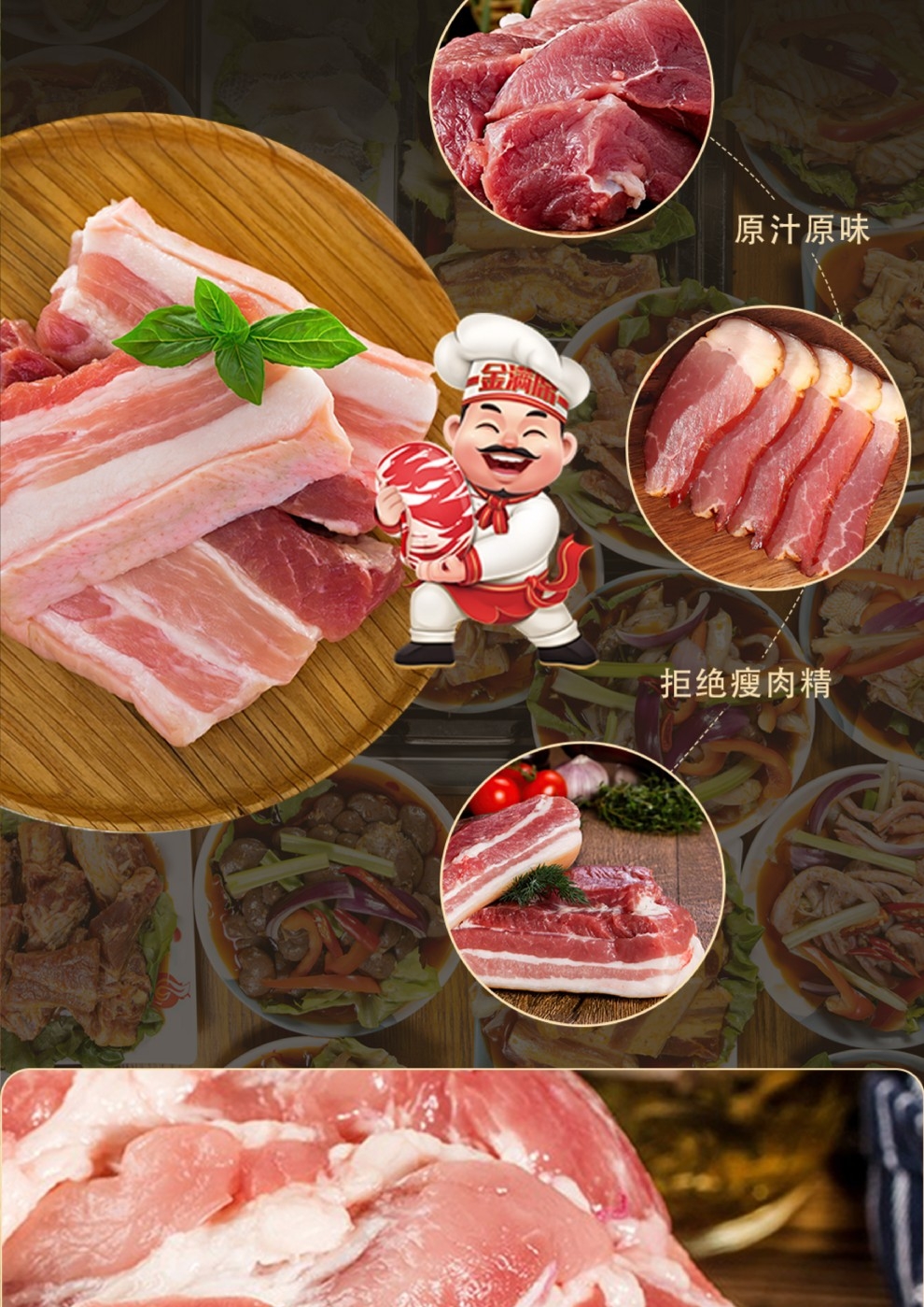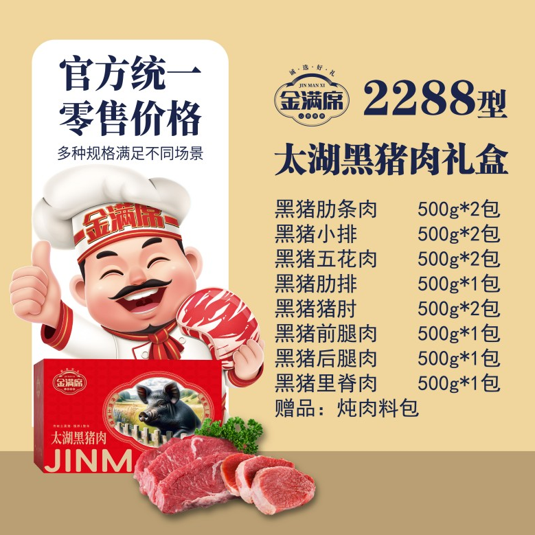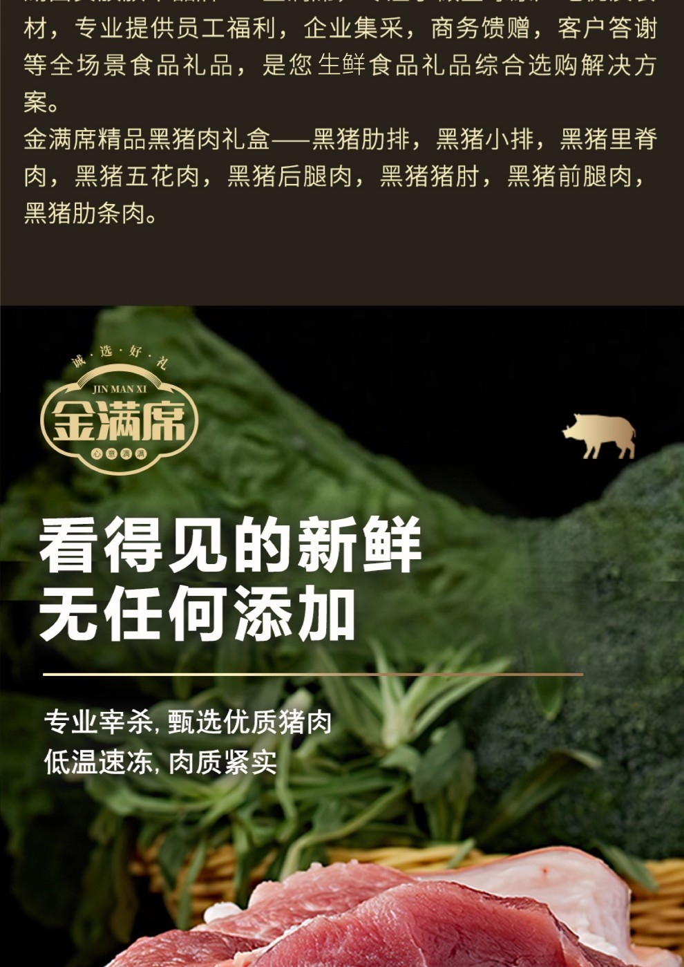 配置清单:1.黑猪肋条肉1000g 2.黑猪小排1000g 3.黑猪五花肉1000g 4.黑猪肋排500g 5.黑猪猪肘1000g 6.黑猪前腿肉500g 7.黑猪后腿肉500g 8.黑猪里脊肉500g 赠品:炖肉料包