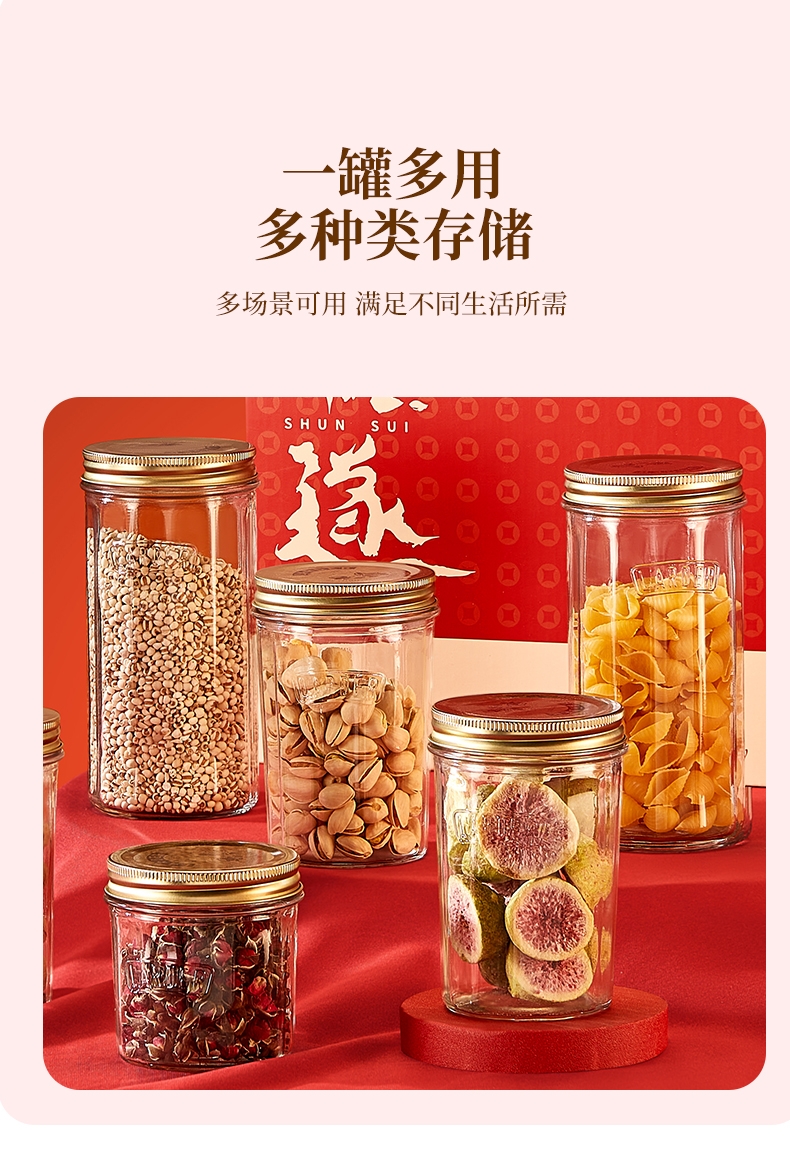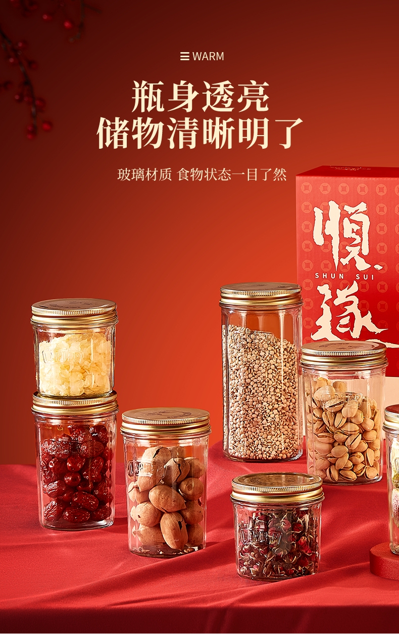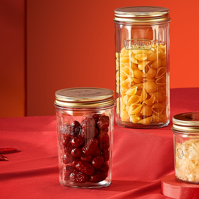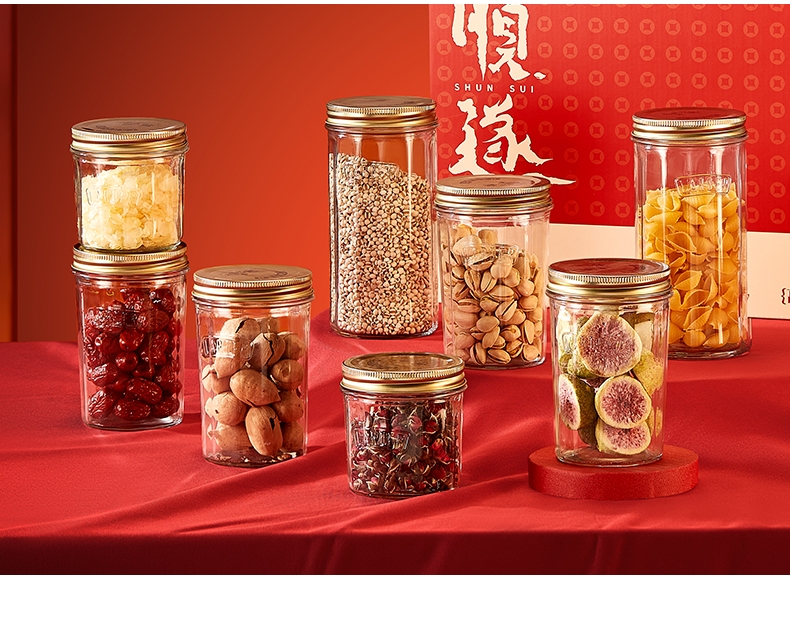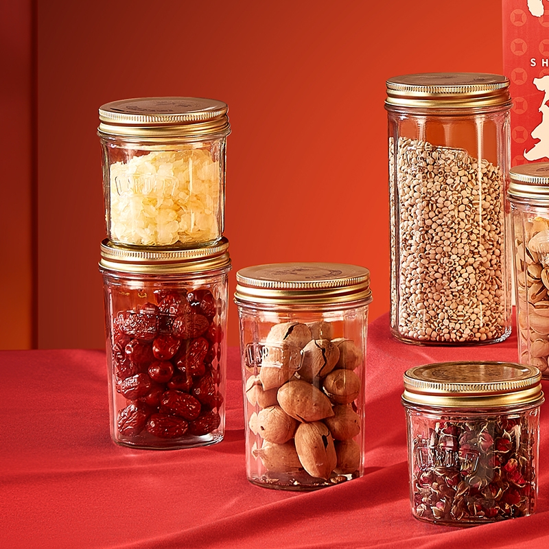 采用高透光无铅玻璃瓶身,无毒无异味;可直接接触食材,符合健康饮食需求;古铜色马口铁螺纹防滑盖+棱纹金属质感