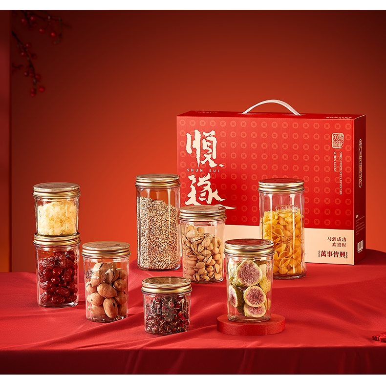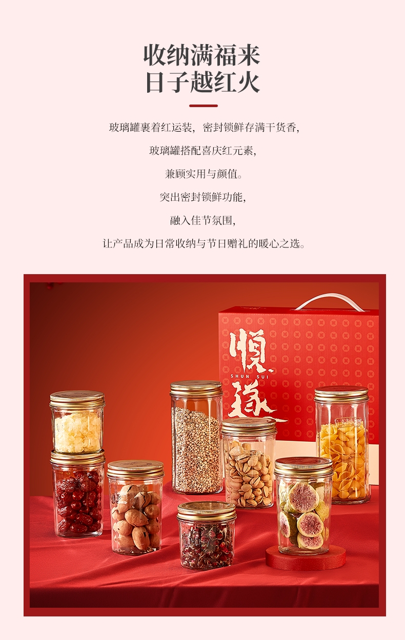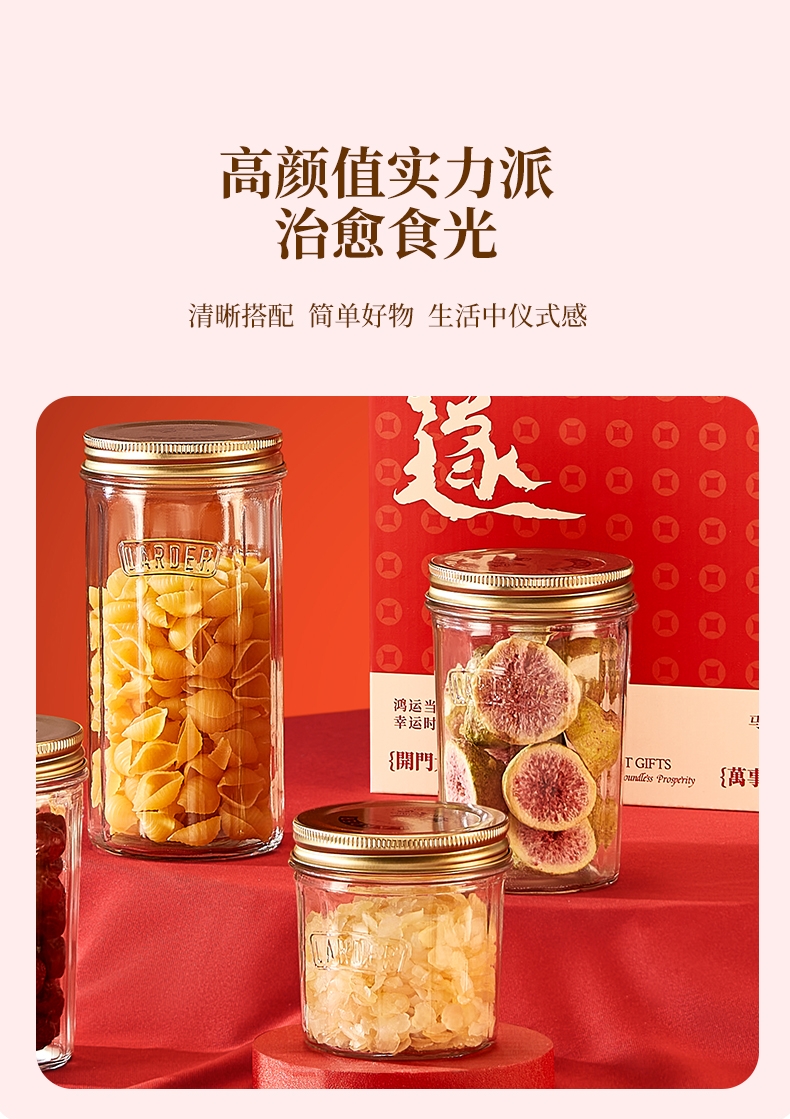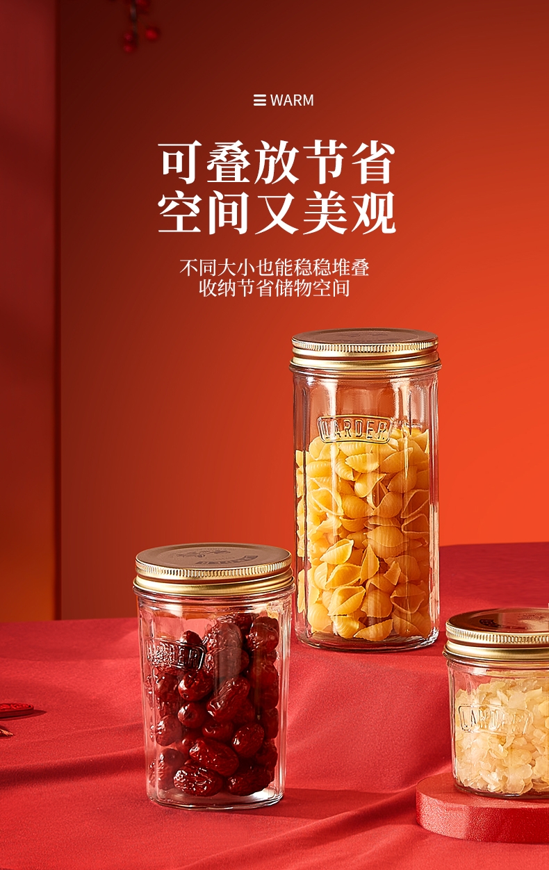 采用高透光无铅玻璃瓶身,无毒无异味;可直接接触食材,符合健康饮食需求;古铜色马口铁螺纹防滑盖+棱纹金属质感