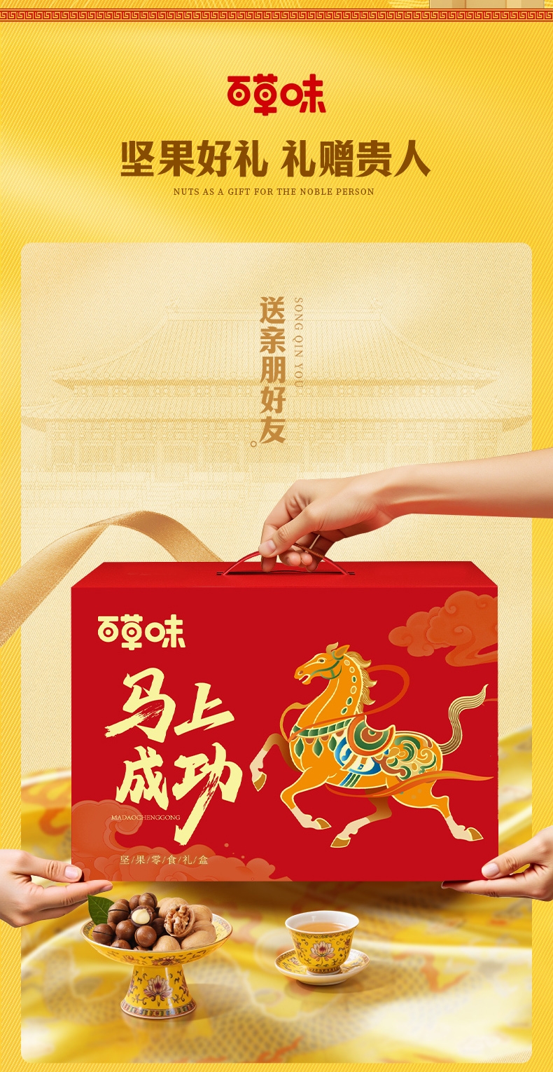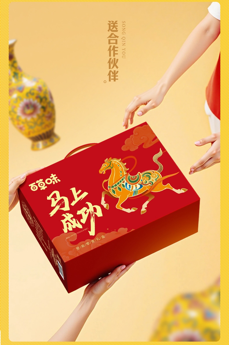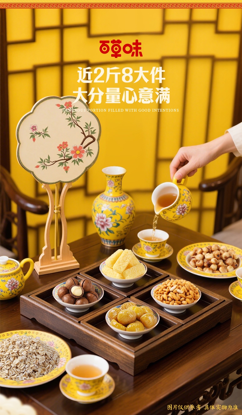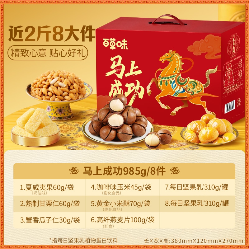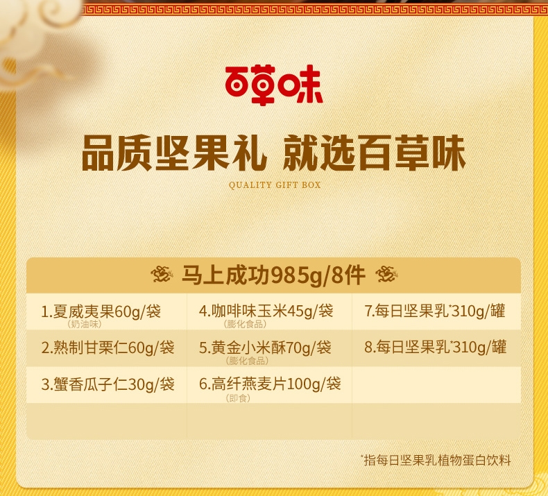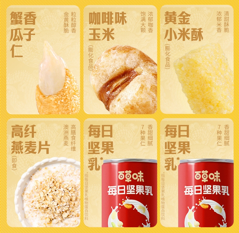 配置:【百草味】夏威夷果(奶油味) 60g 【百草味】熟制板栗仁 60g 【百草味】蟹香瓜子仁30g 【百草味】咖啡味玉米45g 【百草味】黄金小米酥(膨化食品)70g 【百草味】燕麦片(原味)100g 【百草味】每日坚果乳 310g 【百草味】每日坚果乳 310g