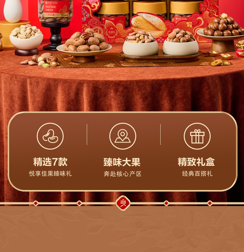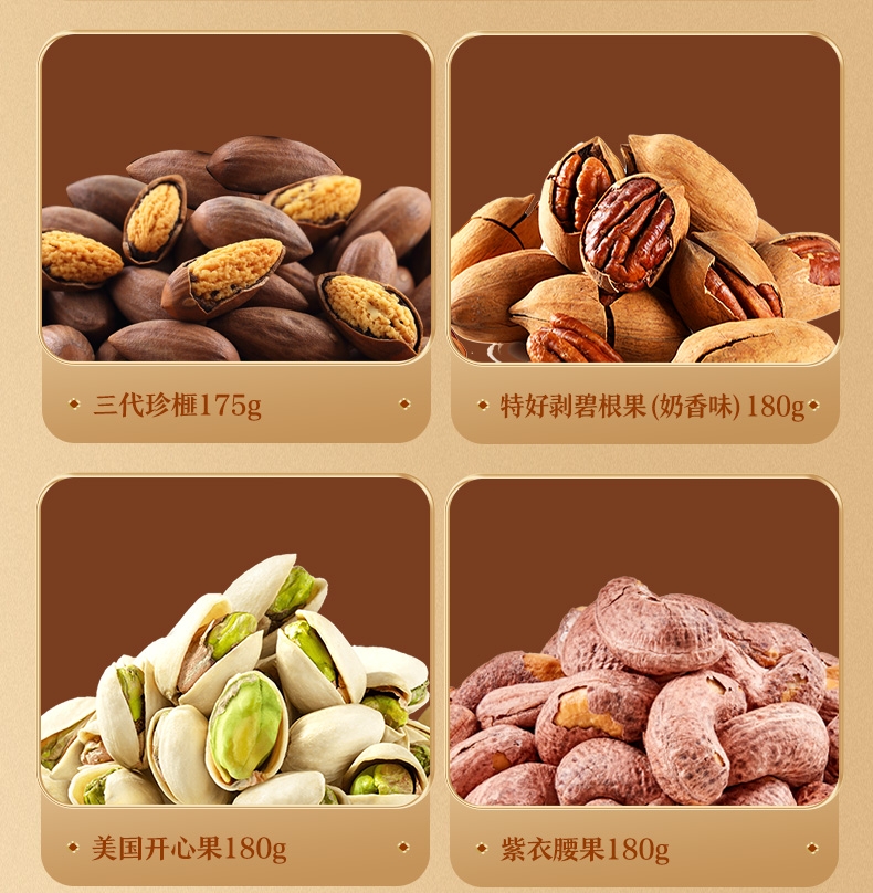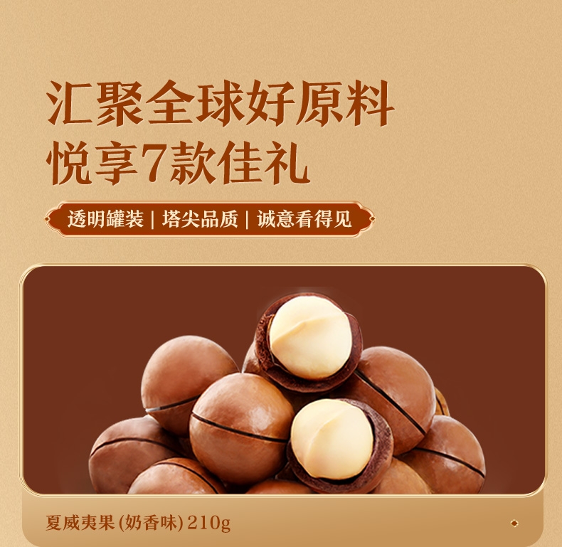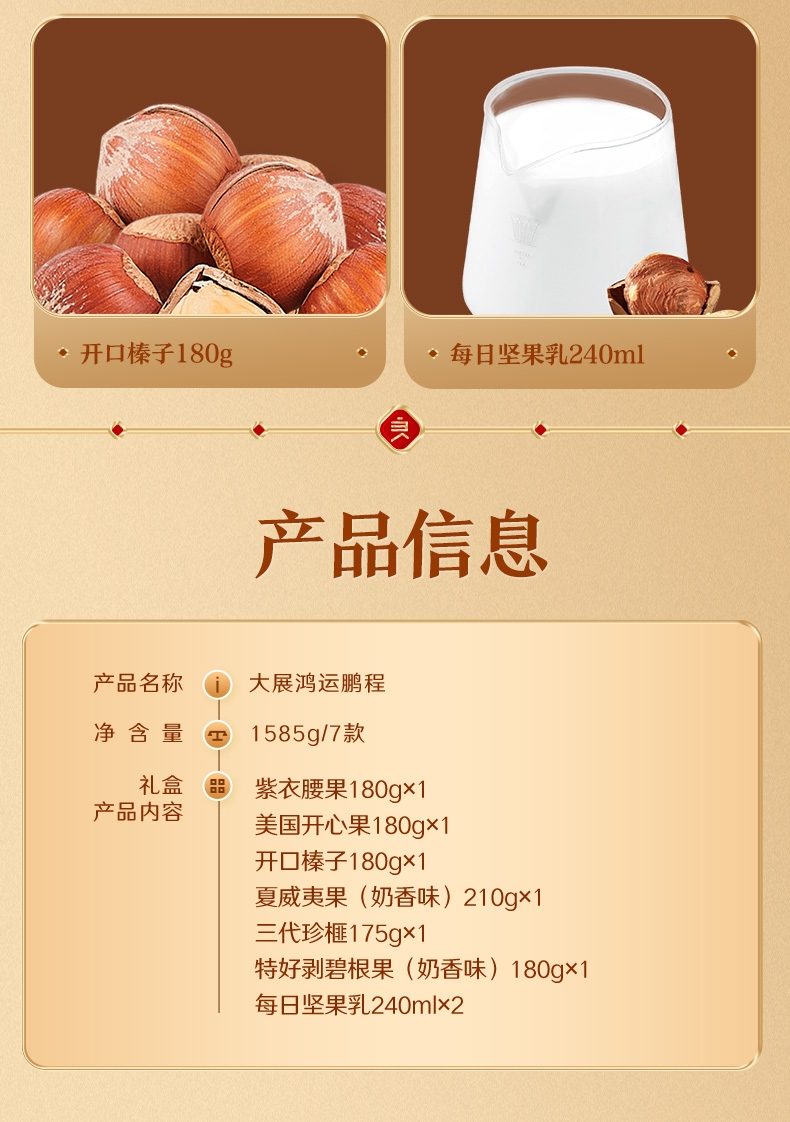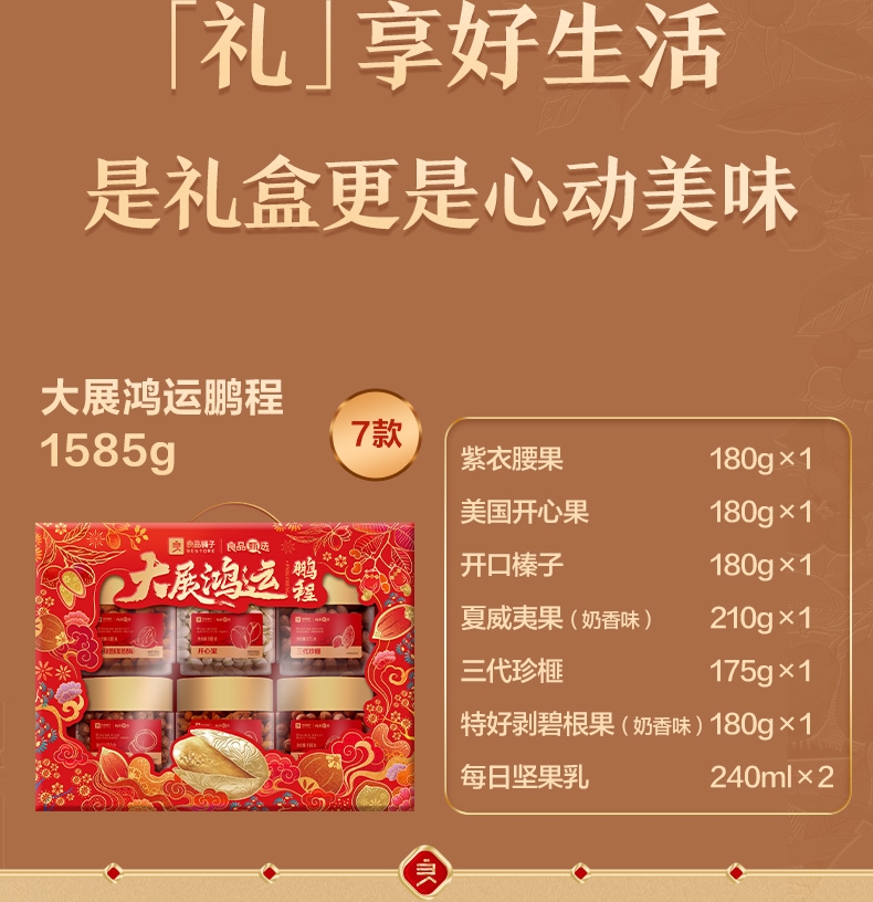 内配:紫衣腰果180g(扁罐) 美国开心果180g(扁罐) 开口榛子180g(扁罐) 夏威夷果(奶香味)210g(扁罐) 三代珍榧175g(扁罐) 特好剥碧根果(奶香味)180g(扁罐) 每日坚果乳240ml*2