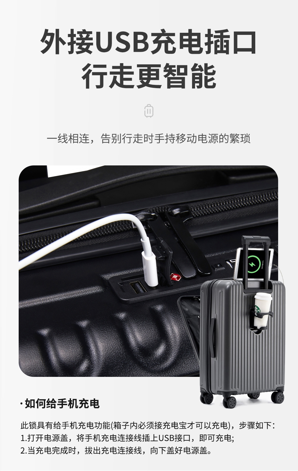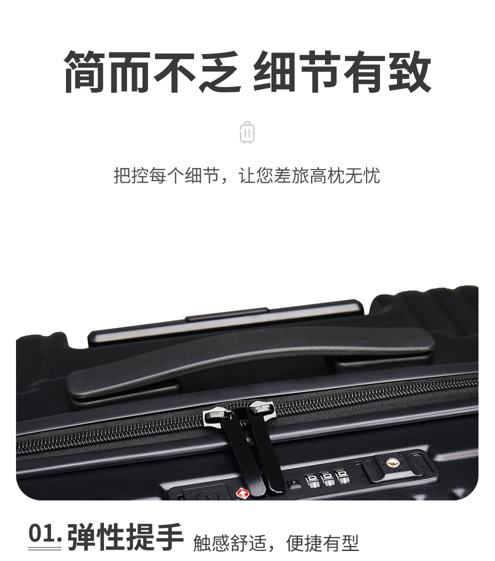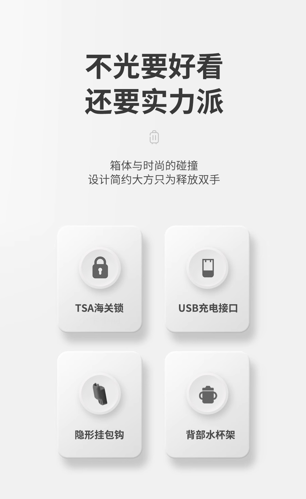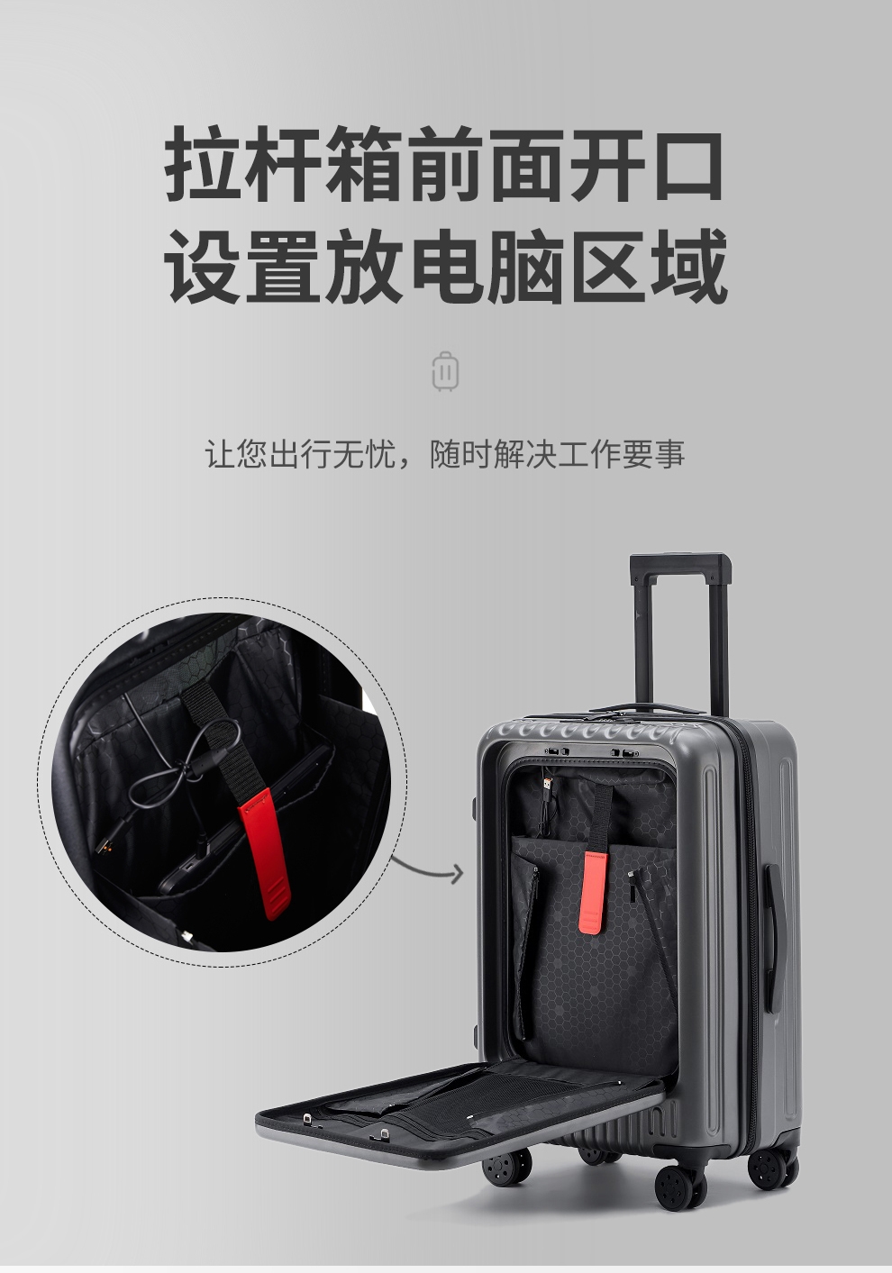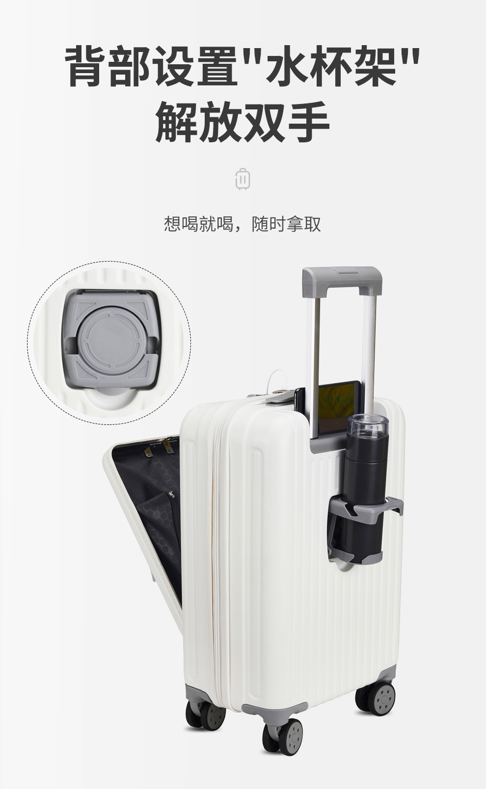 行李箱前开口设计,前置空间可放办公用品包括笔记本;方便随时拿取;侧面脚垫设置隐形挂包钩,背部设置了水杯架