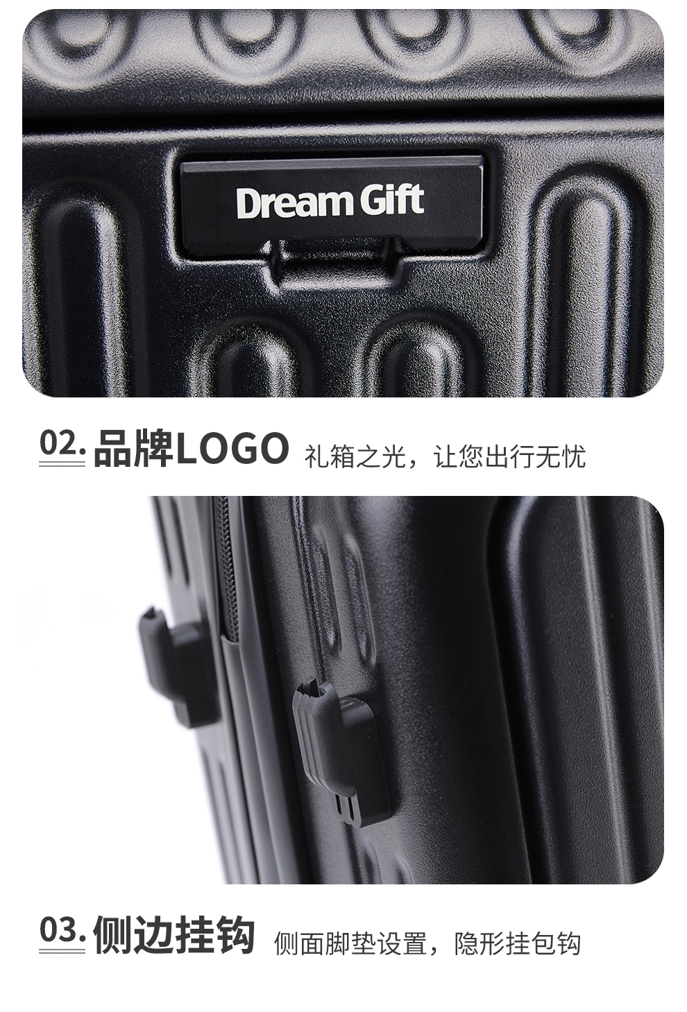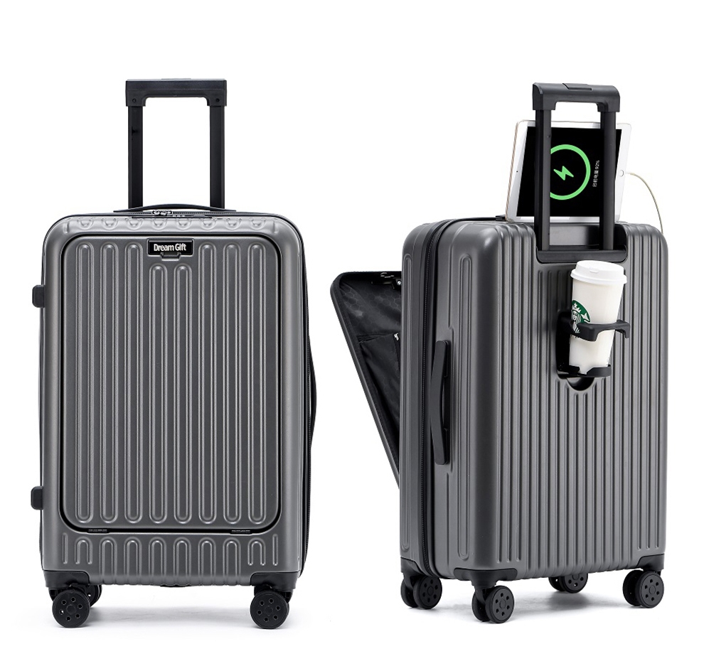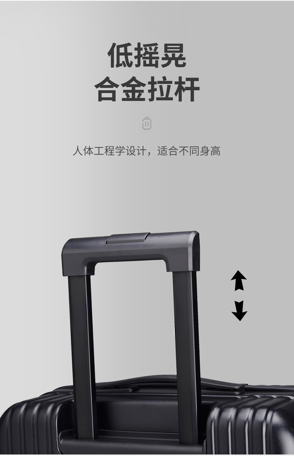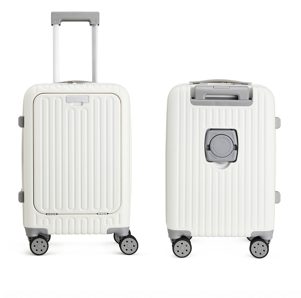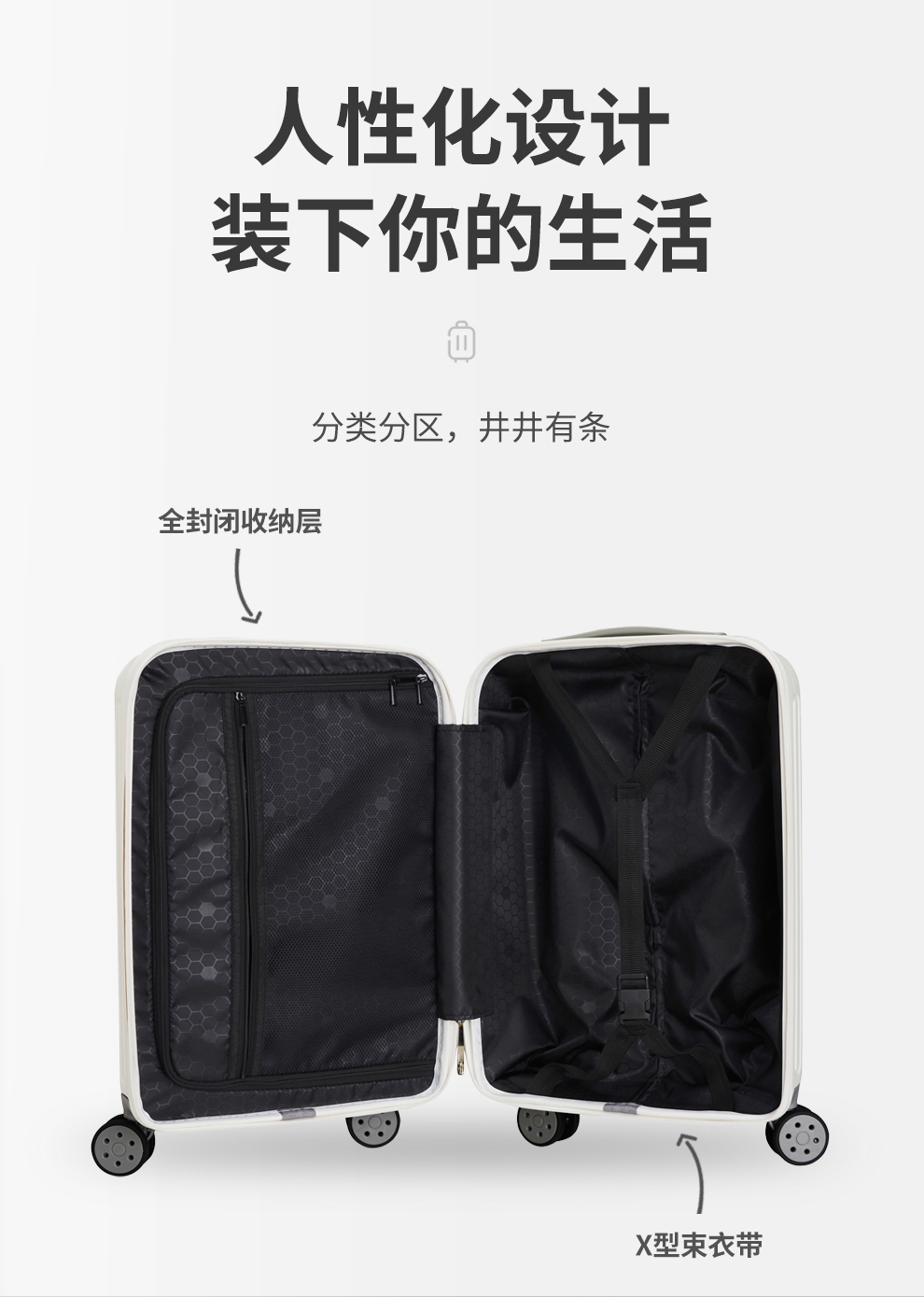行李箱前开口设计,前置空间可放办公用品包括笔记本;方便随时拿取;侧面脚垫设置隐形挂包钩,背部设置了水杯架