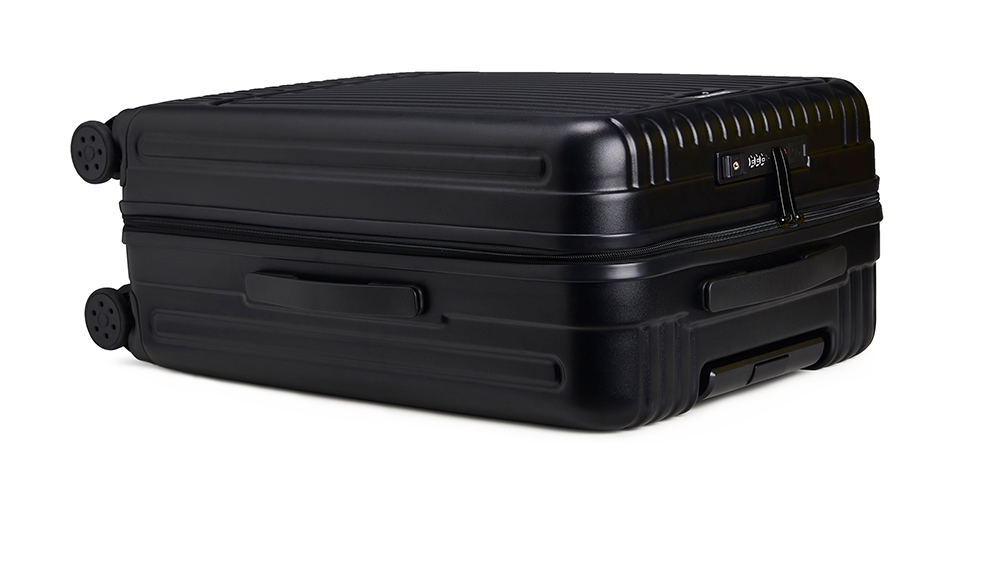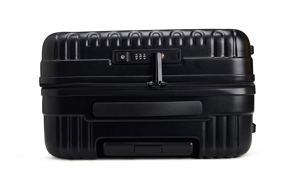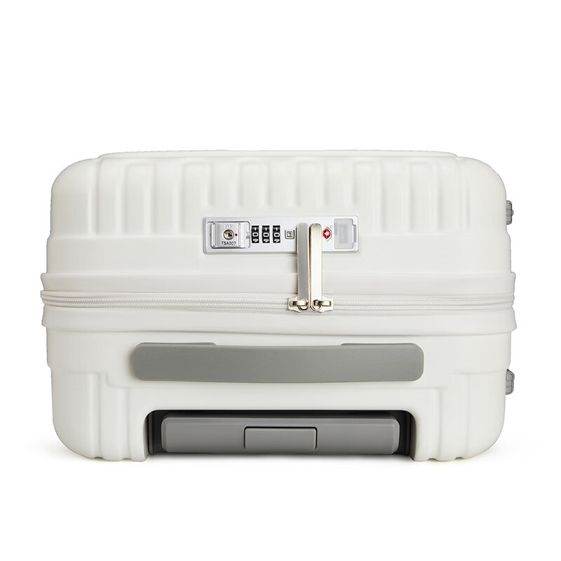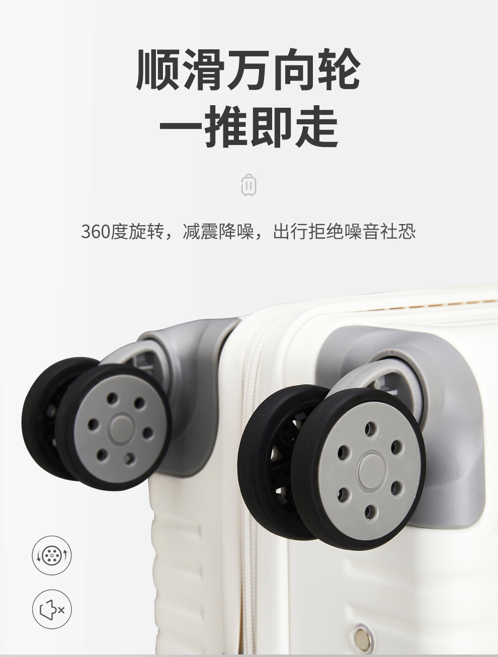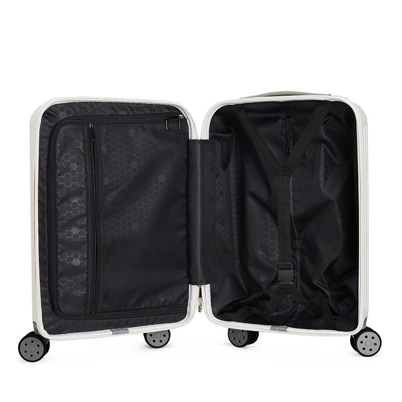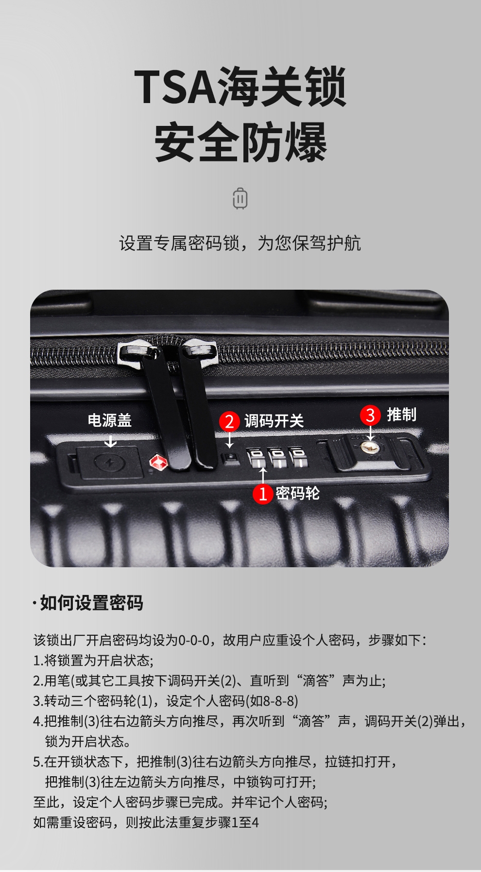 行李箱前开口设计,前置空间可放办公用品包括笔记本;方便随时拿取;侧面脚垫设置隐形挂包钩,背部设置了水杯架