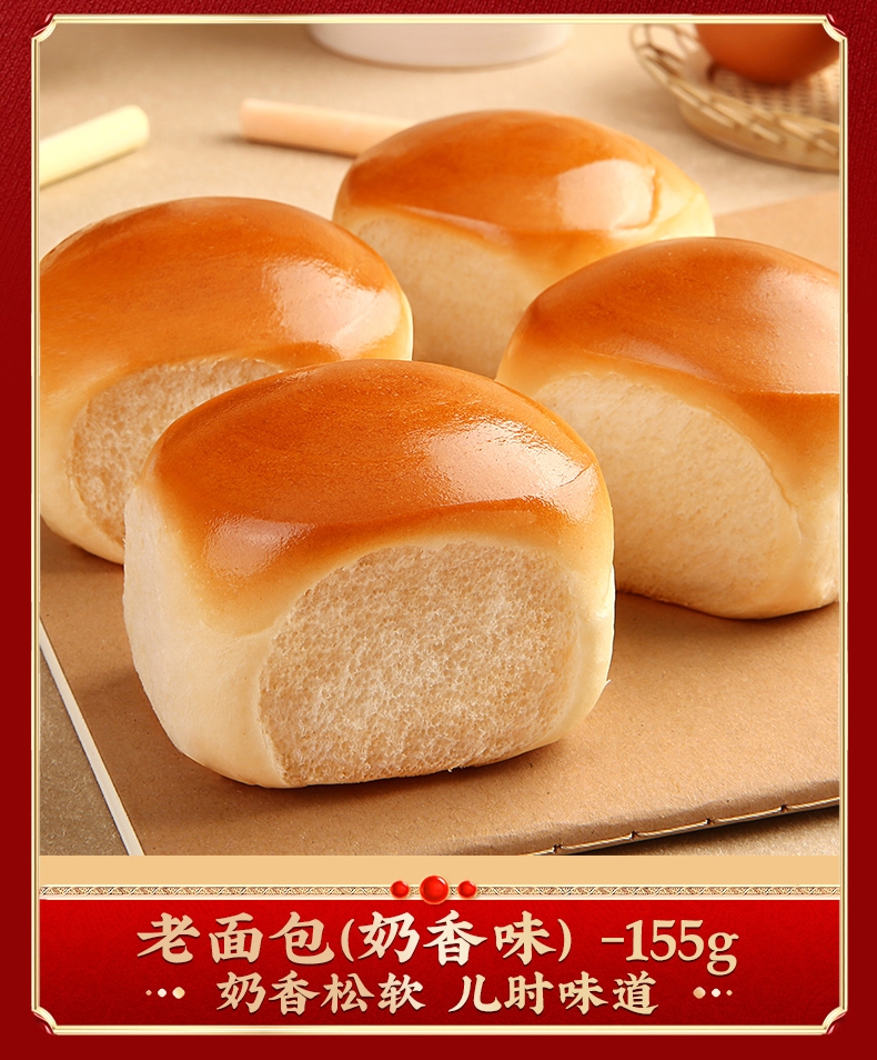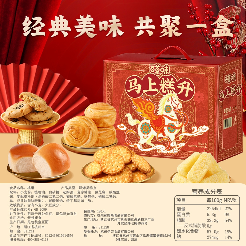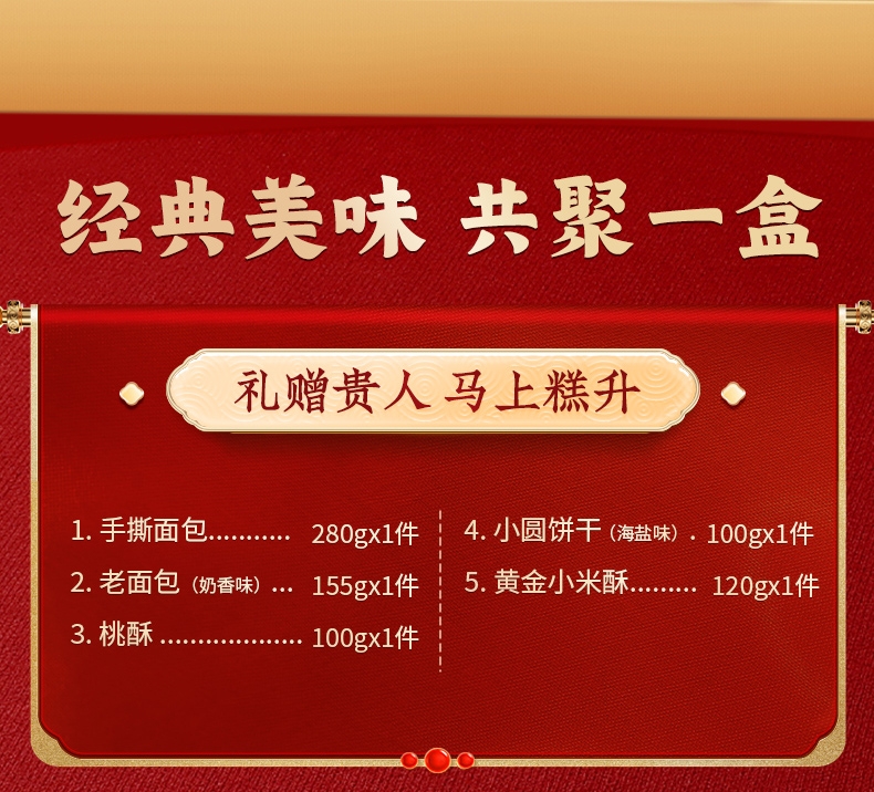配置:【百草味】手撕面包 280g 【百草味】老面包(奶香味)155g 【百草味】桃酥100g 【百草味】小圆饼干 100g(海盐味) 【百草味】小小酥120g