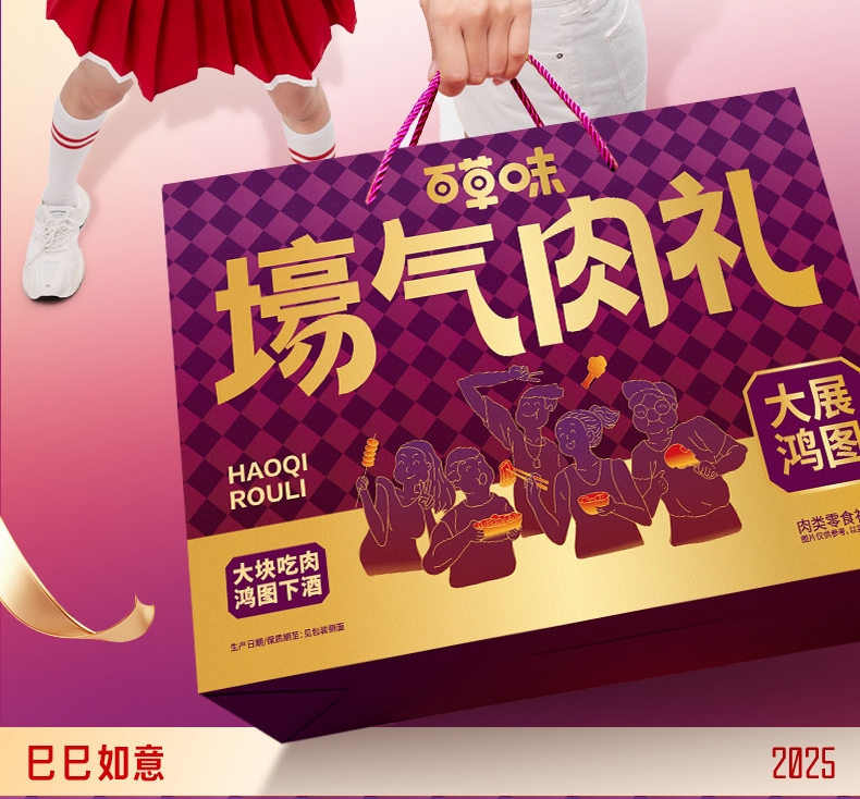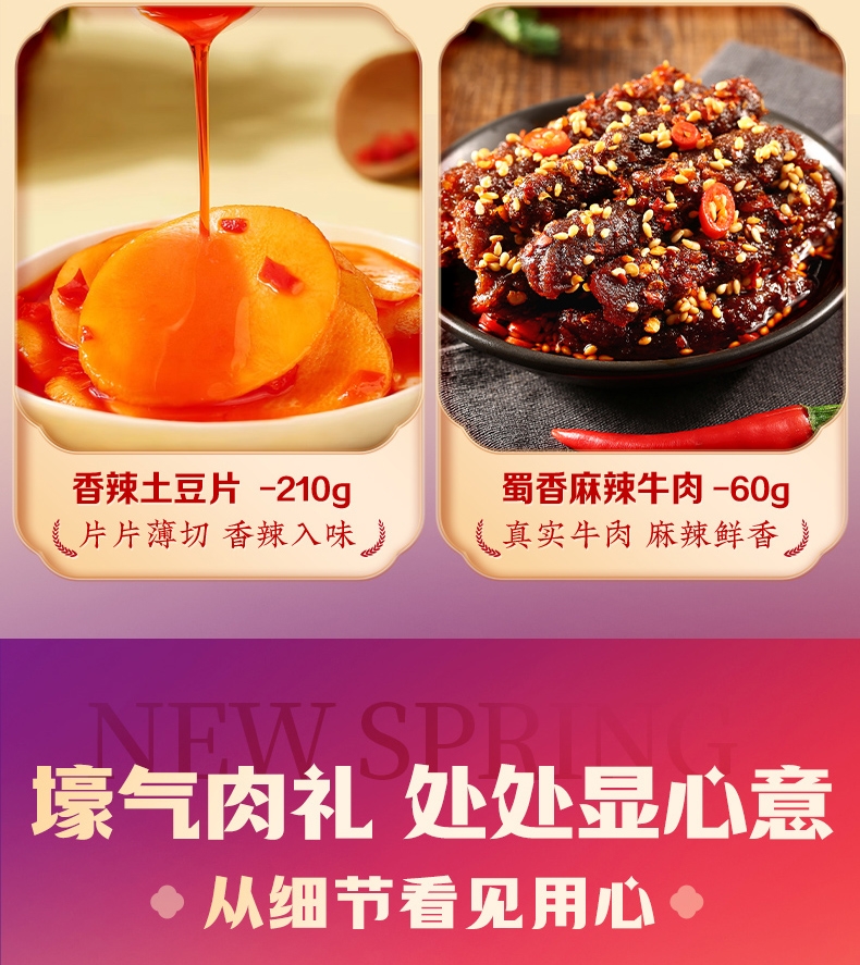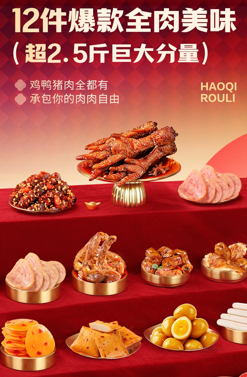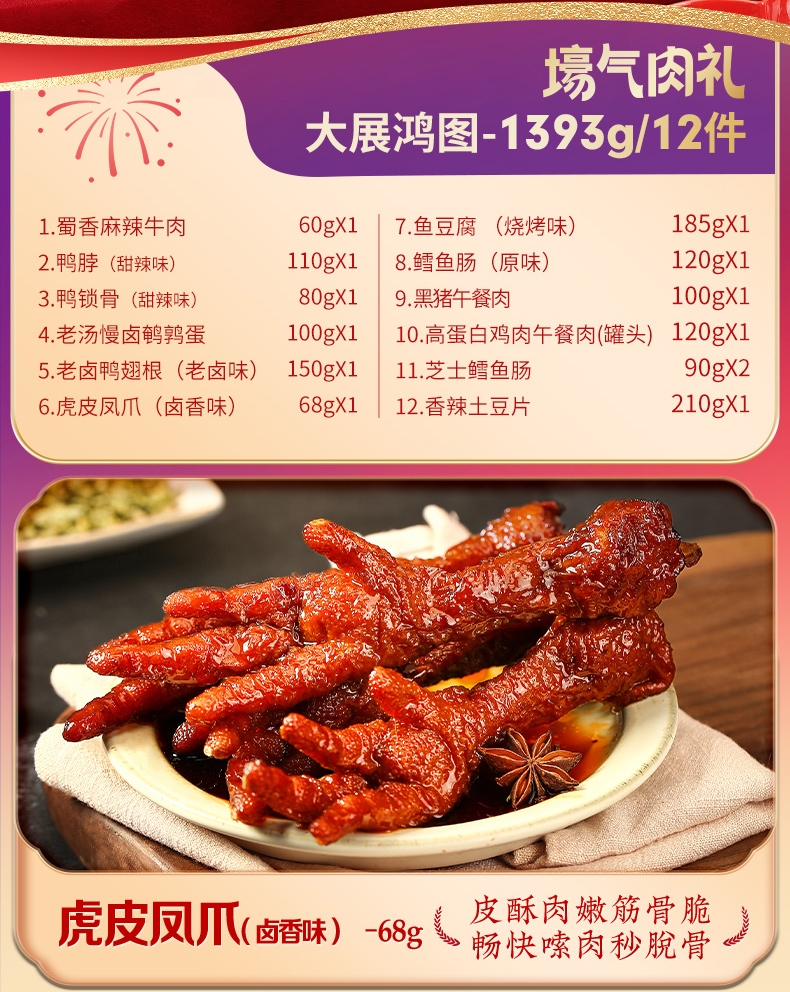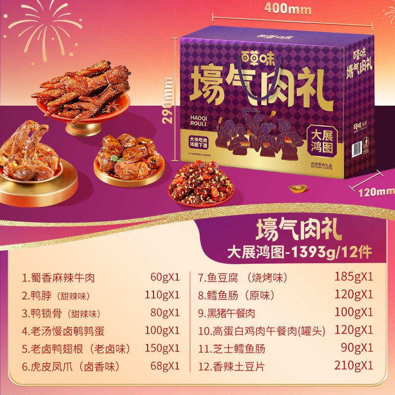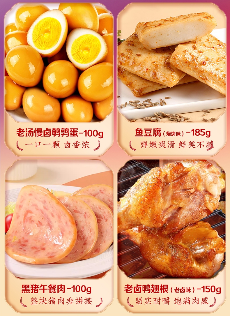 配置:【百草味】蜀香麻辣牛肉60g 【百草味】鸭脖 110g(甜辣味) 【百草味】鸭锁骨(甜辣味)80g 【百草味】老汤慢卤鹌鹑蛋-100g 【百草味】老卤鸭翅根(老卤味)150g 【百草味】虎皮凤爪(卤香味)68g 【百草味】鱼豆腐 185g(烧烤味) 【百草味】鳕鱼肠(原味)120g 【百草味】黑猪午餐肉100g 【百草味】高蛋白鸡肉午餐肉(罐头)120g 【百草味】芝士鳕鱼肠 90g 【百草味】香辣土豆片 210g