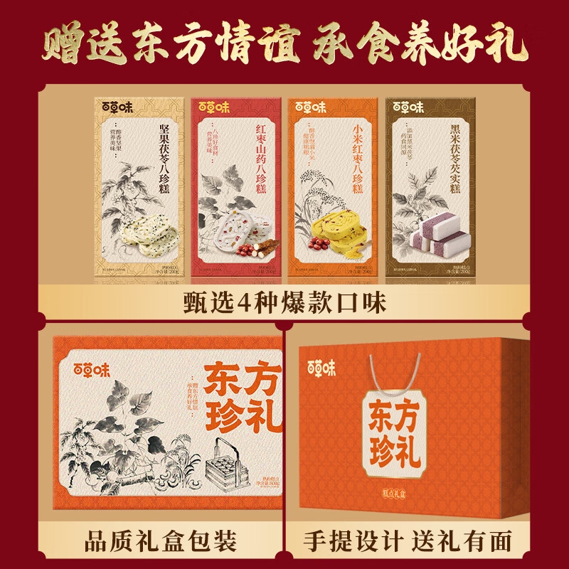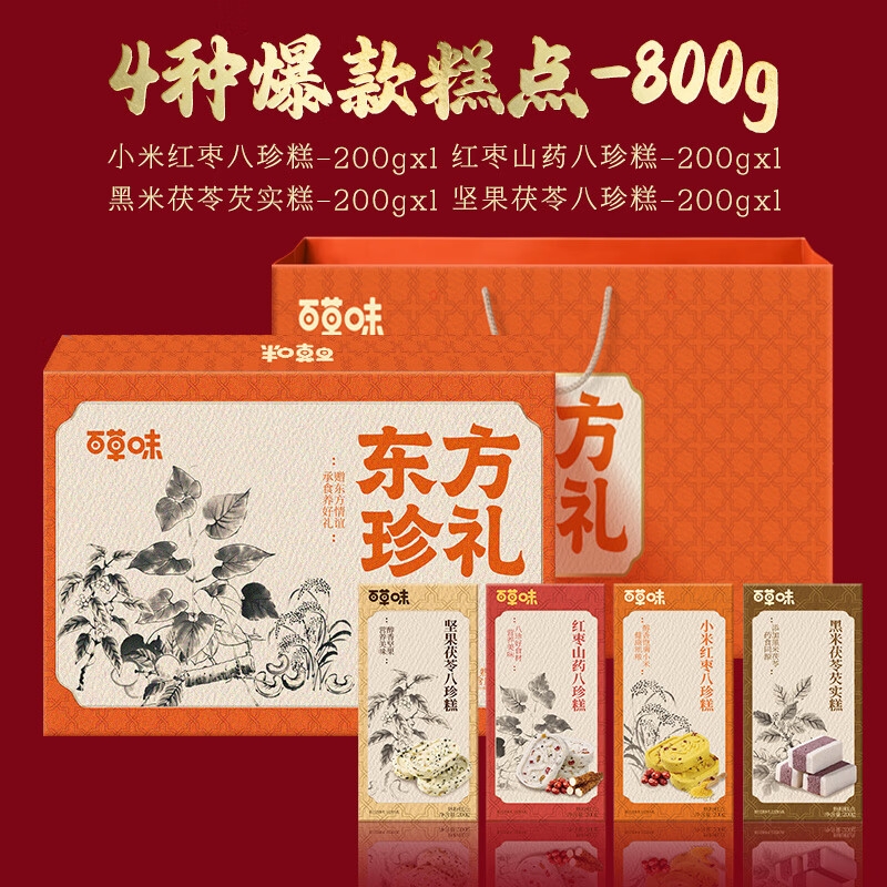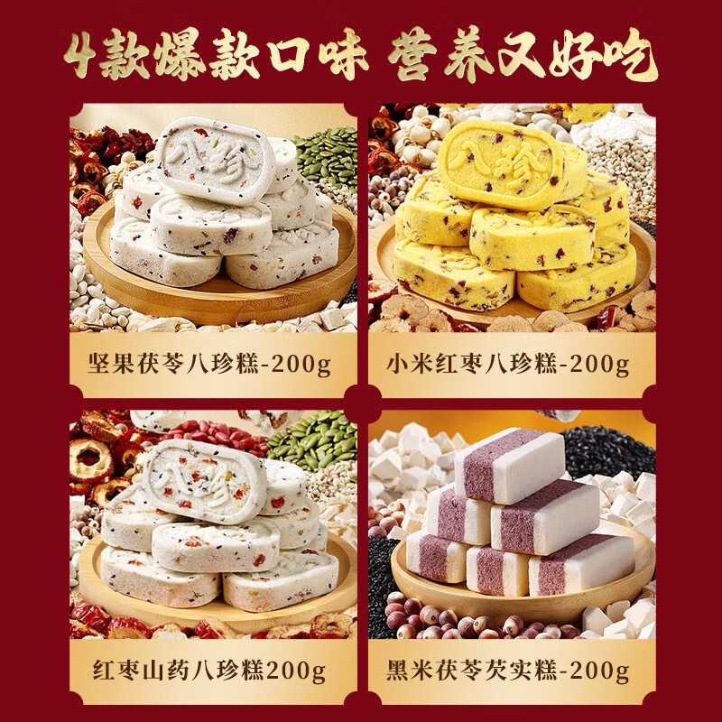 配置:【百草味】坚果茯苓八珍糕200g 【百草味】红枣山药八珍糕200g 【百草味】小米红枣八珍糕200g 【百草味】黑米茯苓芡实糕200g