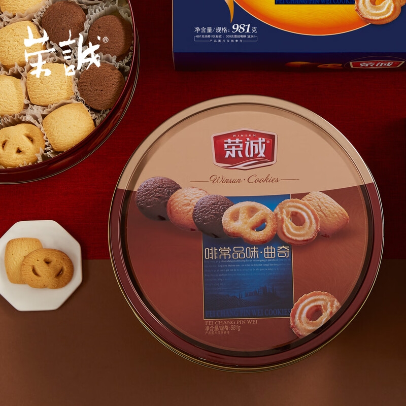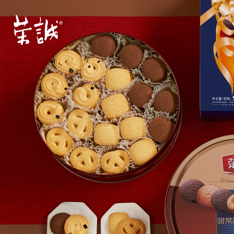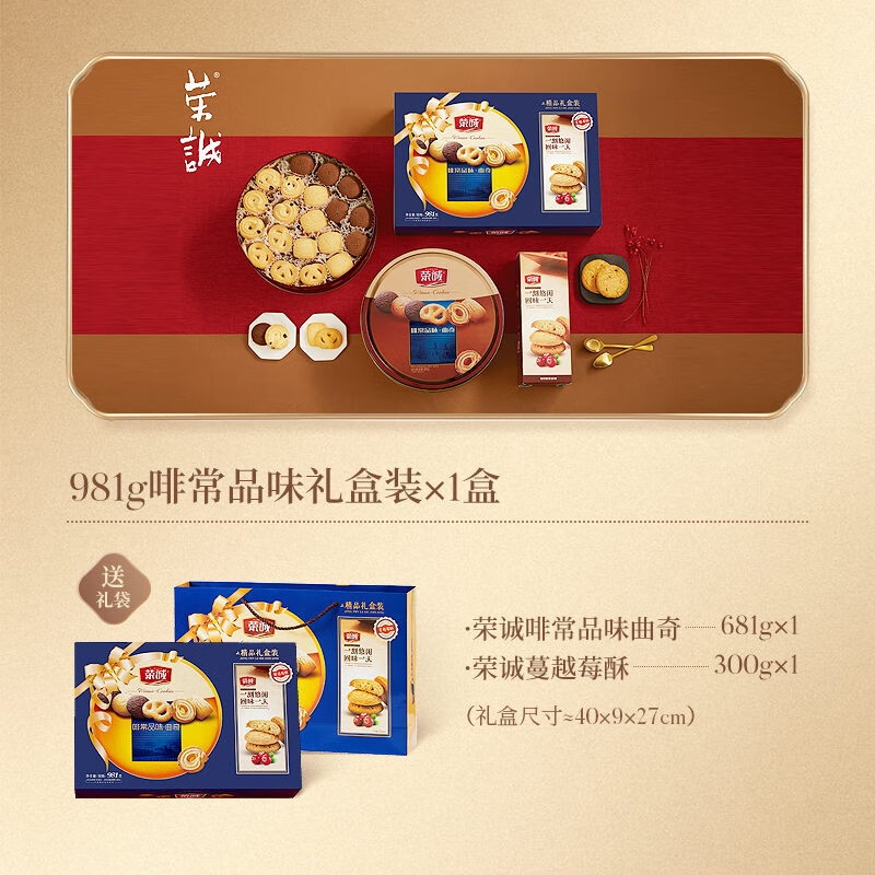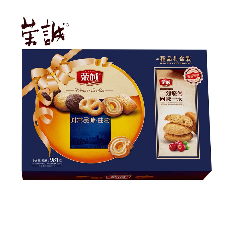 配置:908g荣诚啡常尊贵曲奇x1 202g澳式金泊鸡蛋卷(芝麻原味)x1