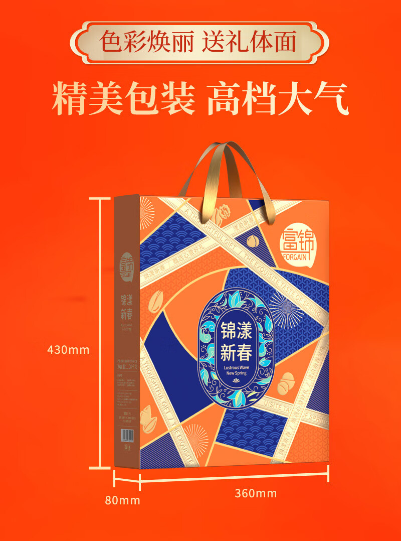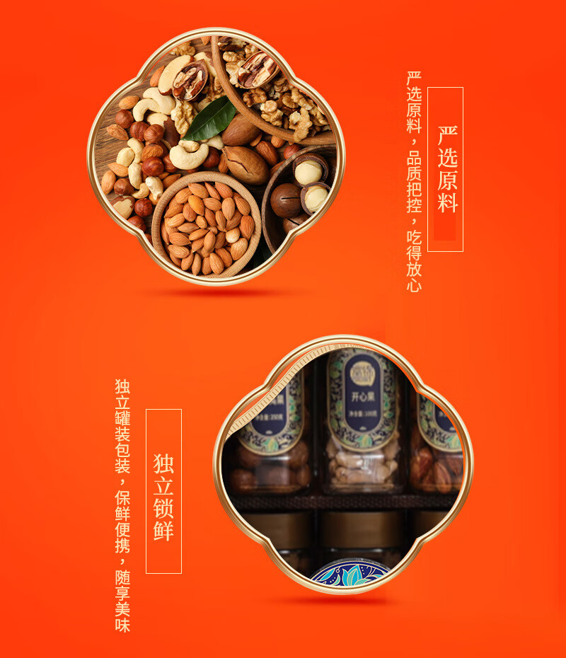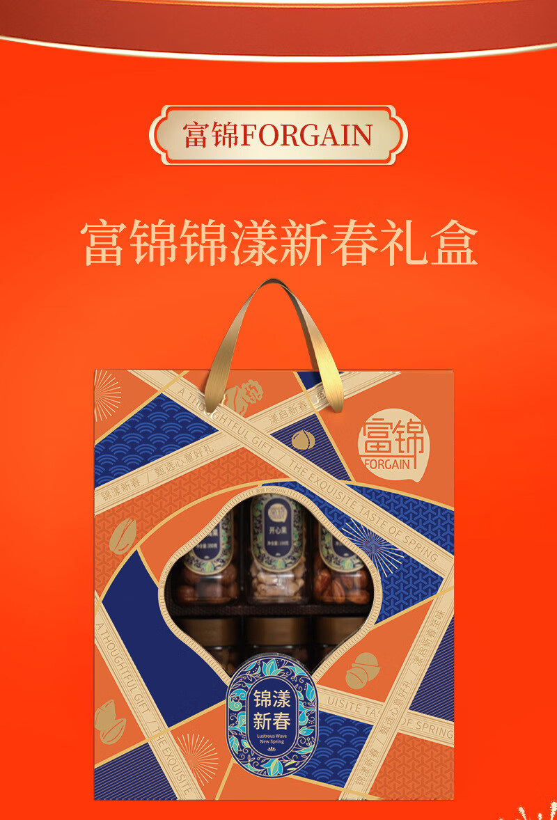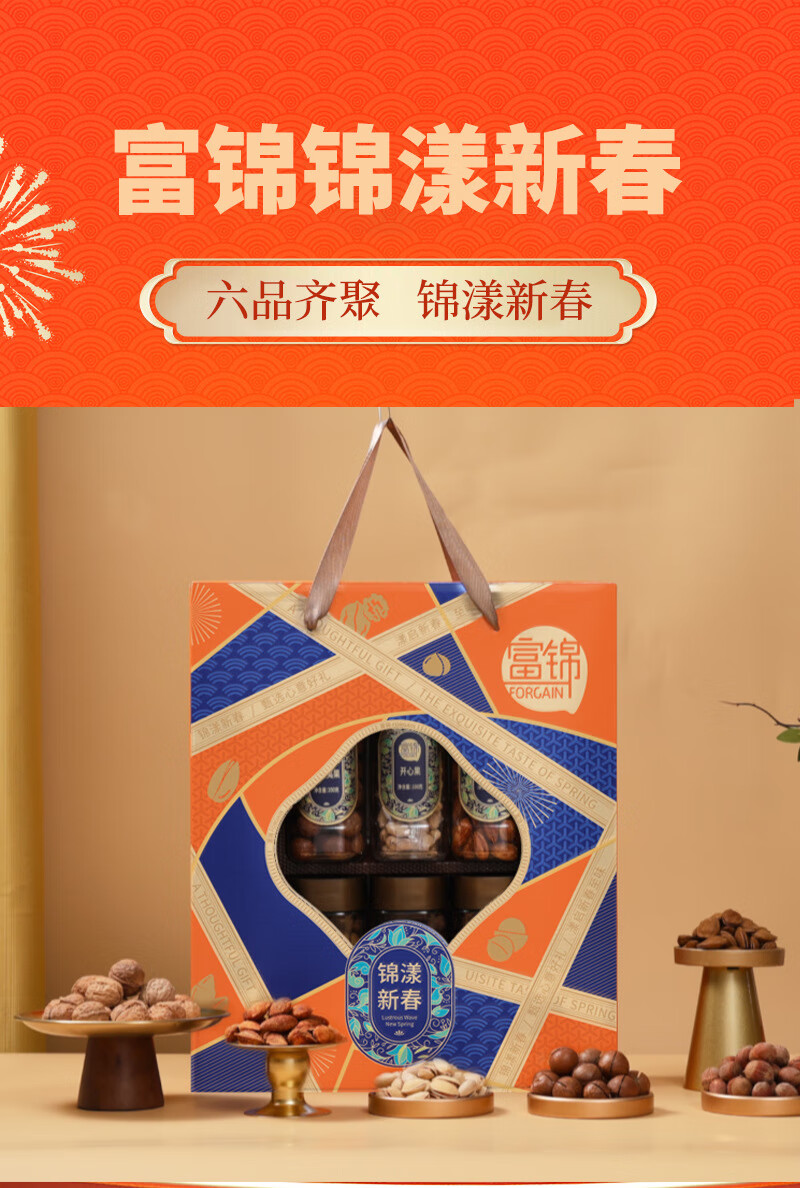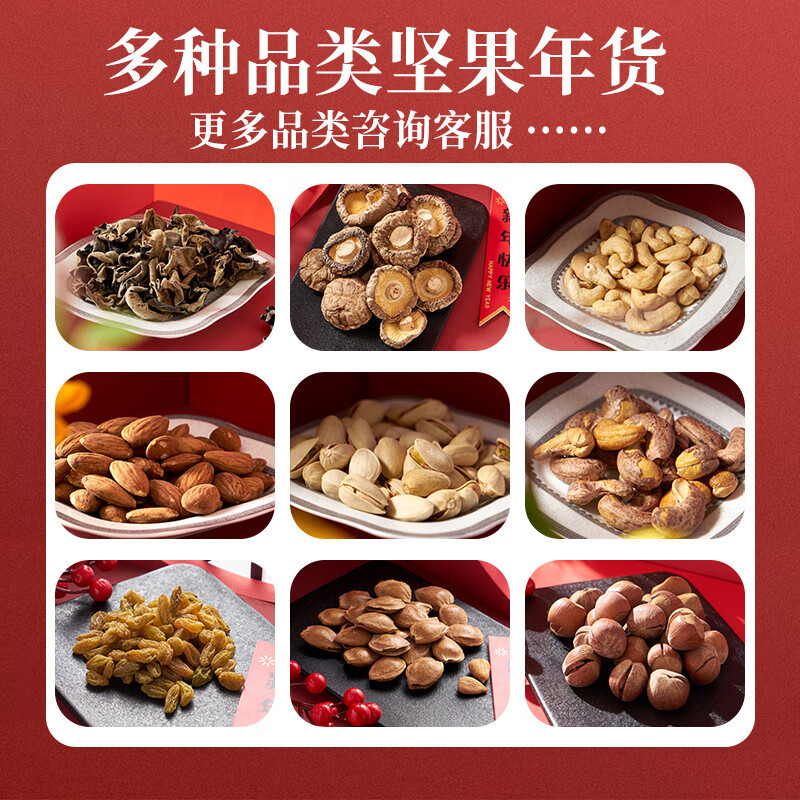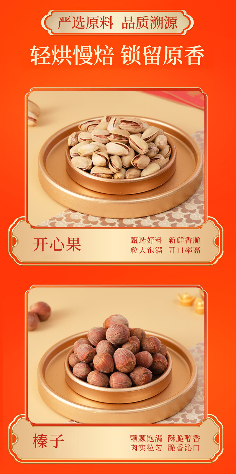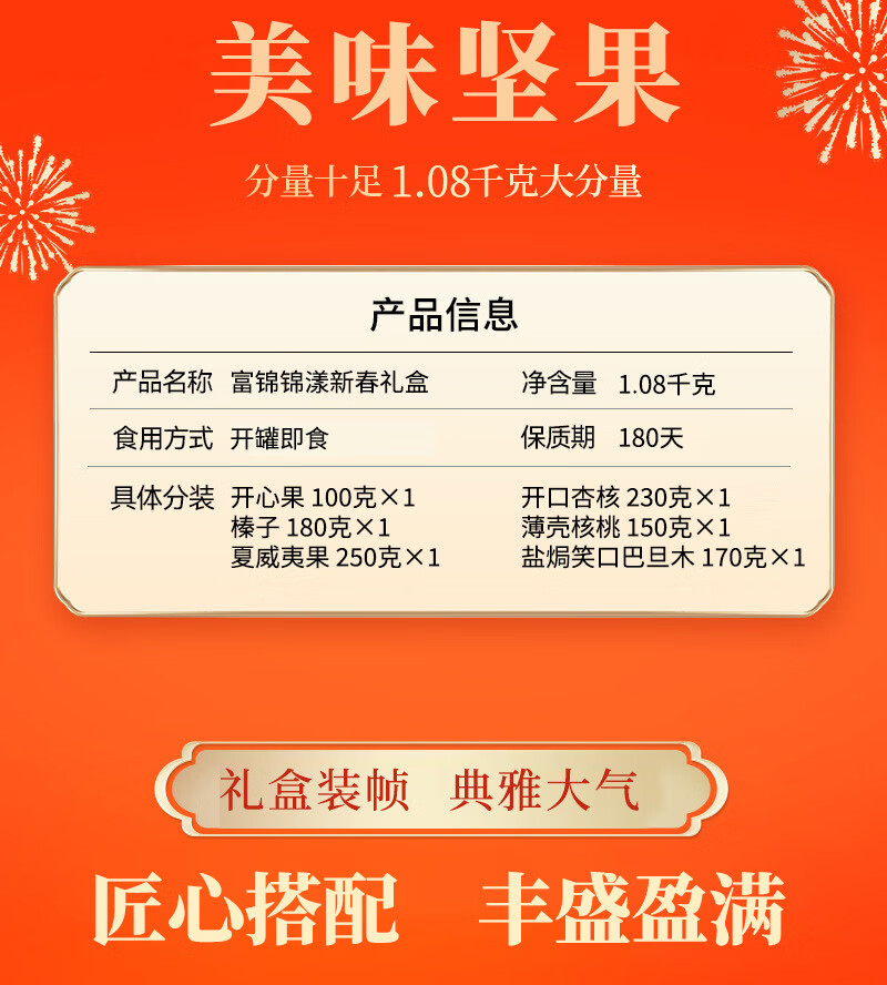 配置:100g富锦开心果 180g富锦榛子 250g富锦夏威夷果 230g富锦开口杏仁 150g富锦薄壳核桃 170g富锦带壳巴旦木