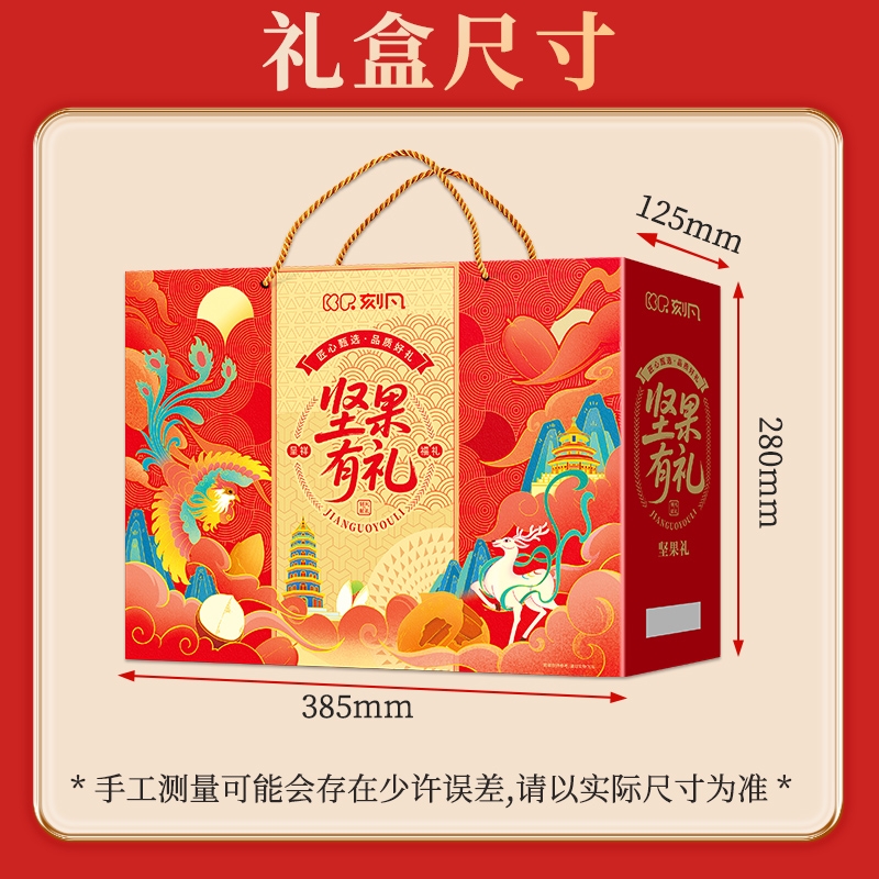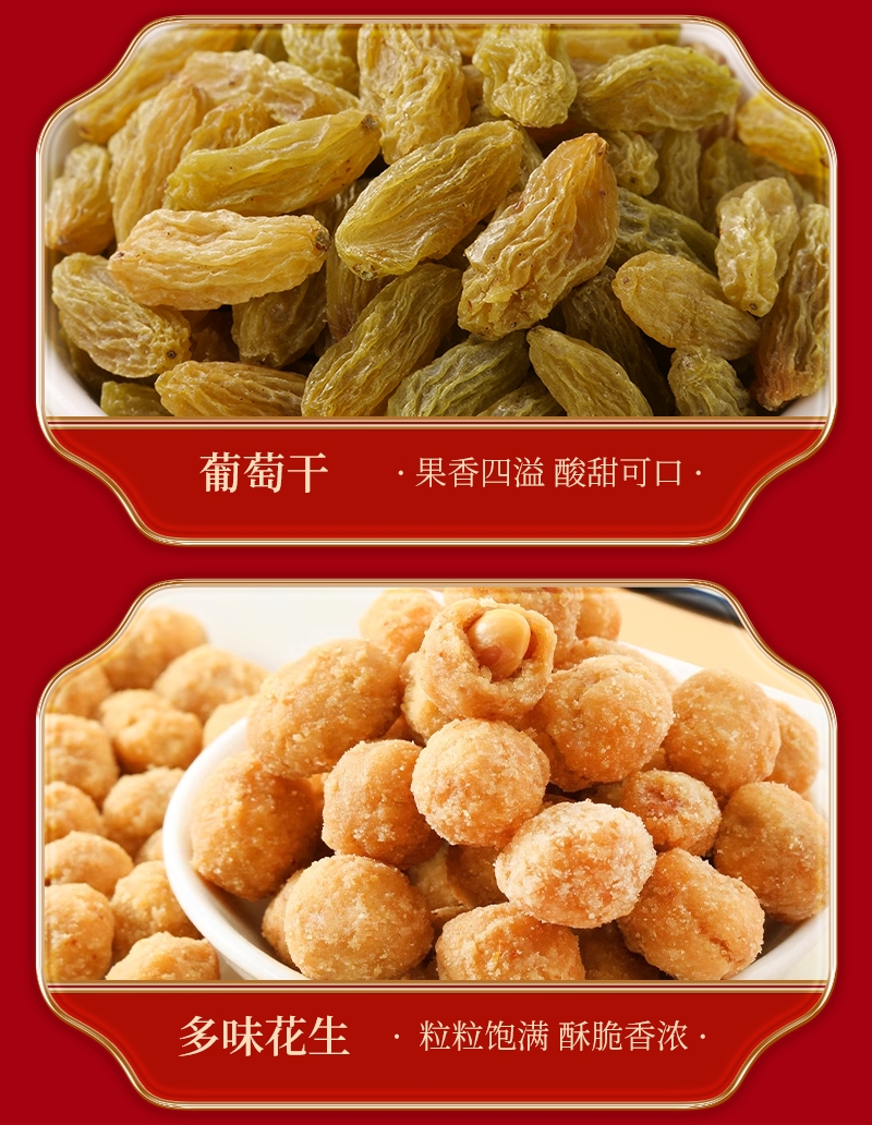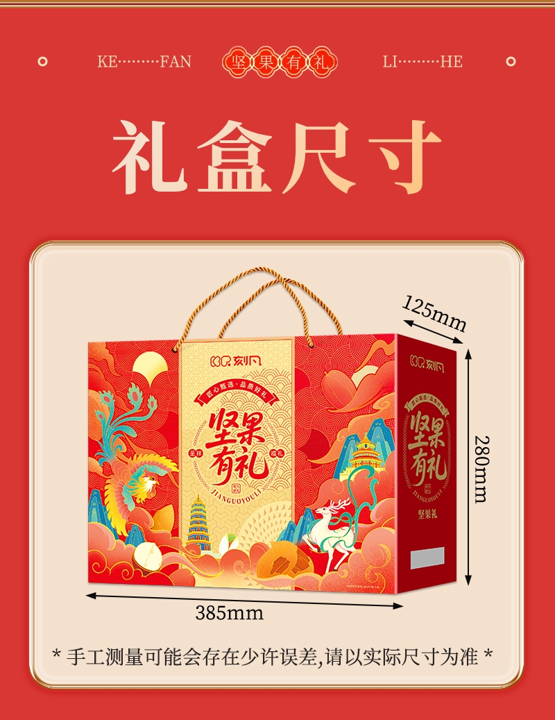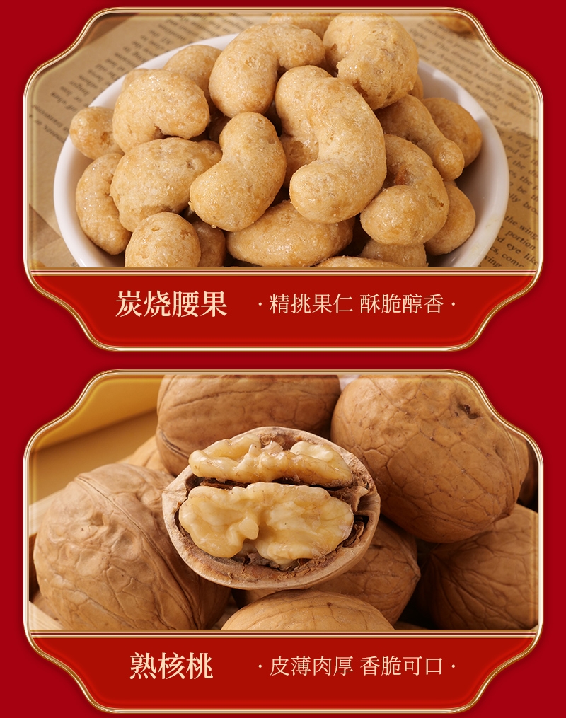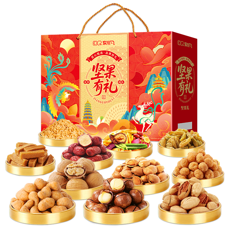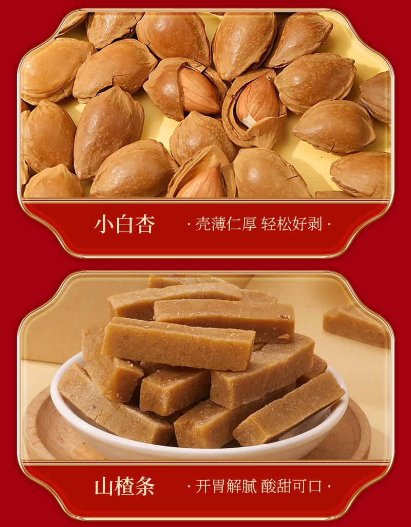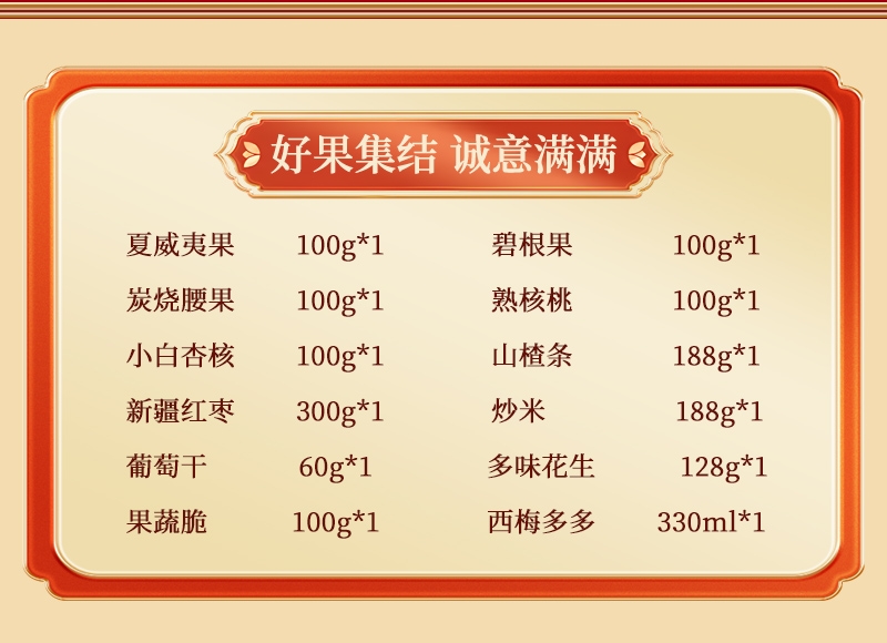 配置清单:夏威夷果100g*1 碧根果100g*1 炭烧腰果100g*1 熟核桃100g*1 小白杏核100g*1 山楂条188g*1 新疆红枣300g*1 炒米188g*1 葡萄干60g*1 多味花生128g*1 果蔬脆100g*1 西梅多多330ml*1