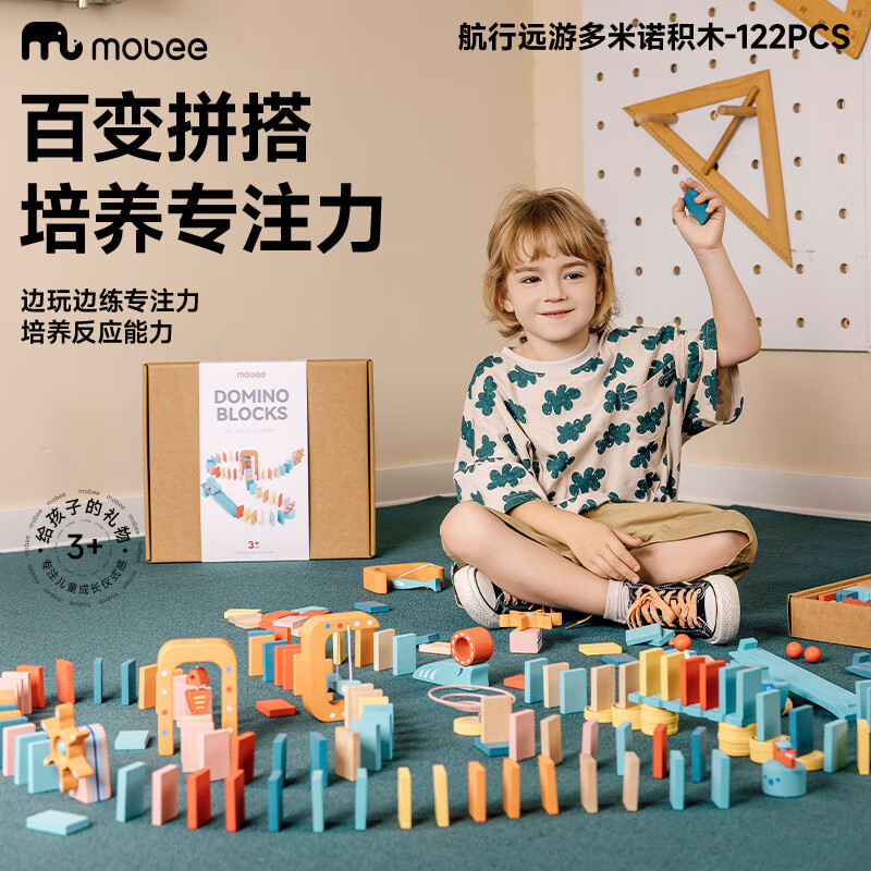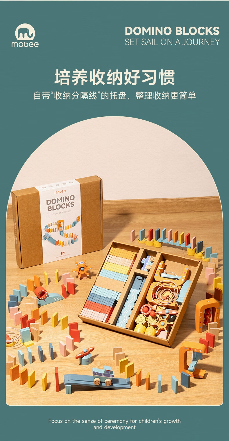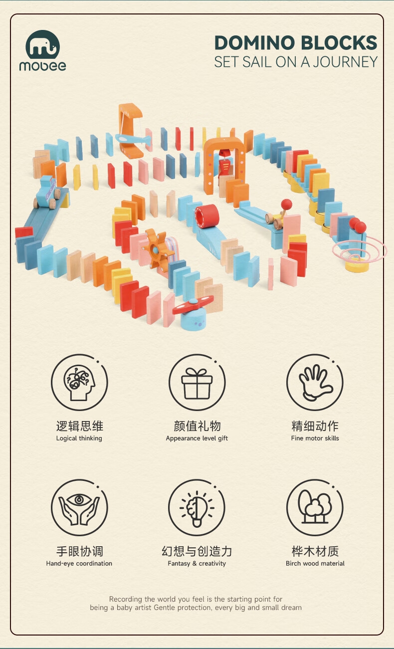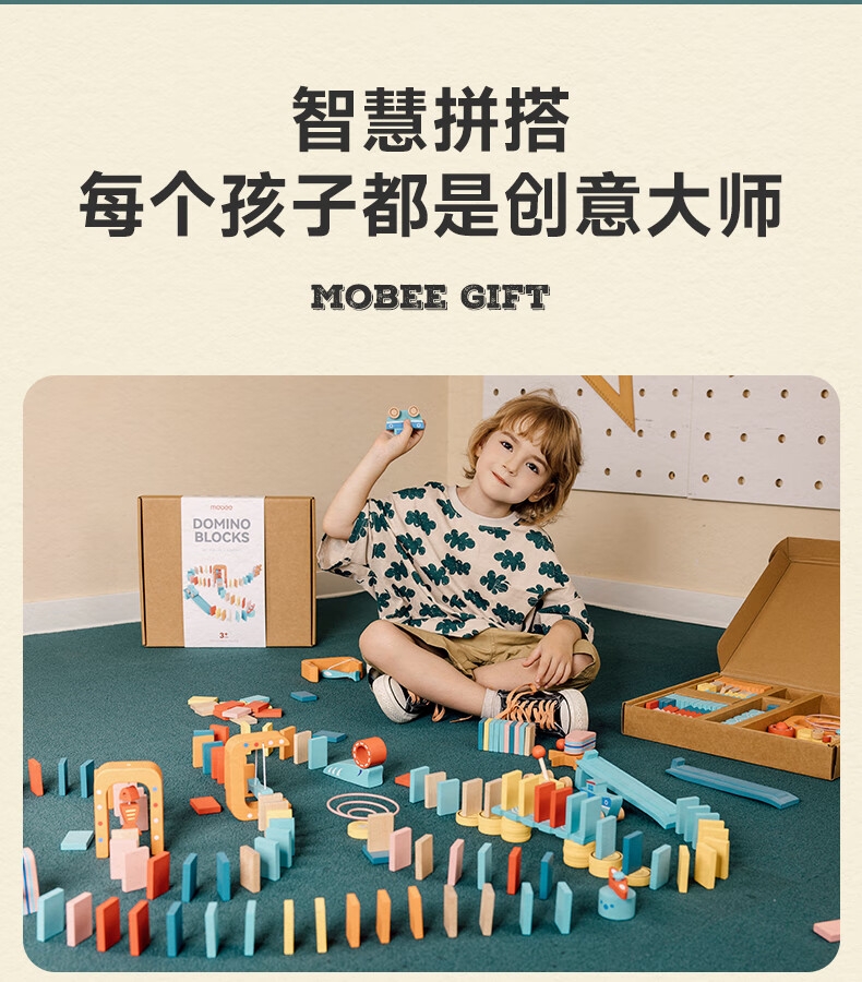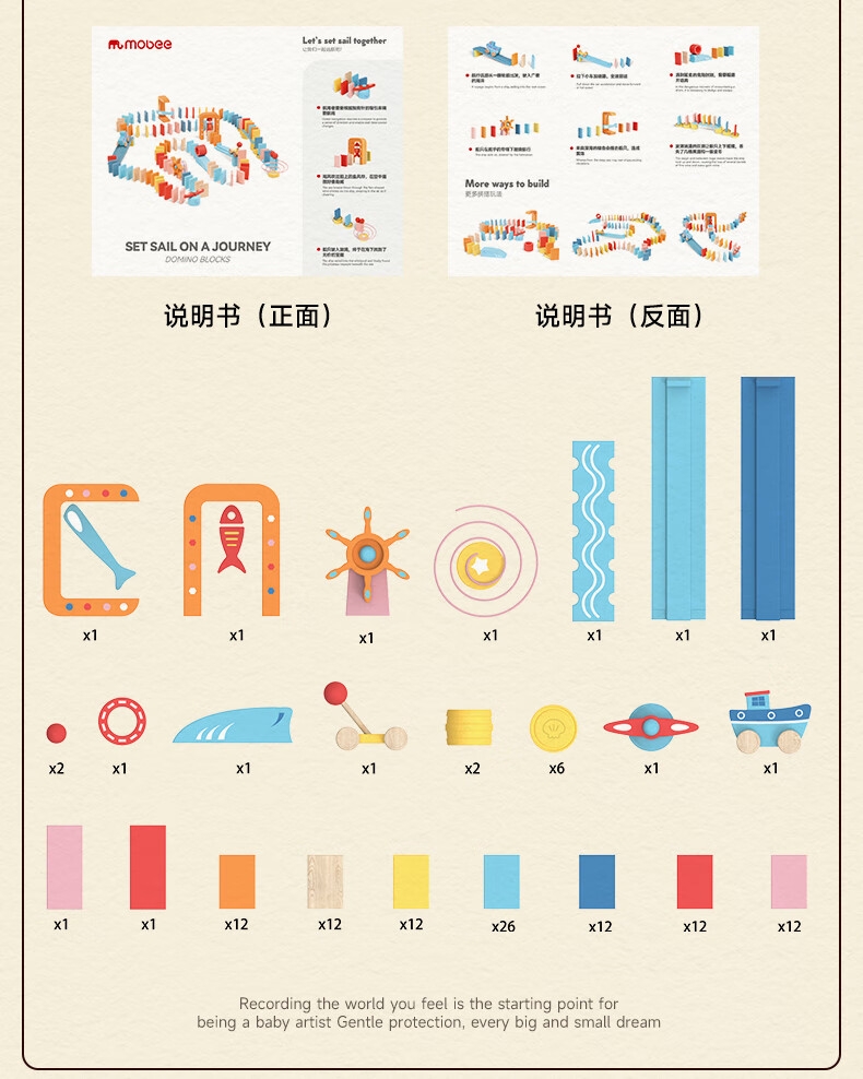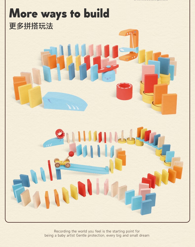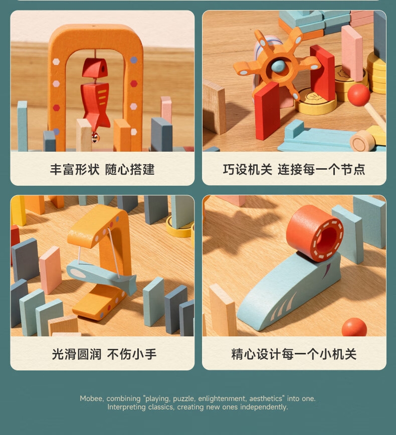 122粒桦木纯实木打造;每一粒积木都经过多次细心打磨;100块骨牌+22个零件,9种机关变换出各种玩法