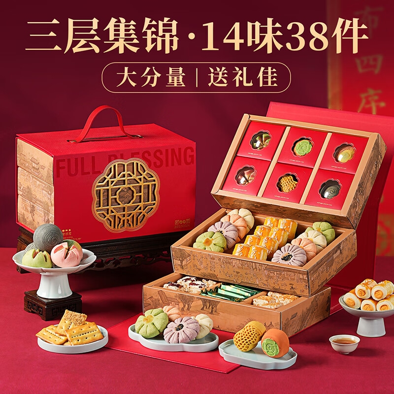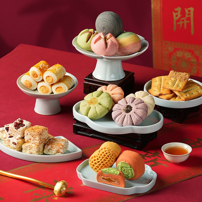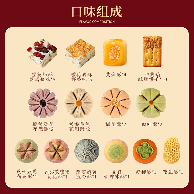 配置:雪花奶酥蔓越莓味15g*5 雪花奶酥椰香味15g*5 黄金酥36g*4 牛肉馅酥脆饼干130g 椰奶雪花花型酥37g*2 奶香芋泥花型酥36g*2 梅花酥36g*2 四叶酥36g*2 芝士蓝莓荷花酥50g*1 细沙玫瑰味荷花酥50g*1 陨石奶黄流心酥65g*1 夏日青柠味糕点65g*1 好柿酥55g*1 花生酥50g*1