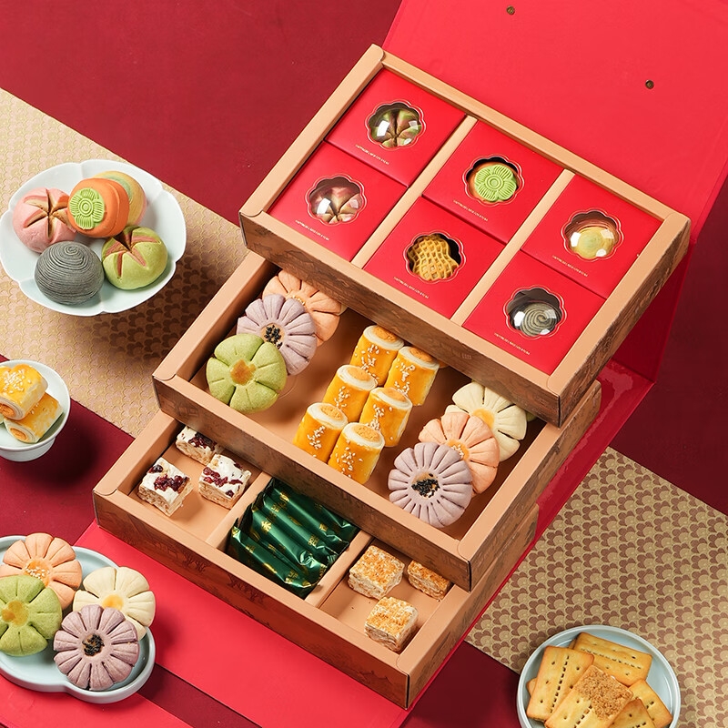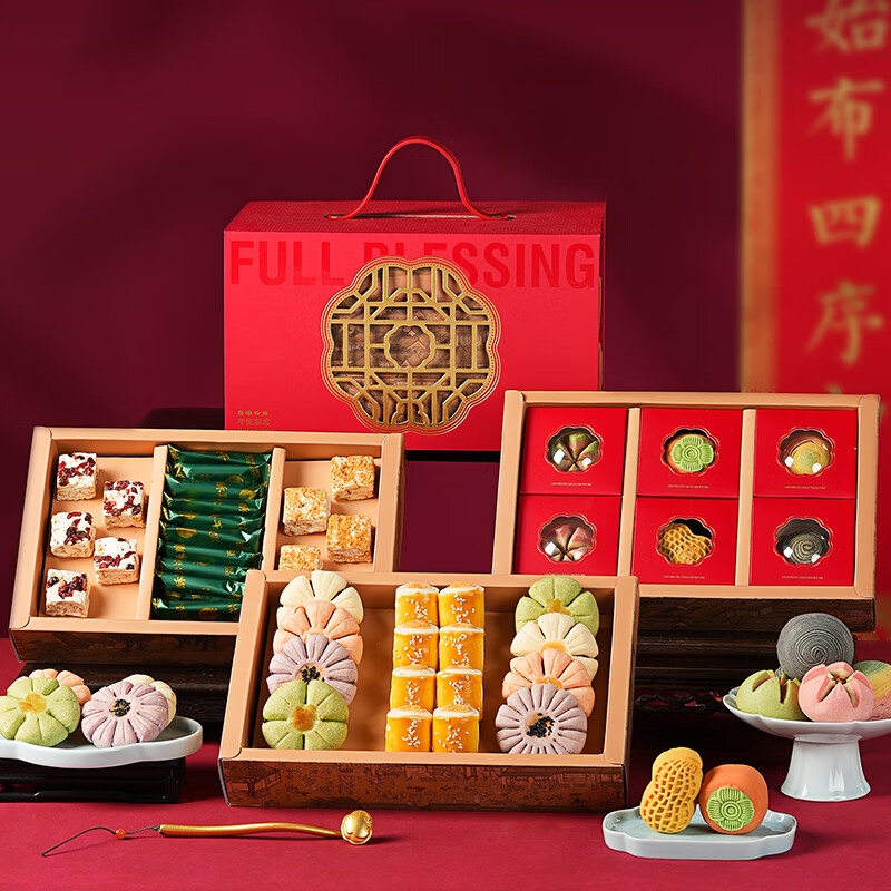 甜度适中,绵软细腻;纳古意传今礼 东方美学设计;糕点、坚聚齐聚一盒 每口都有新鲜感
