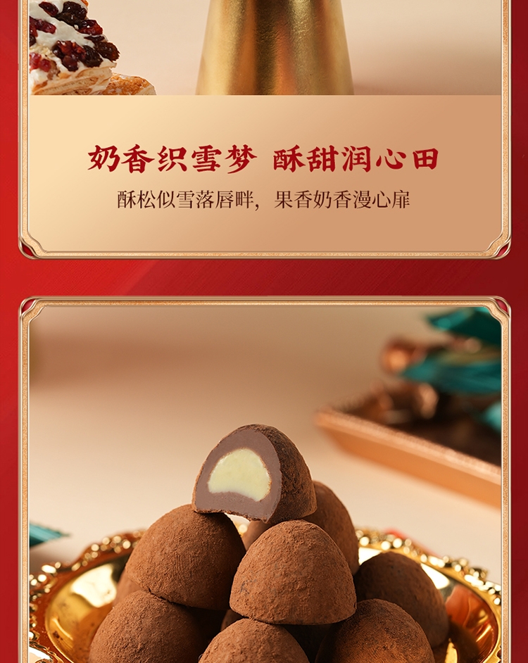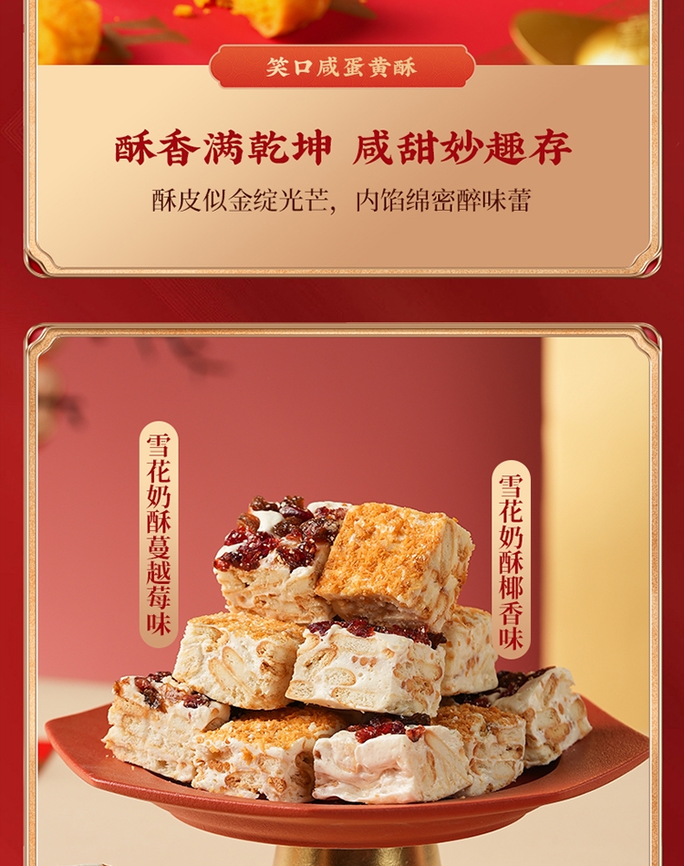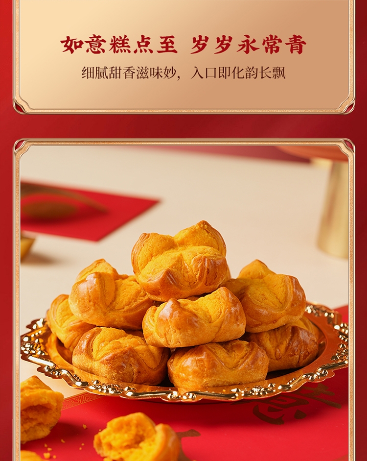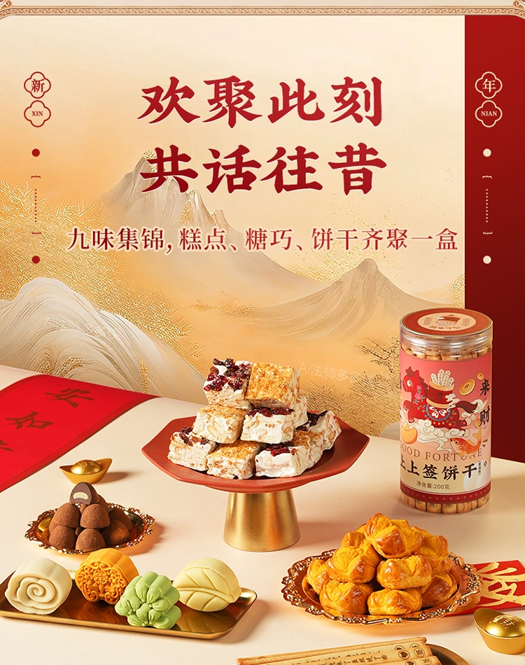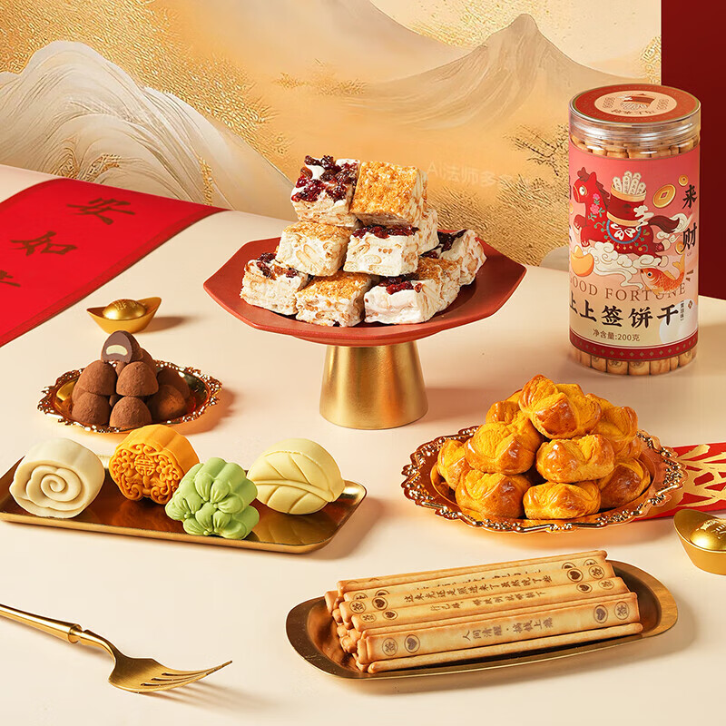 九味集锦,糕点、糖巧、饼干齐聚一盒;细腻甜香滋味妙,入口即化韵长飘;酥皮似金绽光芒,内馅绵密醉味蕾