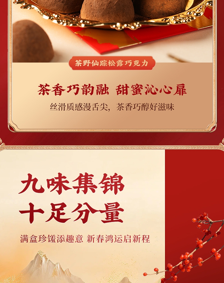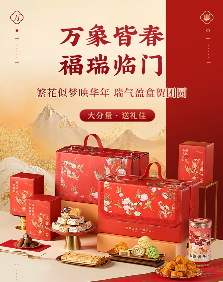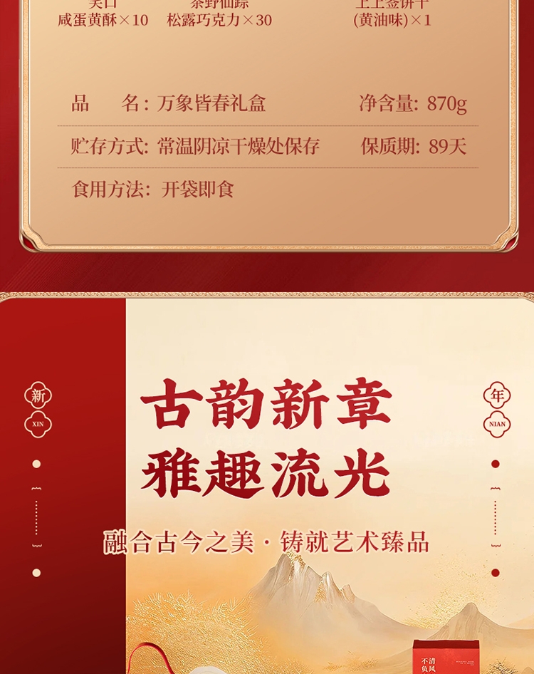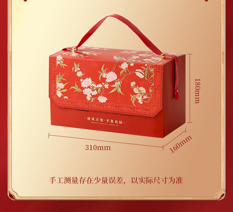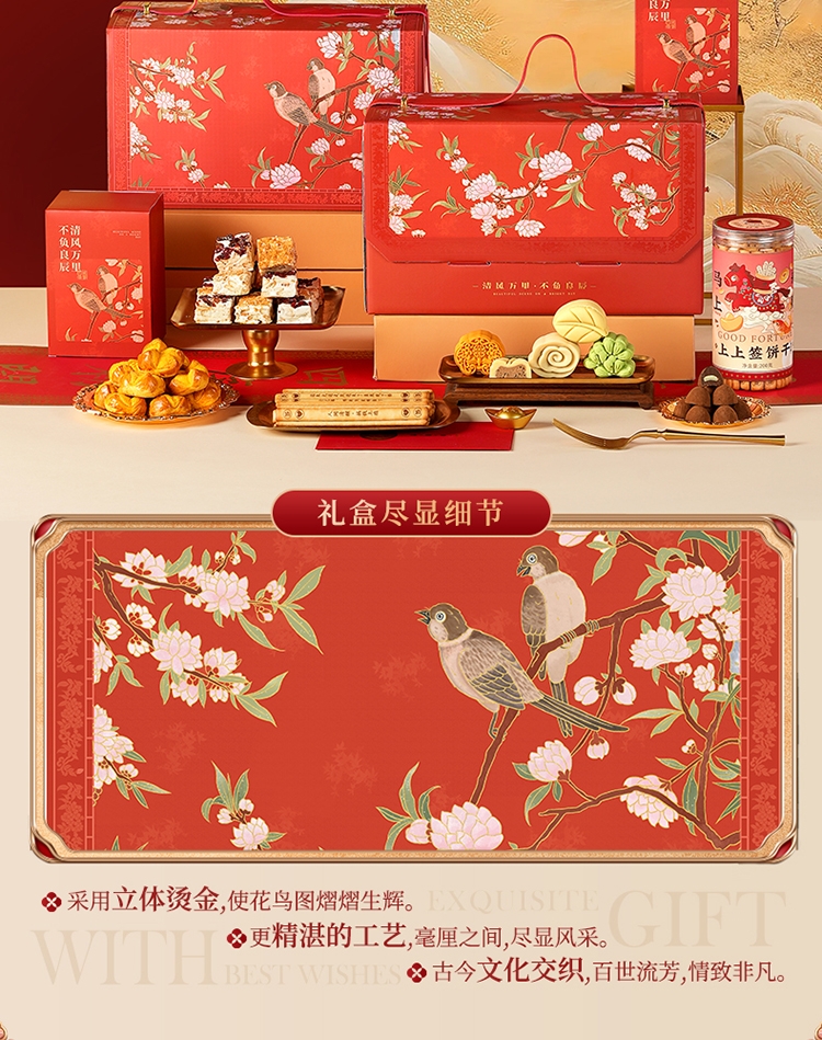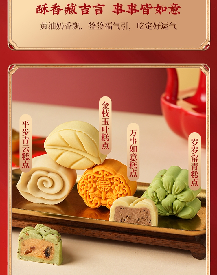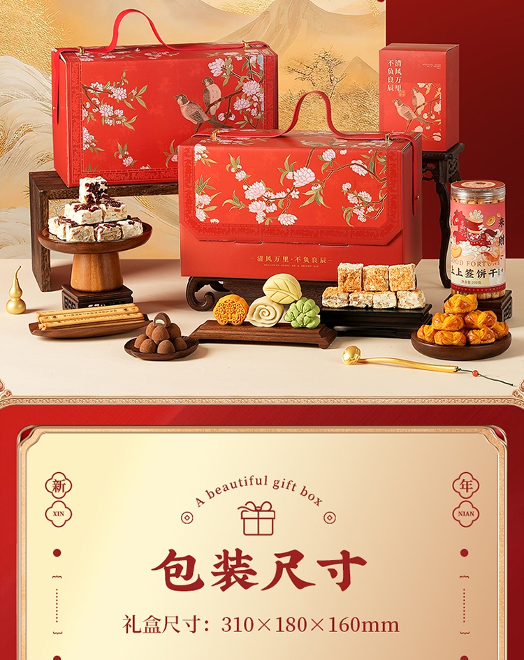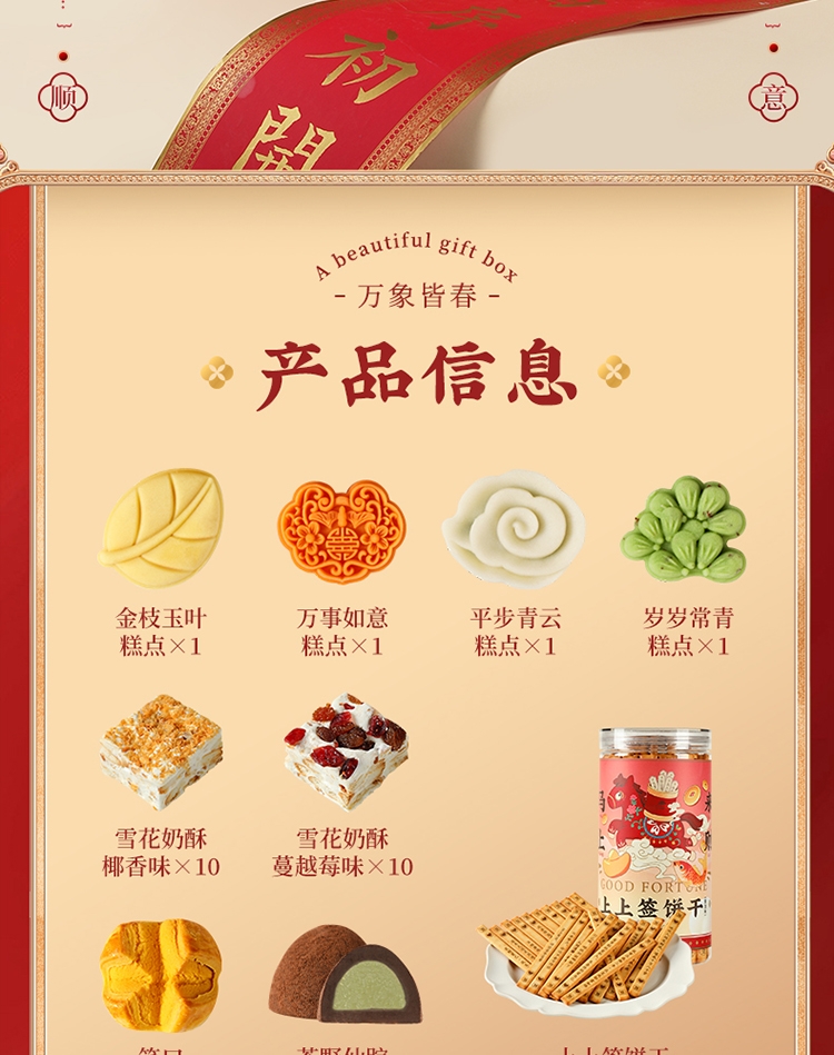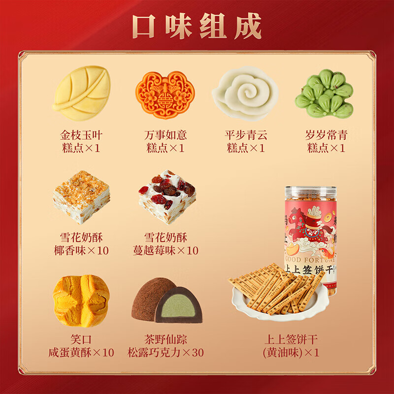 配置:金枝玉叶糕点30g*1 万事如意糕点30g*1 平步青云糕点30g*1 岁岁常青糕点30g*1 椰香味雪花奶酥15g*10 蔓越莓味雪花奶酥15g*10 笑口蛋黄酥10g*10 茶叶仙踪松露巧克力5g*30 上上签饼干*1罐200g