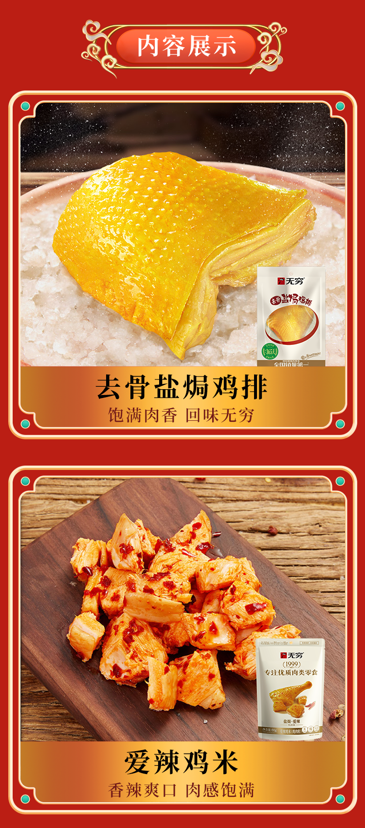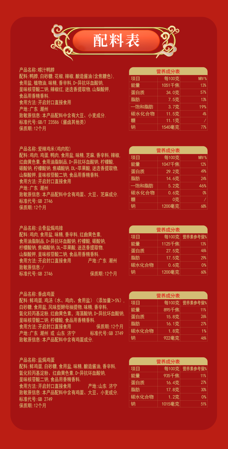 配置清单:60g爱辣鸡米(鸡肉粒) 60g爱辣鸡米(鸡肉粒) 120g香卤鸡蛋 63g嗦汁鸭脖 50g去骨盐焗鸡排(原味) 50g去骨盐焗鸡排(原味) 486g盐焗鸡蛋(铝膜)