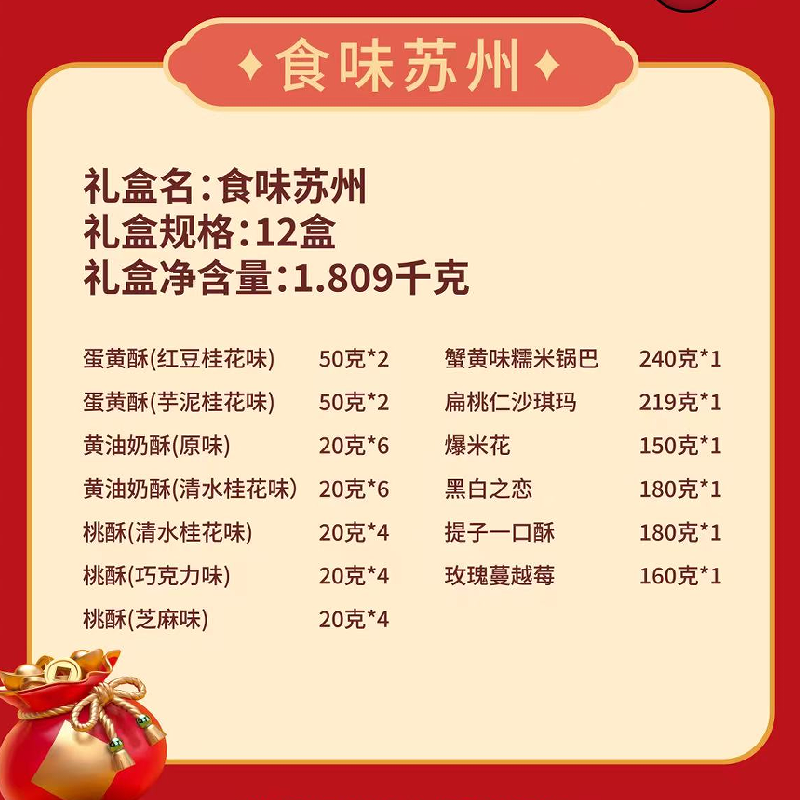 配置清单:蛋黄酥(红豆桂花味)50克*2 蛋黄酥(芋泥桂花味)50克*2 黄油奶酥(原味)20克*6 黄油奶酥(清水桂花味)20克*6 桃酥(桂花味)20克*4 桃酥(巧克力味)20克*4 桃酥(黑芝麻味)20克*4 蟹黄味糯米锅巴240克*1 扁桃仁沙琪玛219克*1 爆米花150克*1 黑白之恋点心180克*1 提子一口酥180克*1 玫瑰蔓越莓/每盒4片160克*1