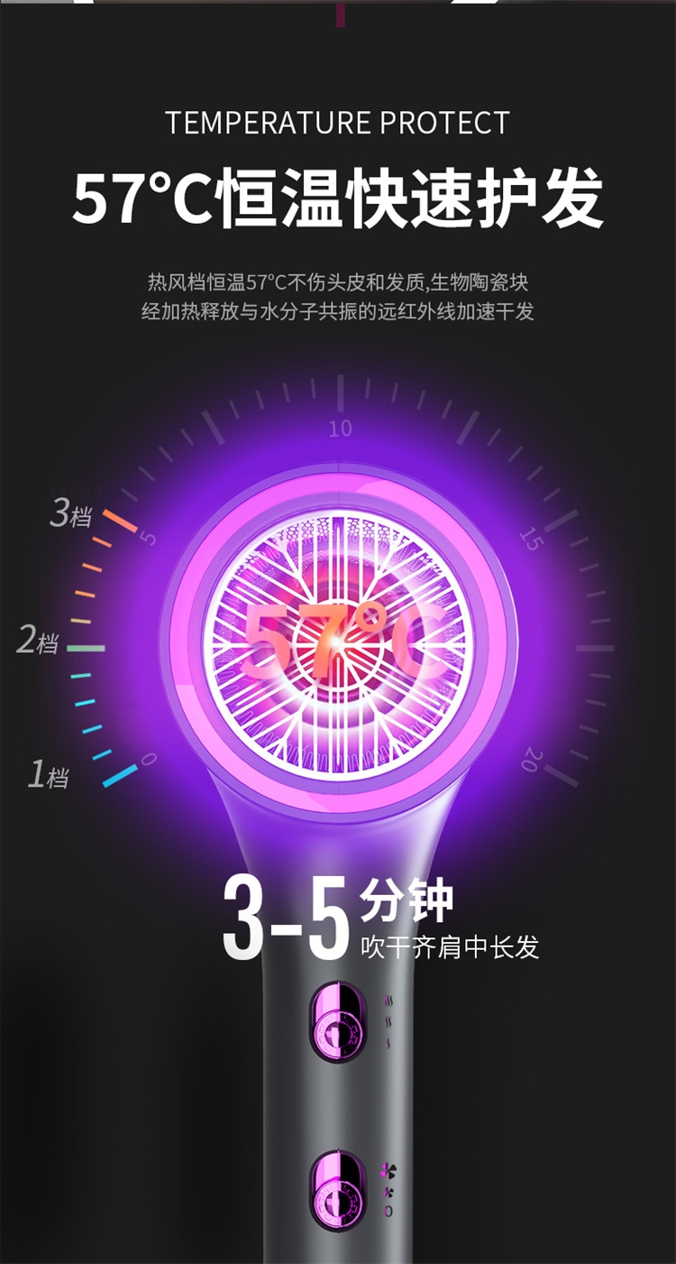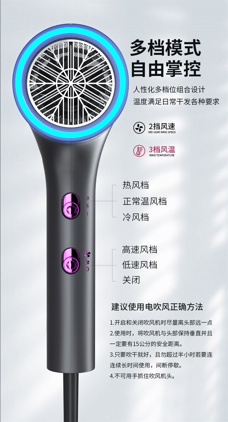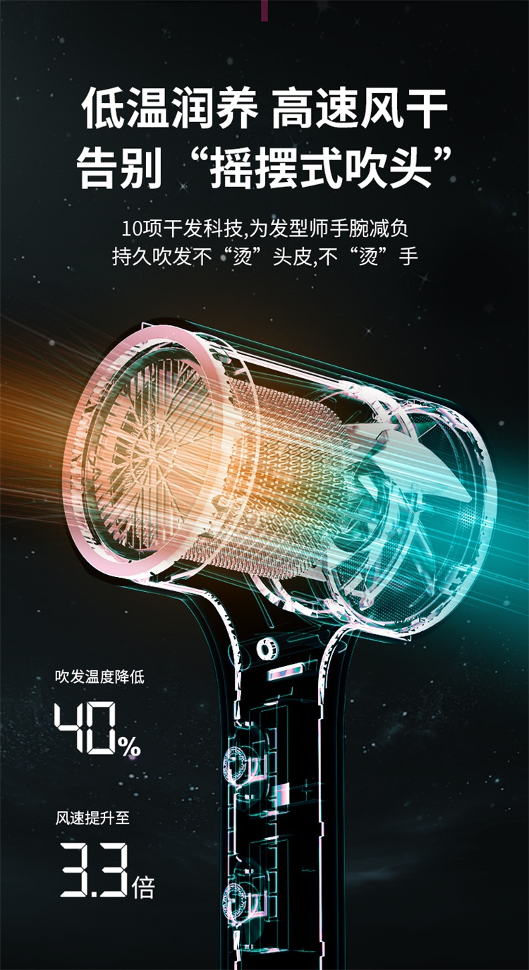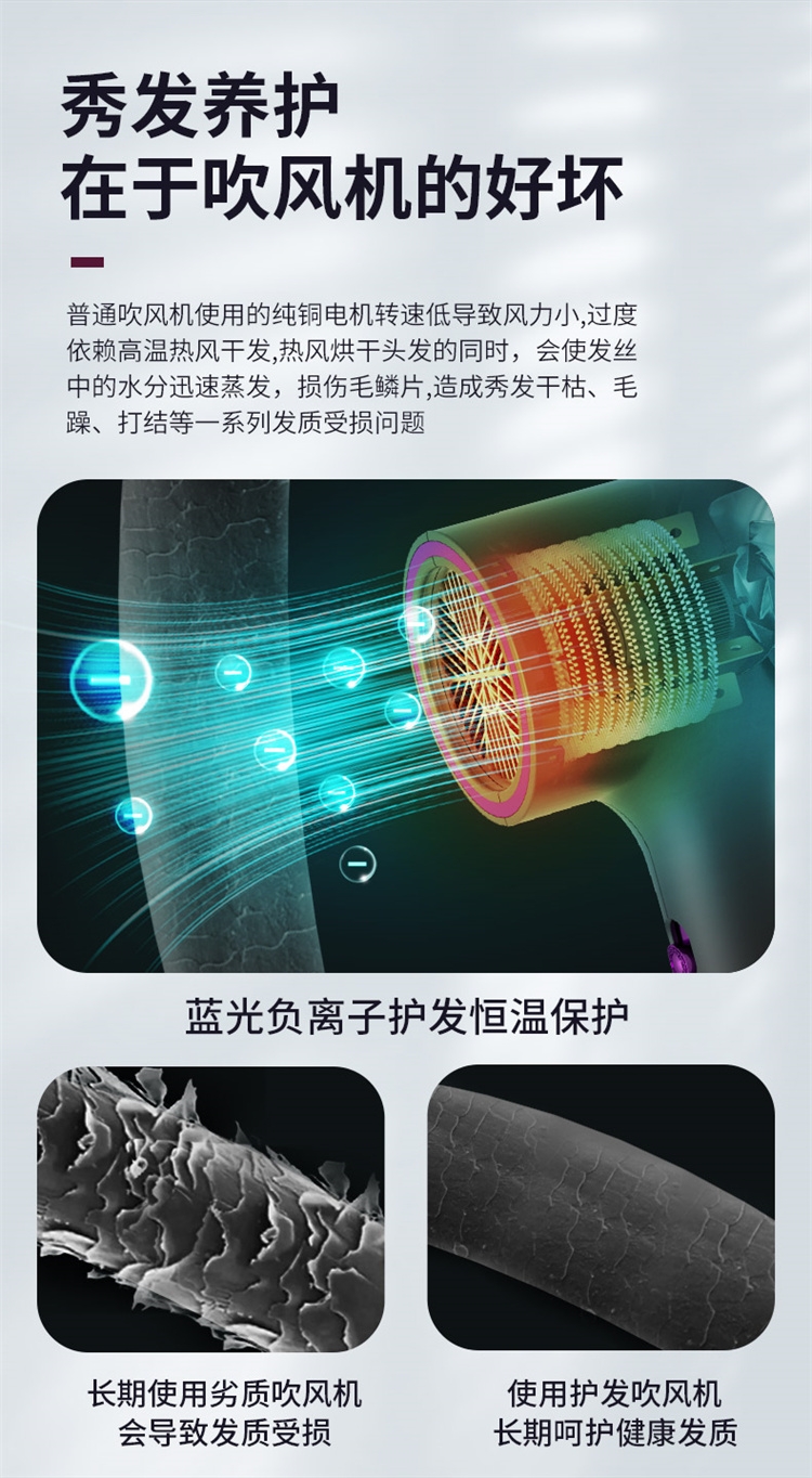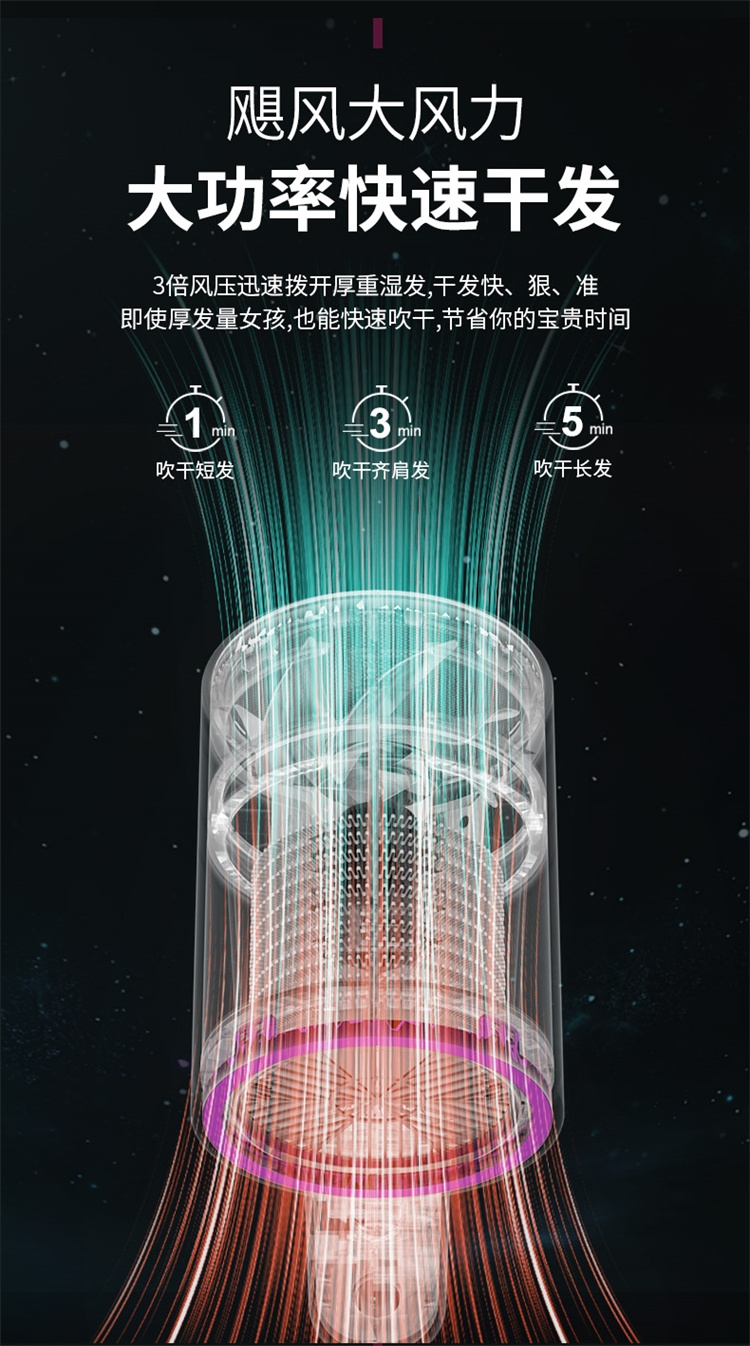 顺泽养护 柔顺盈亮秀发;低温润养 高速风干;飓风大风力大功率快速干发