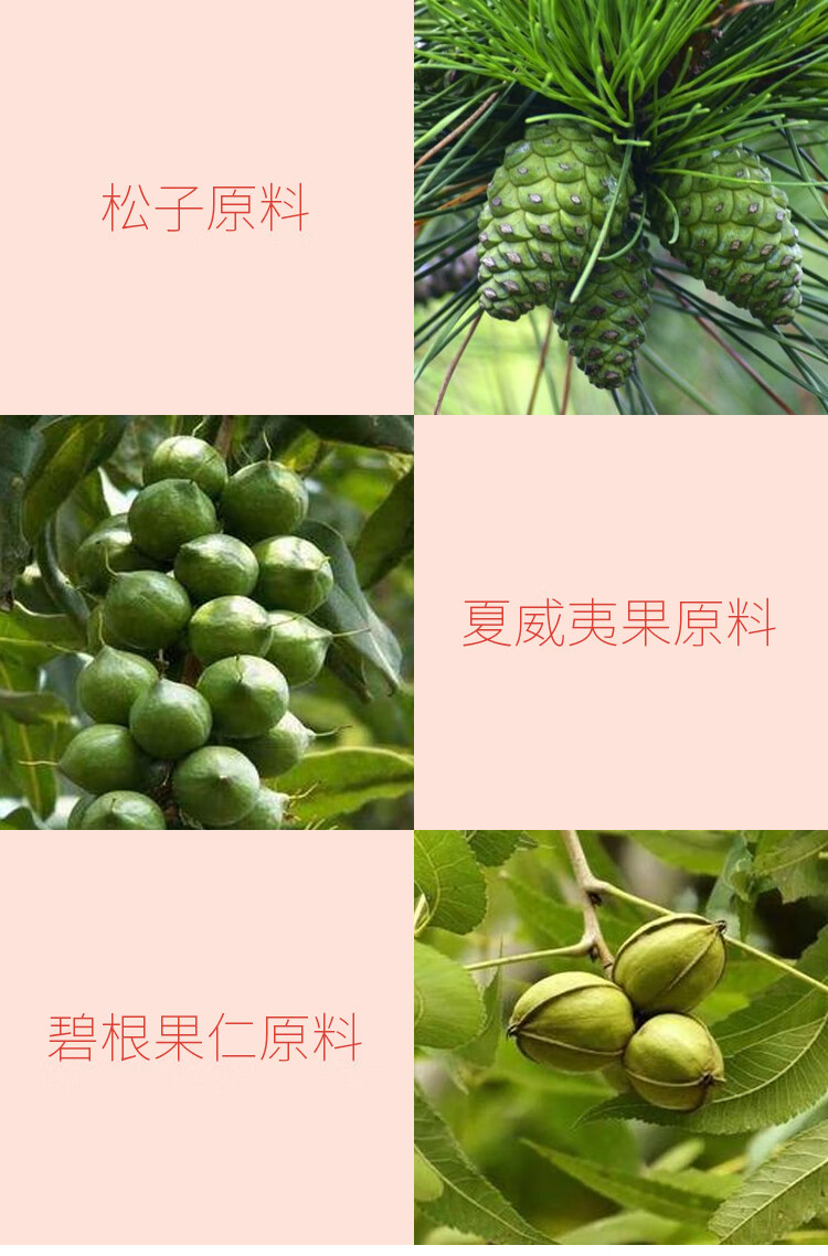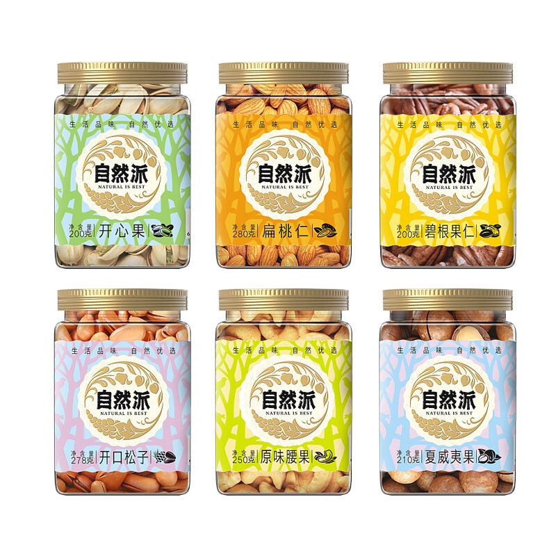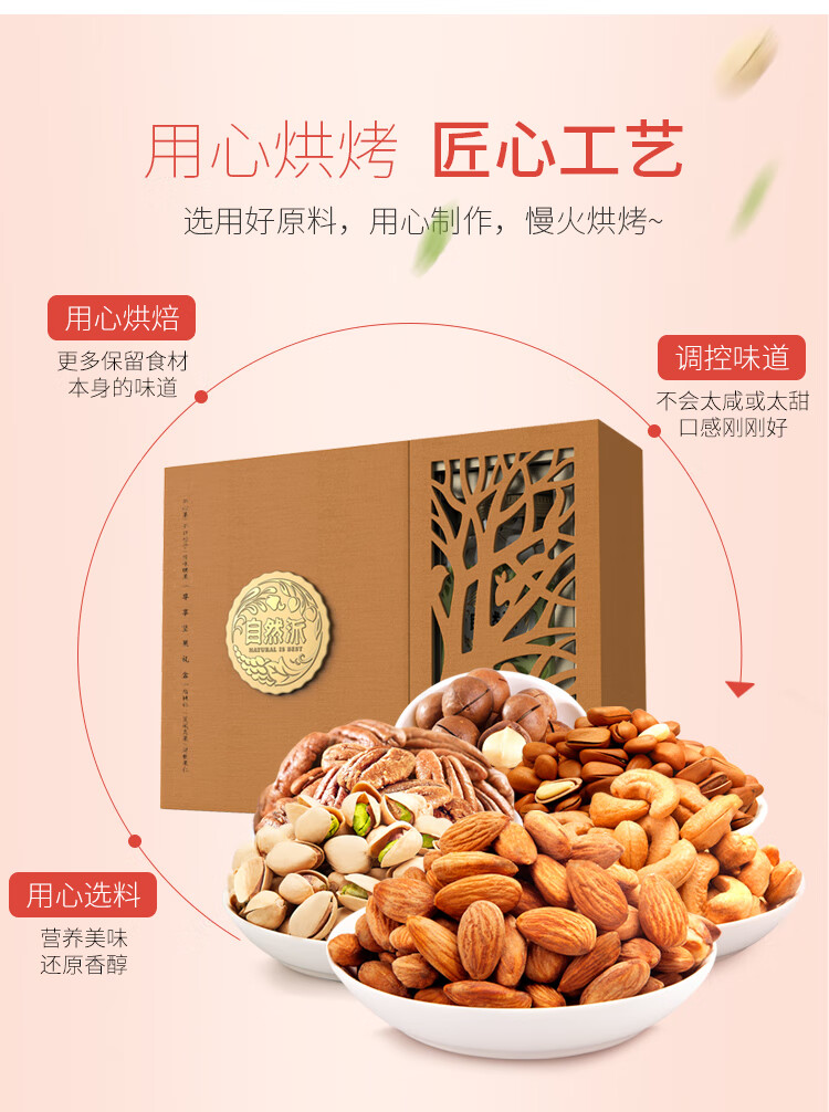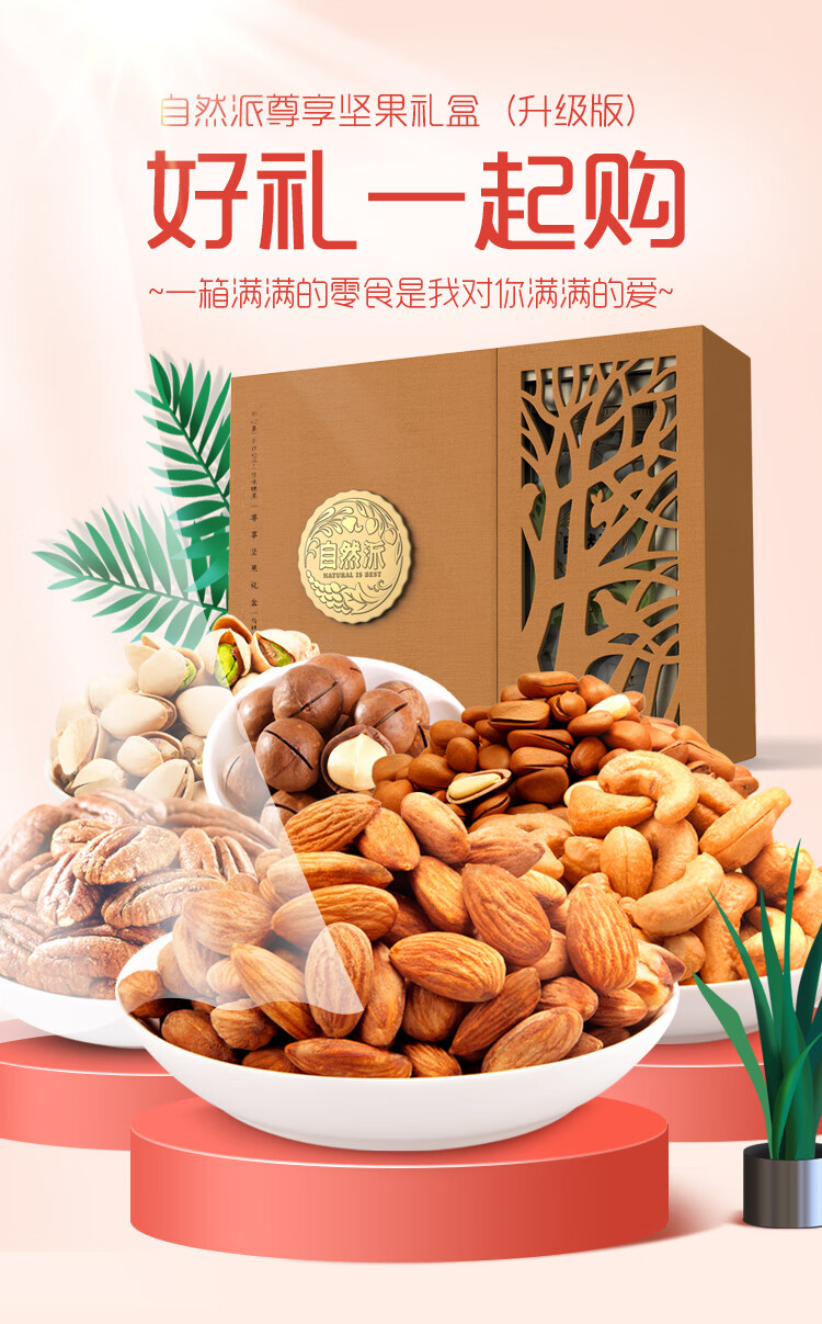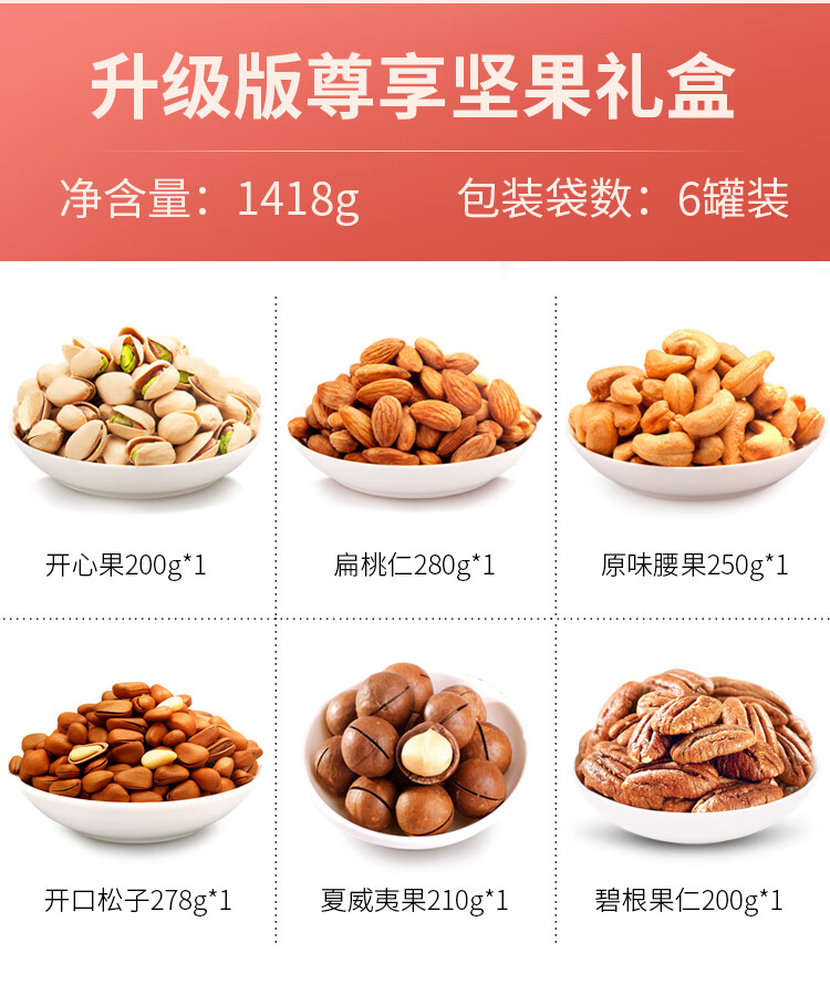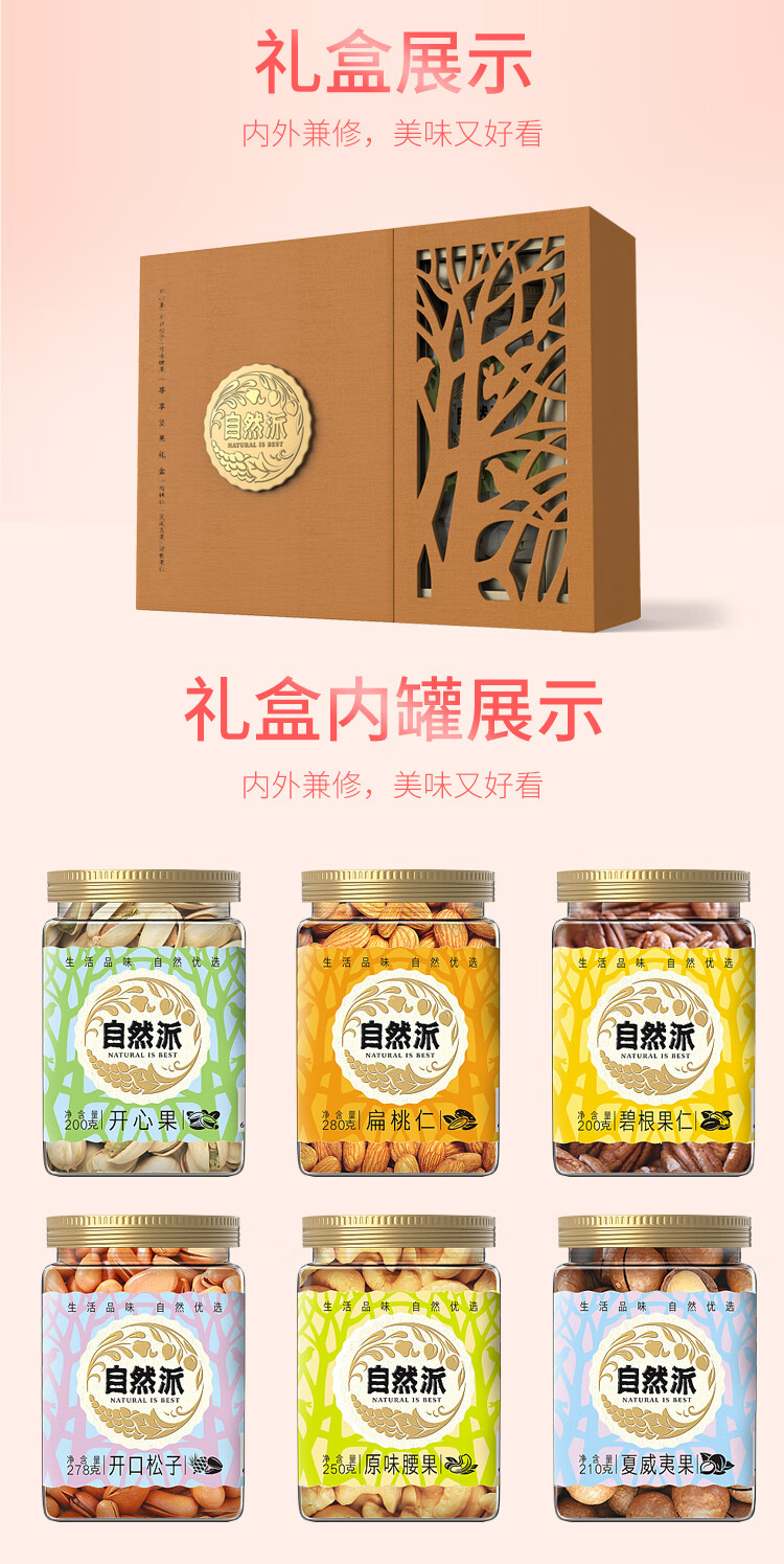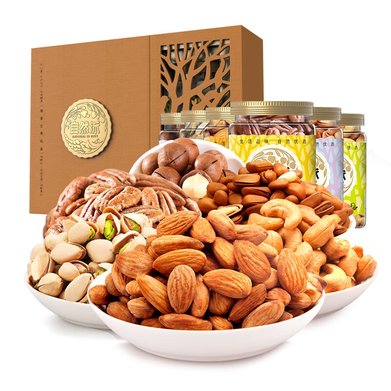 配置清单:自然派开心果200g 自然派扁桃仁280g 自然派原味腰果250g 自然派开口松子278g 自然派夏威夷果210g 自然派碧根果仁200g