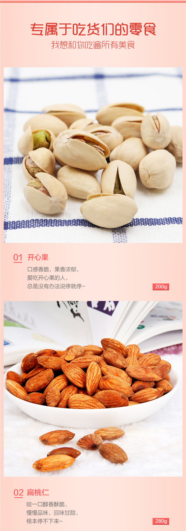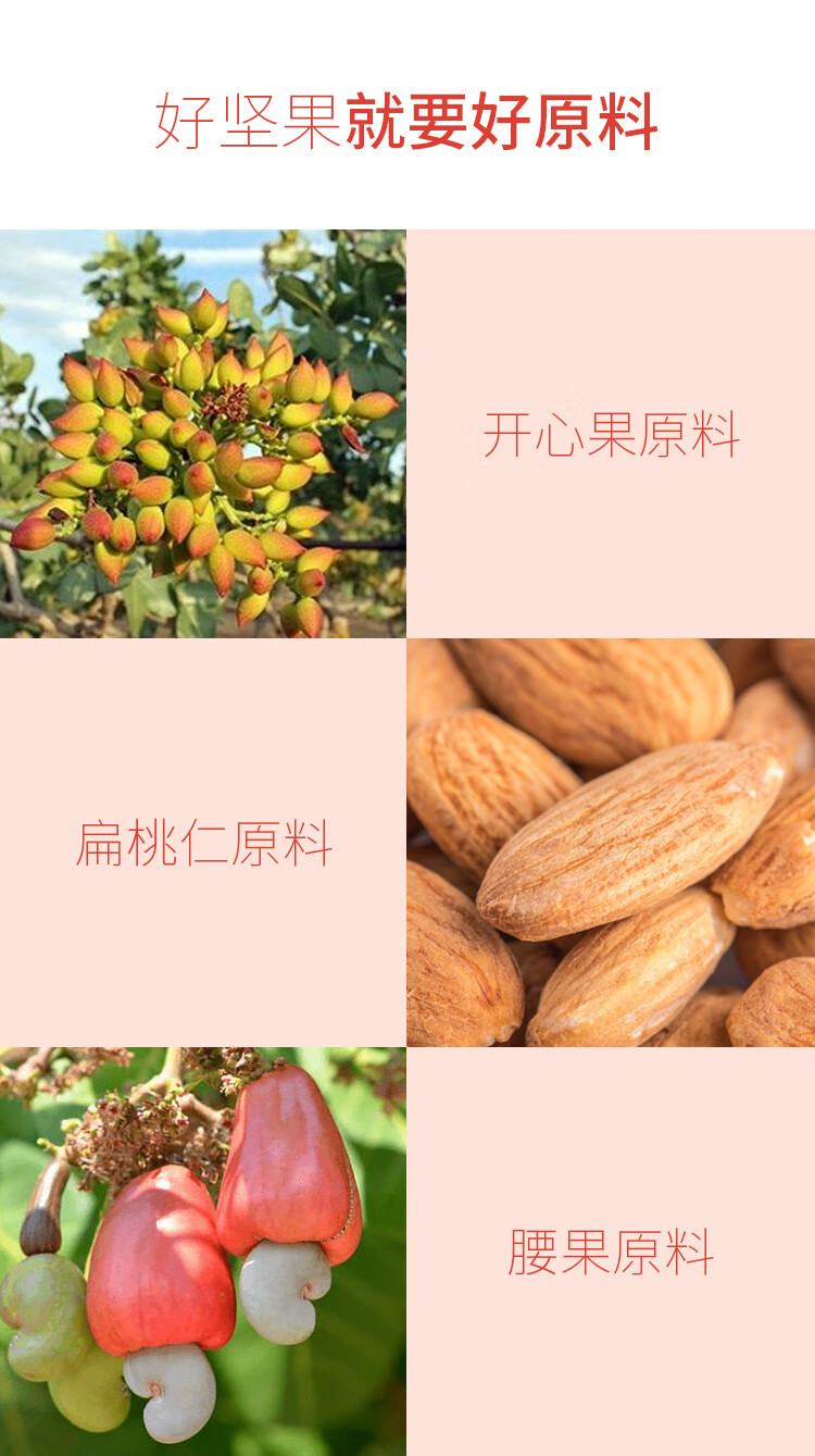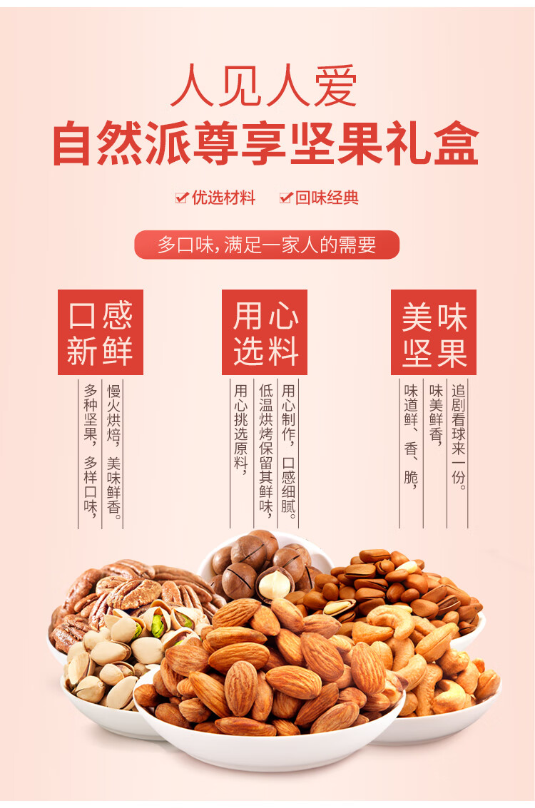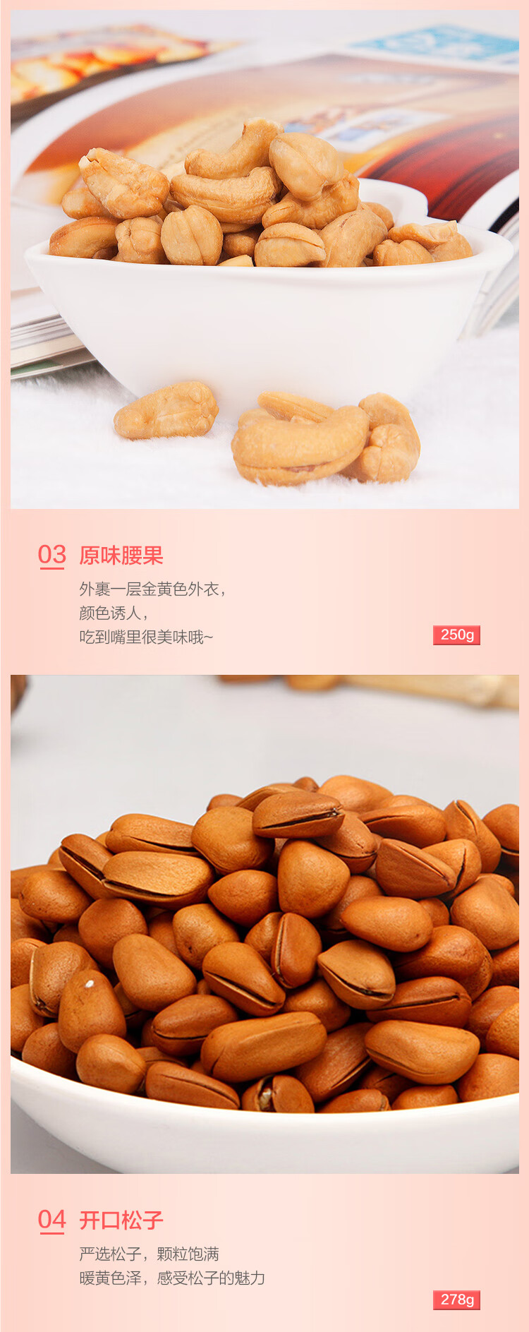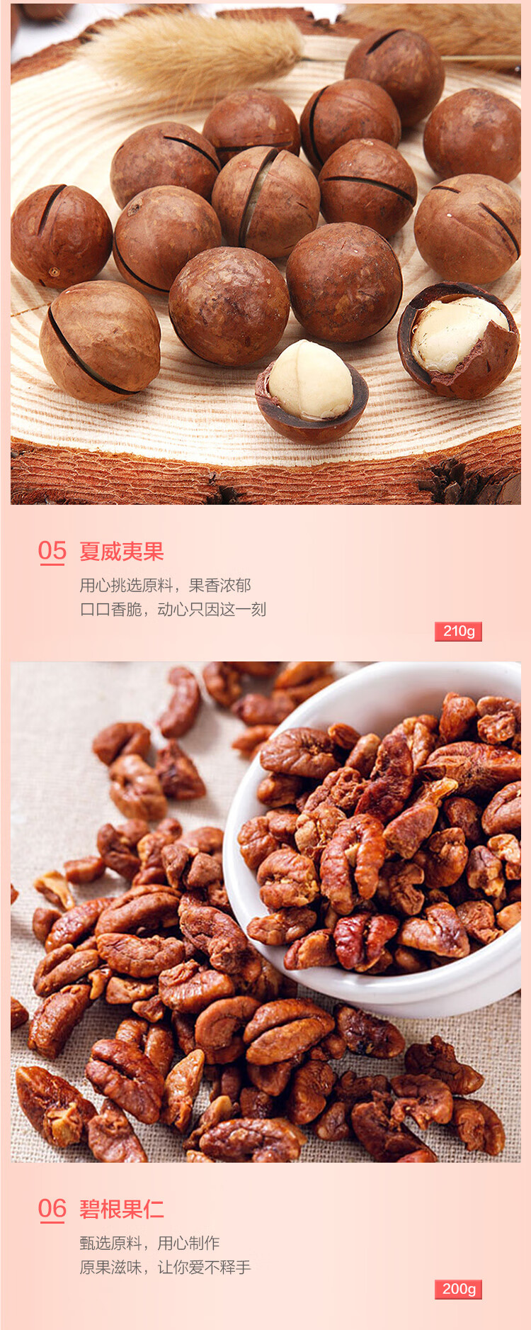 配置清单:自然派开心果200g 自然派扁桃仁280g 自然派原味腰果250g 自然派开口松子278g 自然派夏威夷果210g 自然派碧根果仁200g