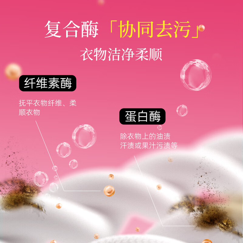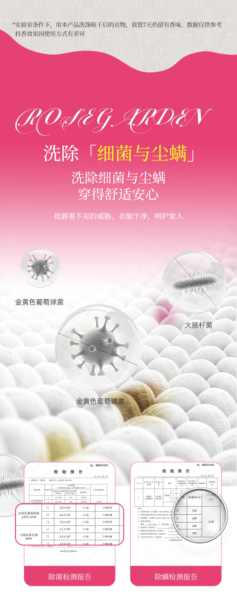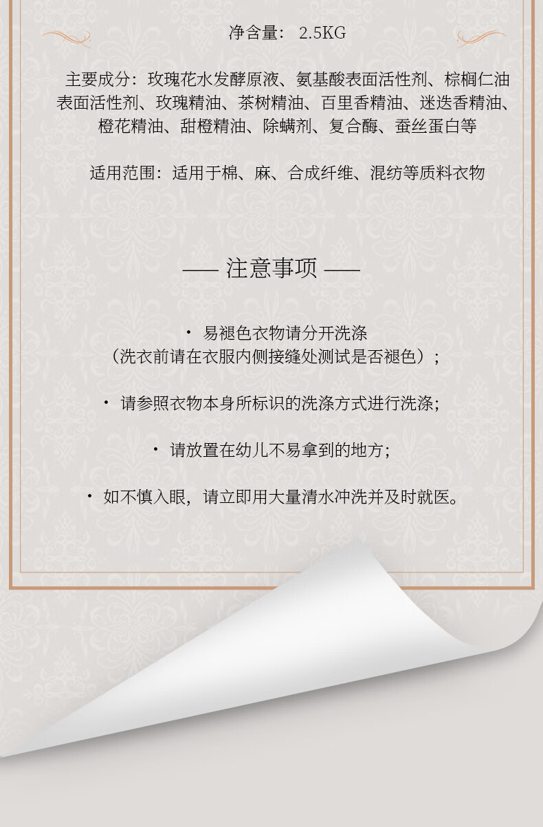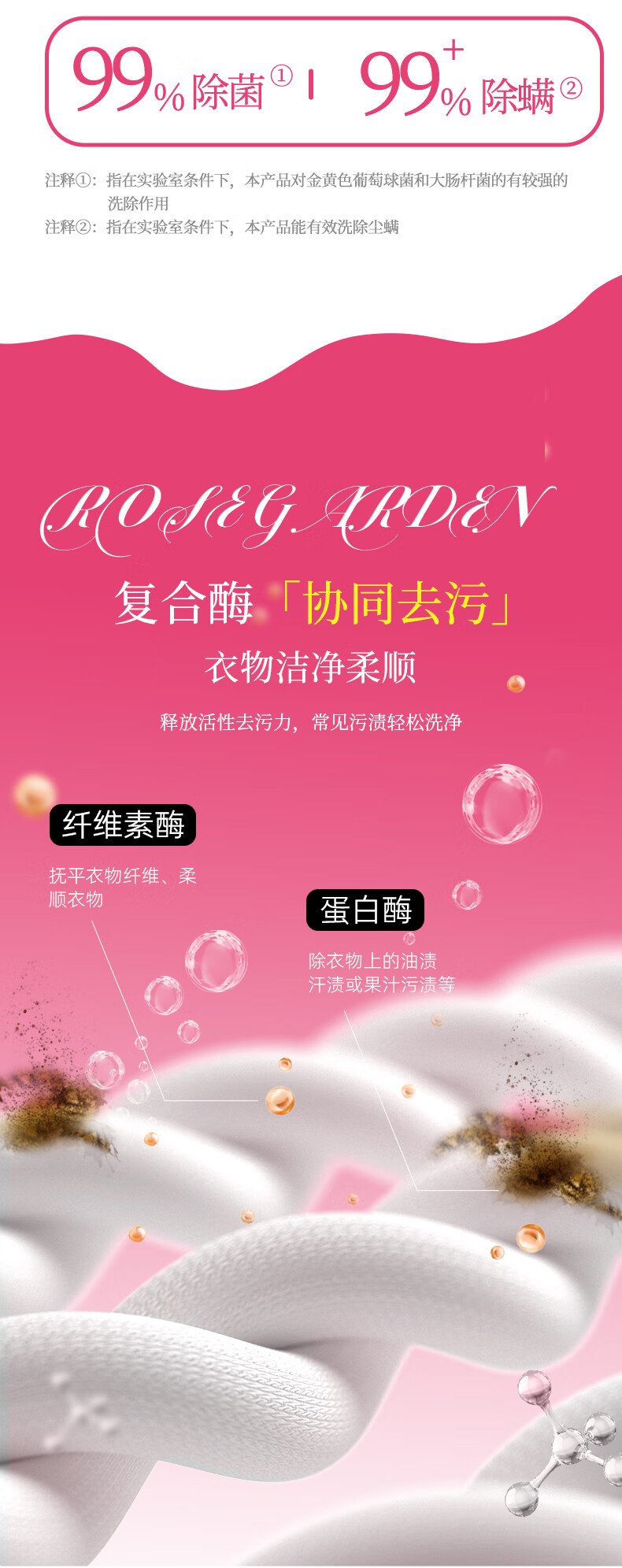 除菌除螨,去渍柔护,低泡易漂,省心洁净;氨基酸温和洁净配方,婴童衣物也能安心洗;添加蚕丝蛋白精华,呵护衣物洗后柔软;添加多重植物精油,植萃净味,防止衣物阴干产生异味;瑞士进口香氛,持久留香,散发优雅奢香
