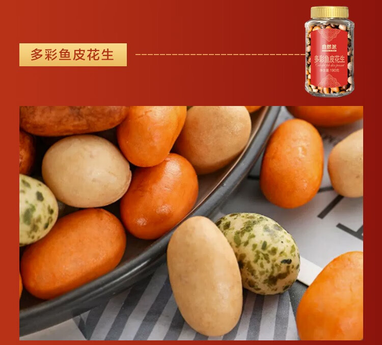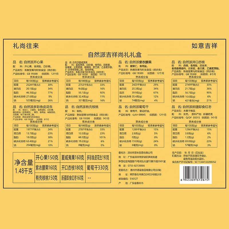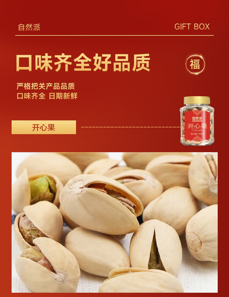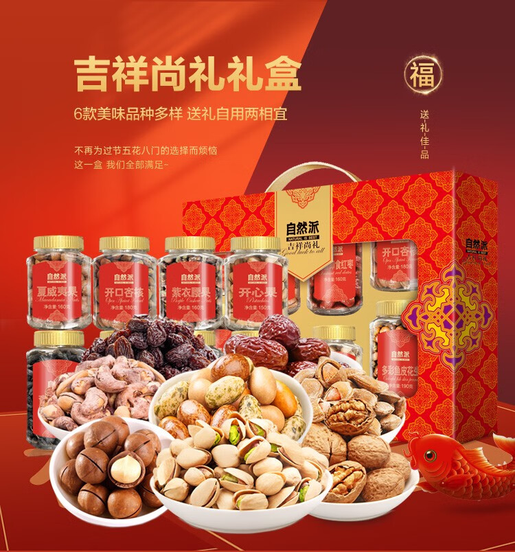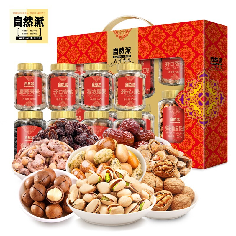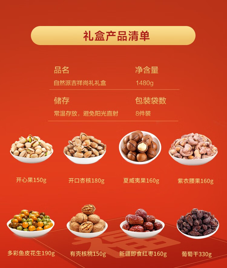 配置清单:自然派开心果150g 自然派开口杏核180g 自然派夏威夷果160g 自然派紫衣腰果160g 自然派多彩鱼皮花生190g 自然派有壳核桃150g 自然派新疆即食红枣160g 自然派葡萄干330g