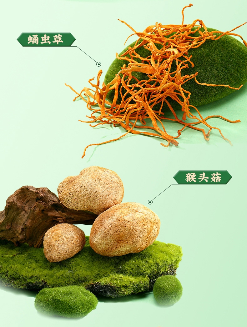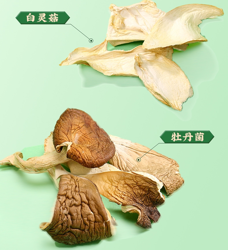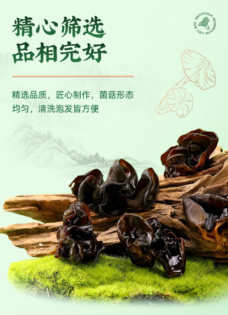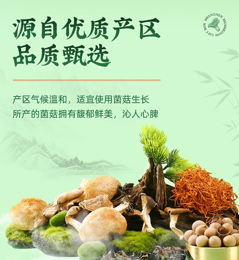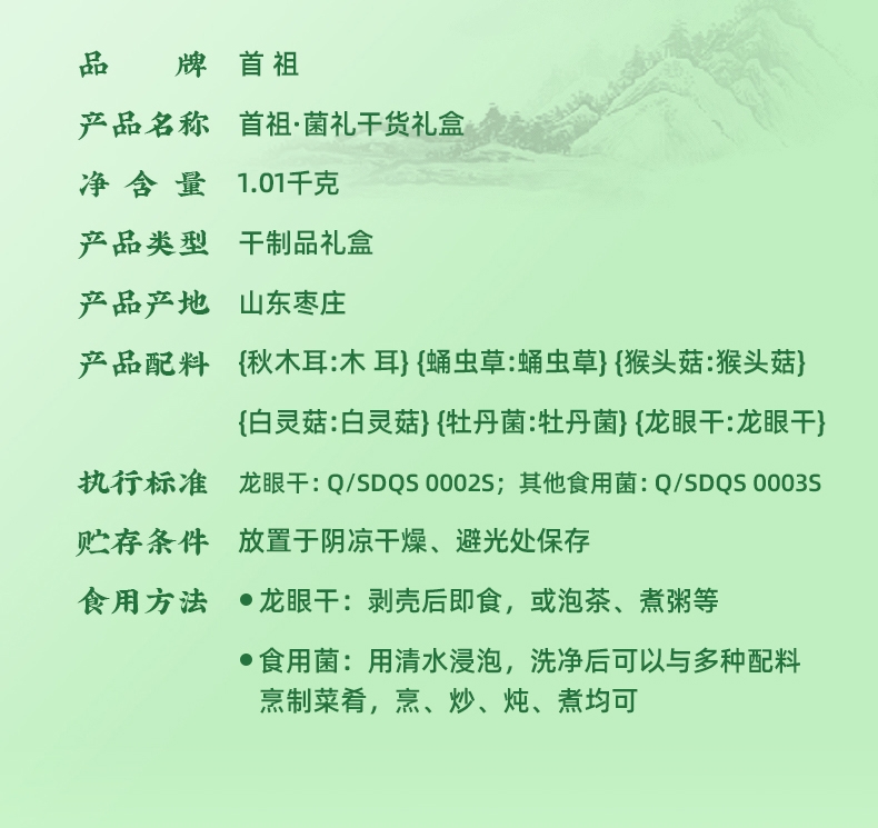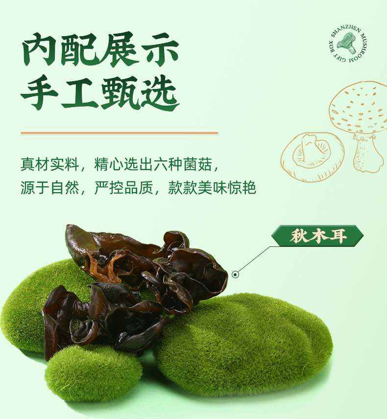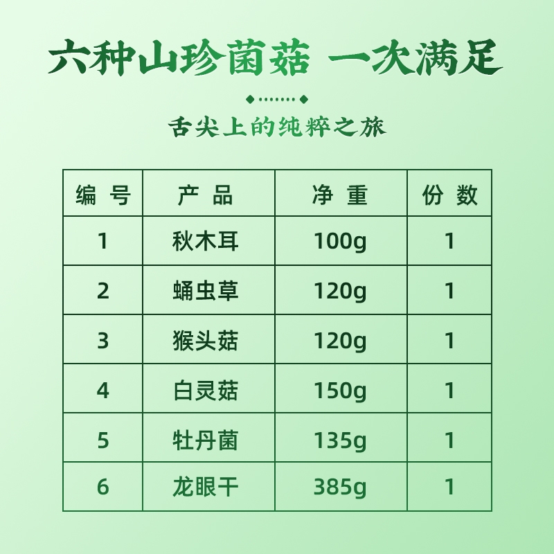 内配:秋木耳100g 蛹虫草120g 猴头菇120g 白灵菇150g 牡丹菌135g 龙眼干385g