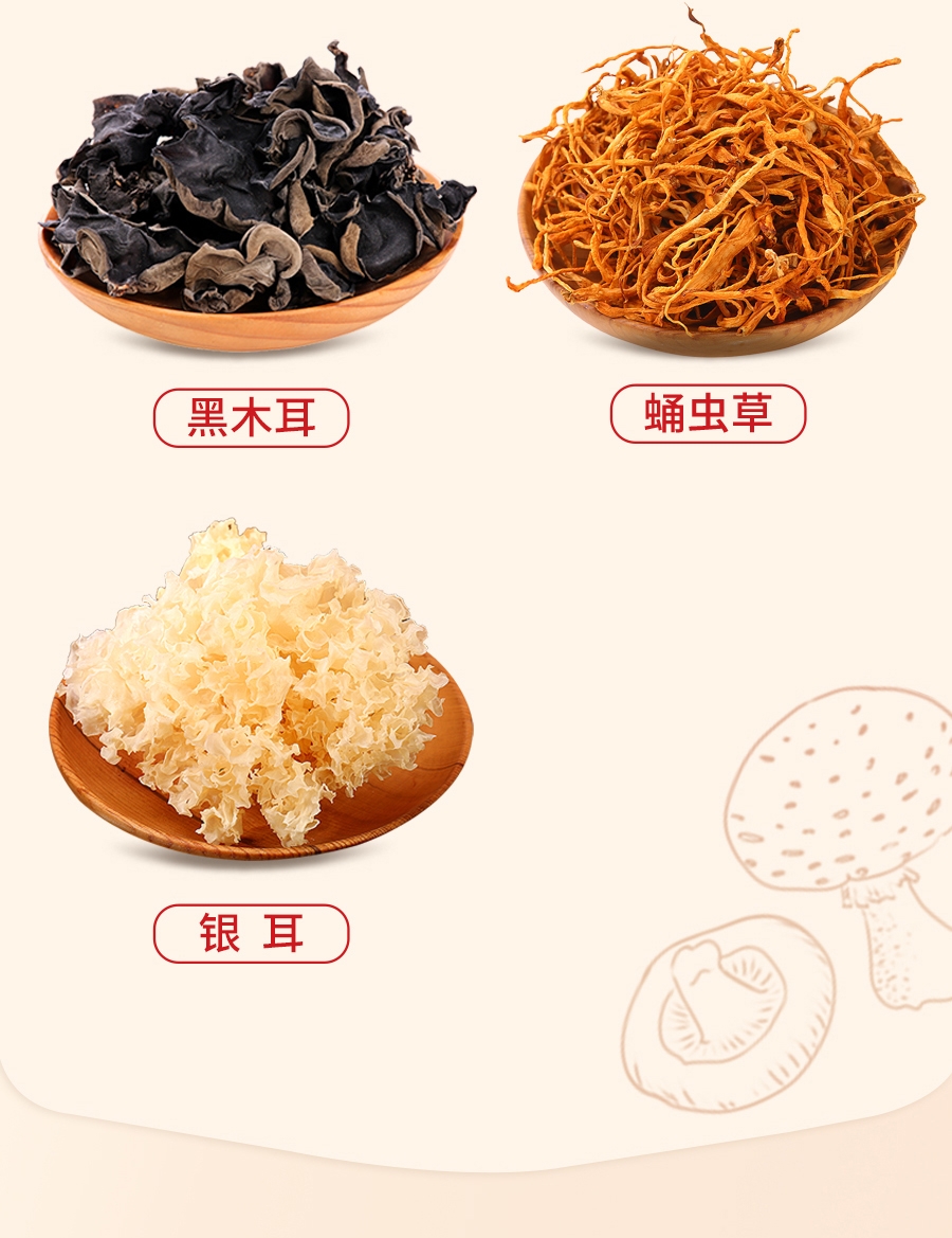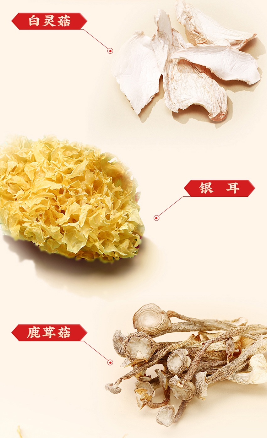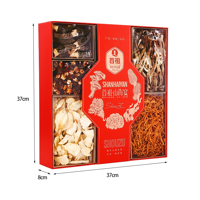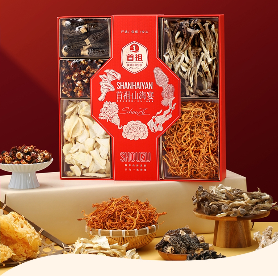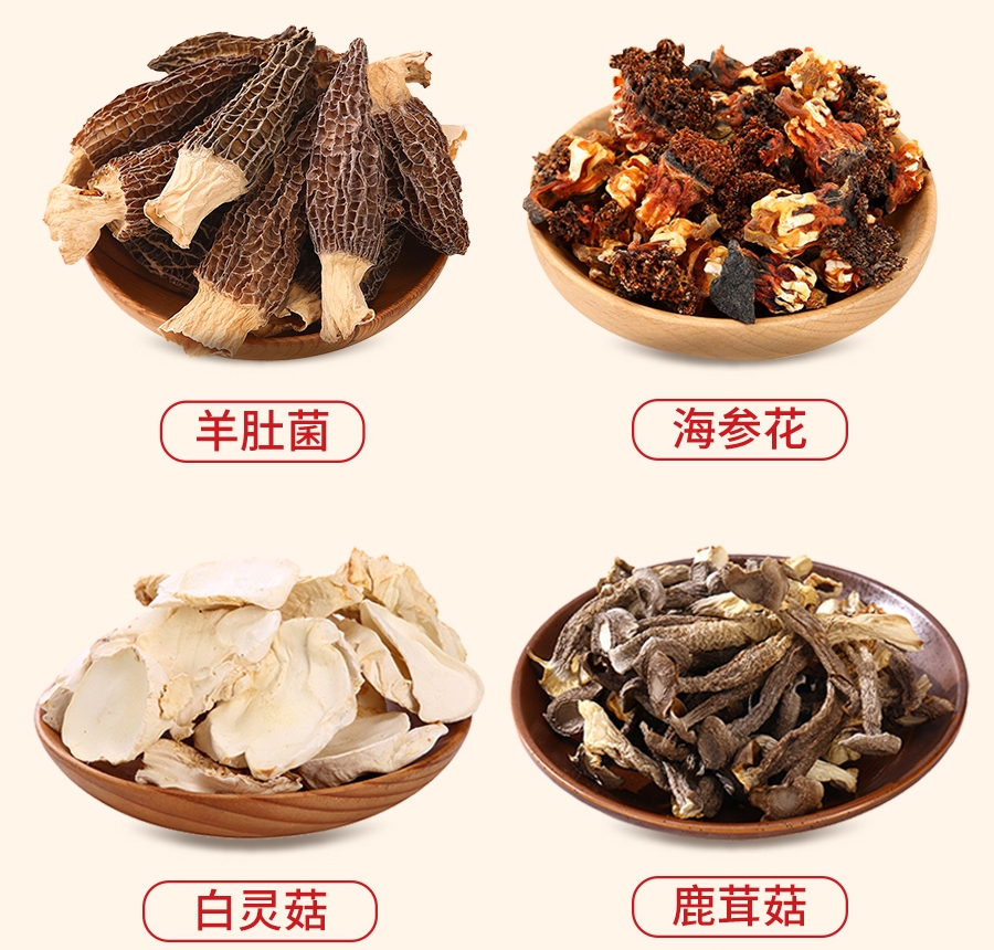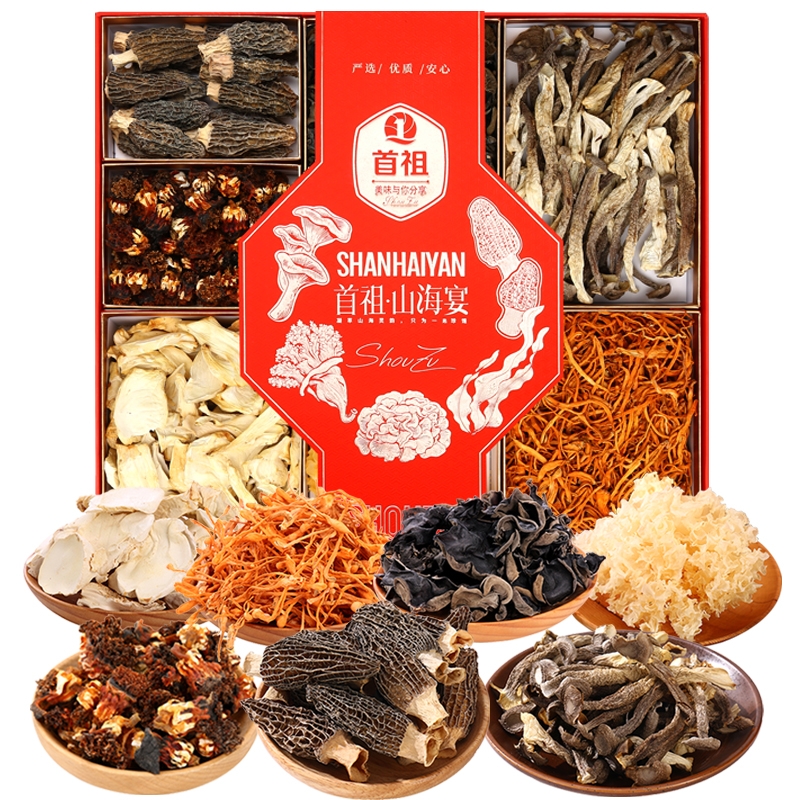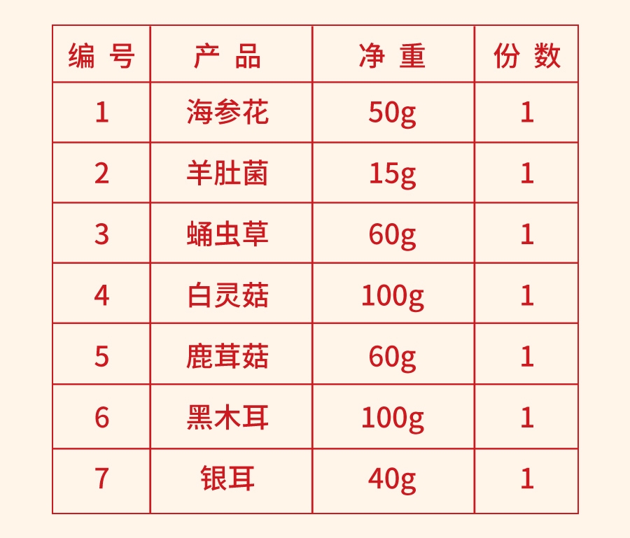 内配:海参花50g 羊肚菌15g 蛹虫草60g 黑木耳100g 银耳40g 鹿茸菇60g 白灵菇100g