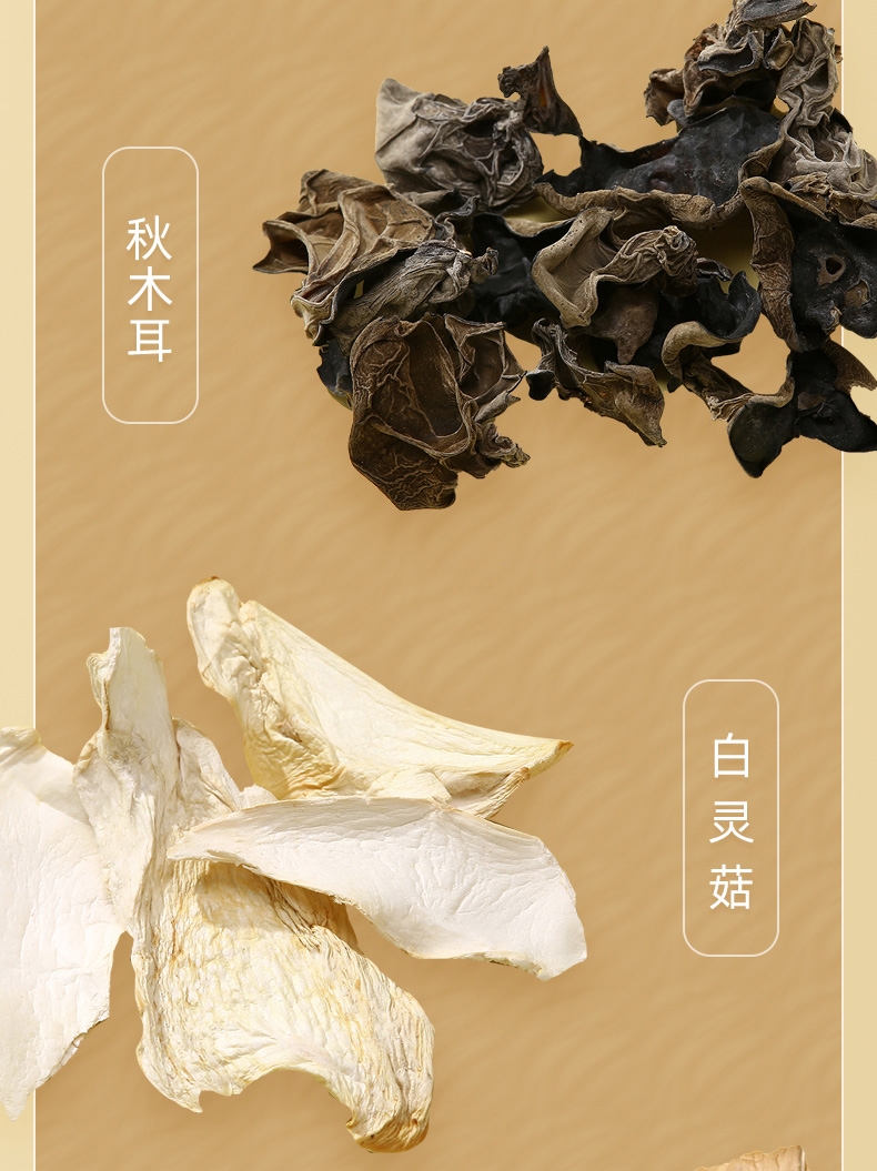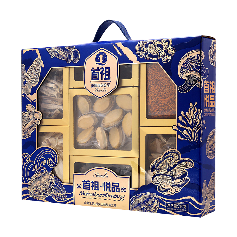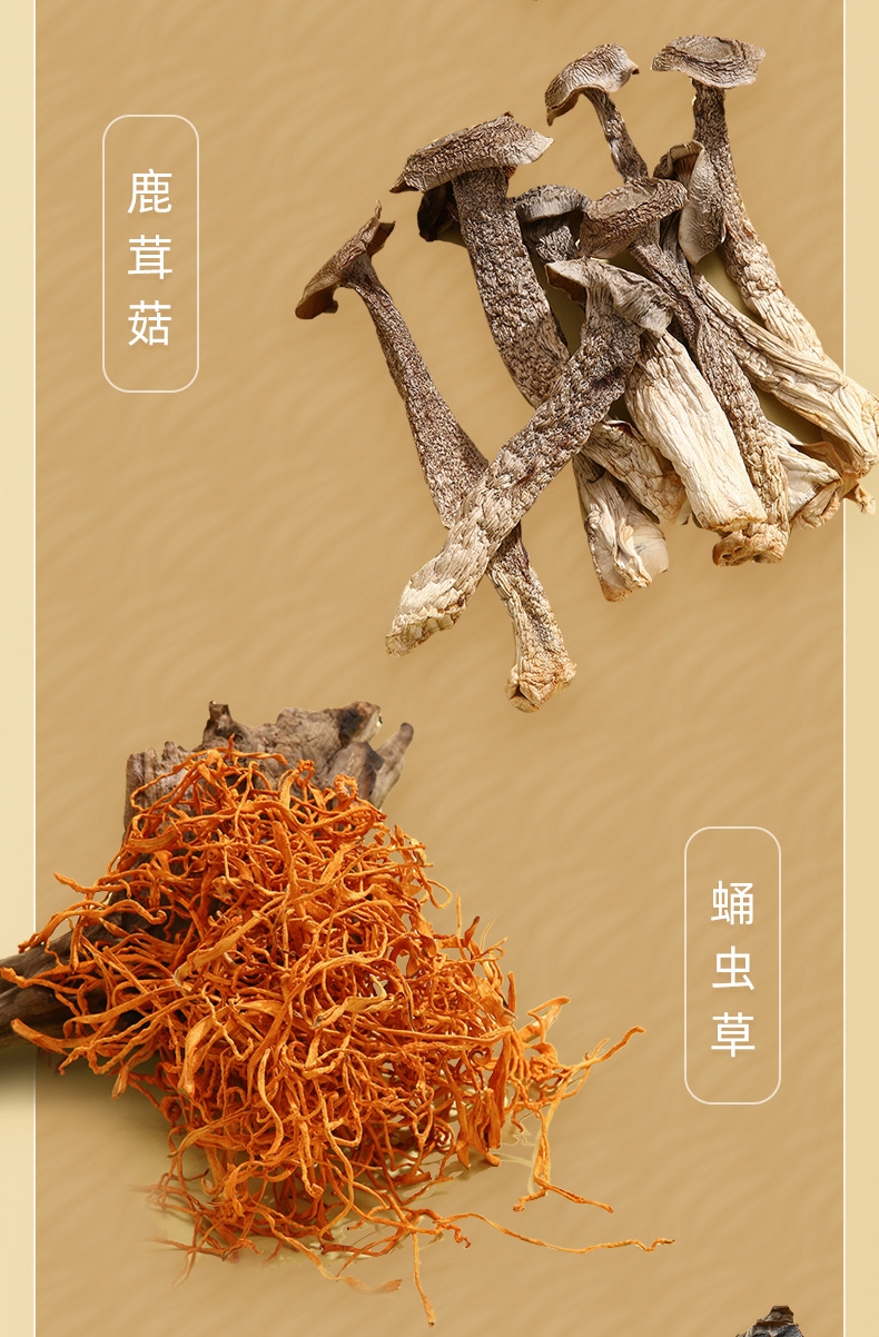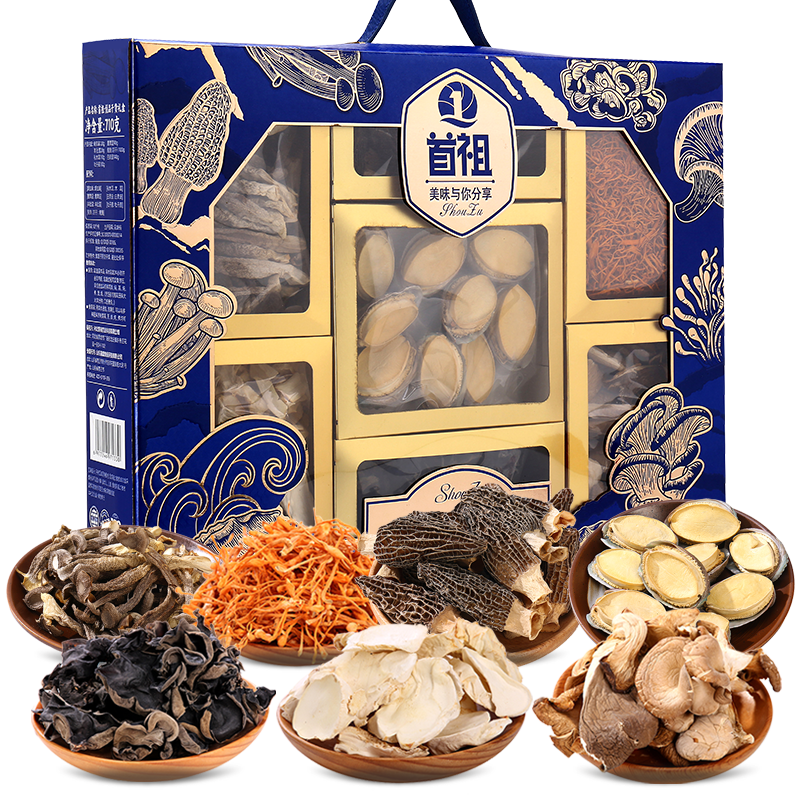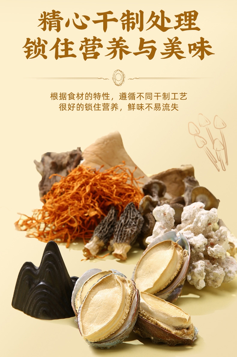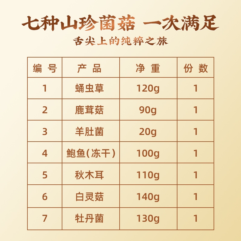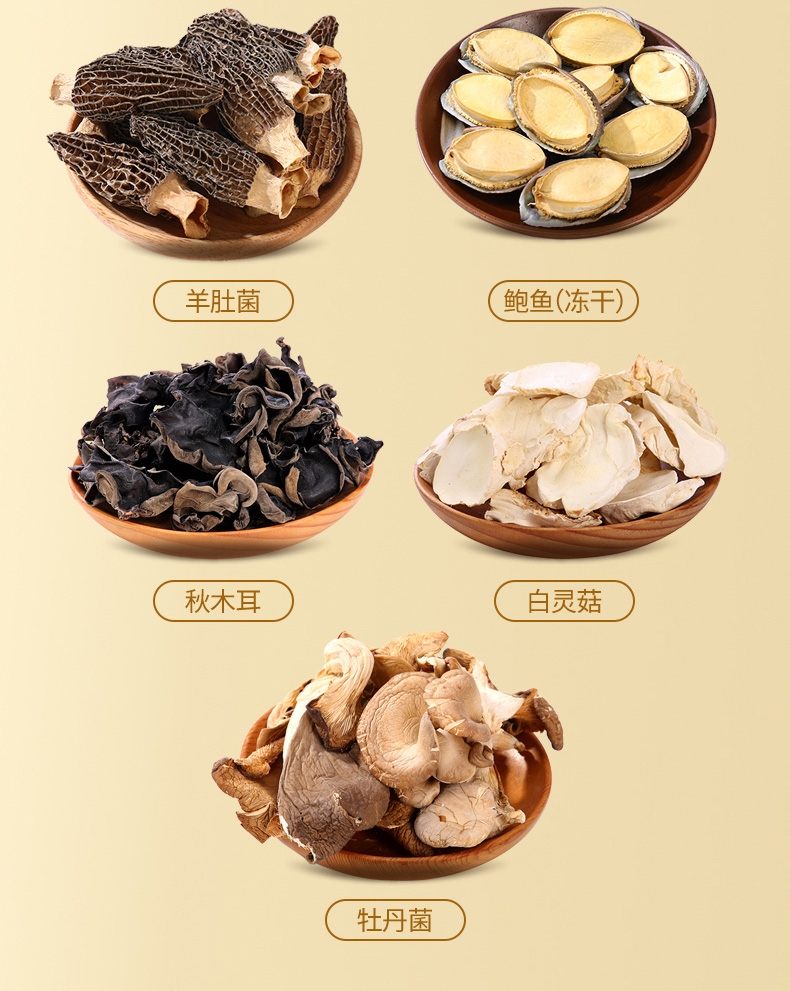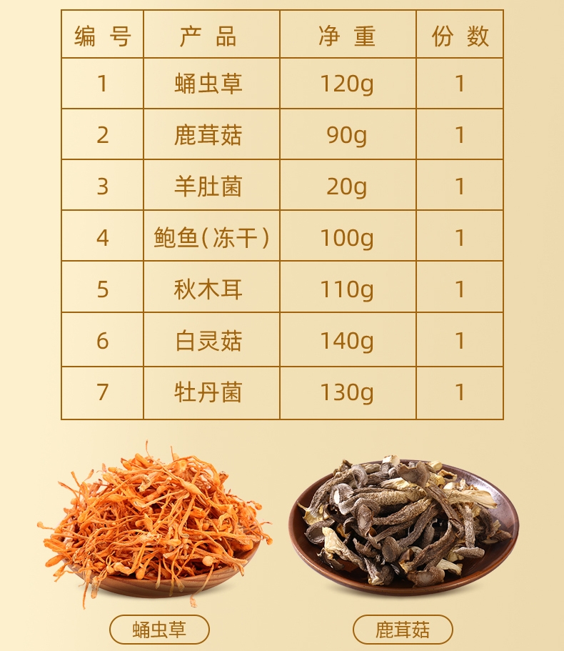 内配:蛹虫草120g 鹿茸菇90g 羊肚菌20g 鲍鱼(冻干)100g 秋木耳110g 白灵菇140g 牡丹菌130g