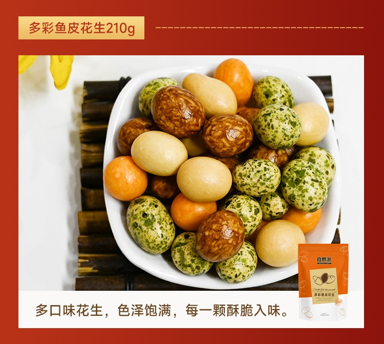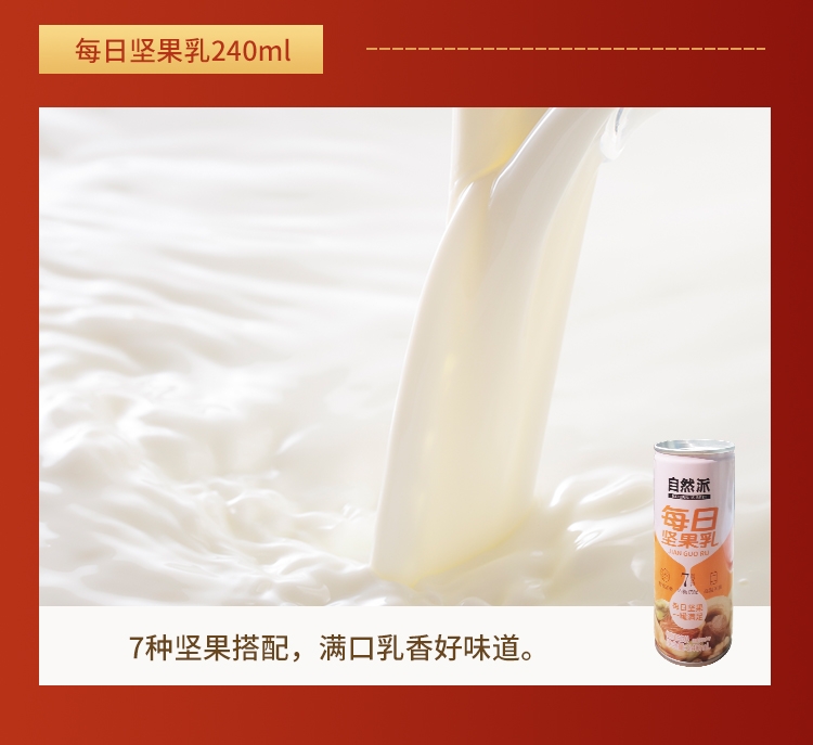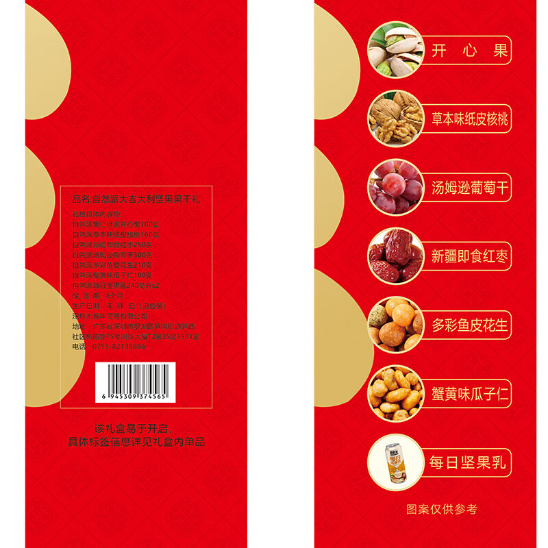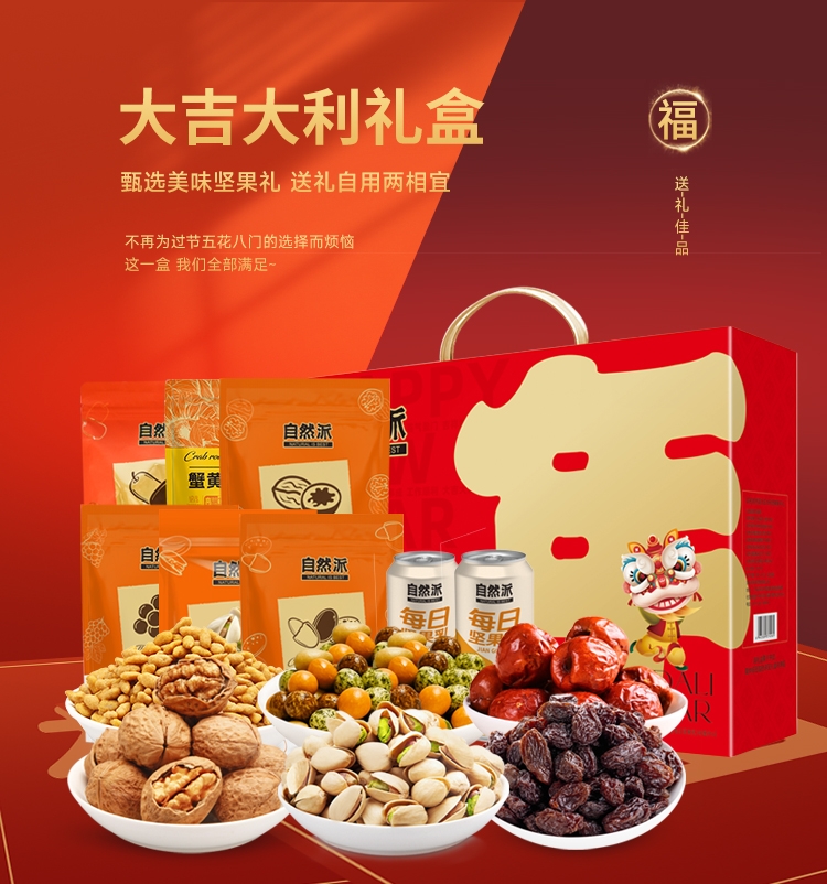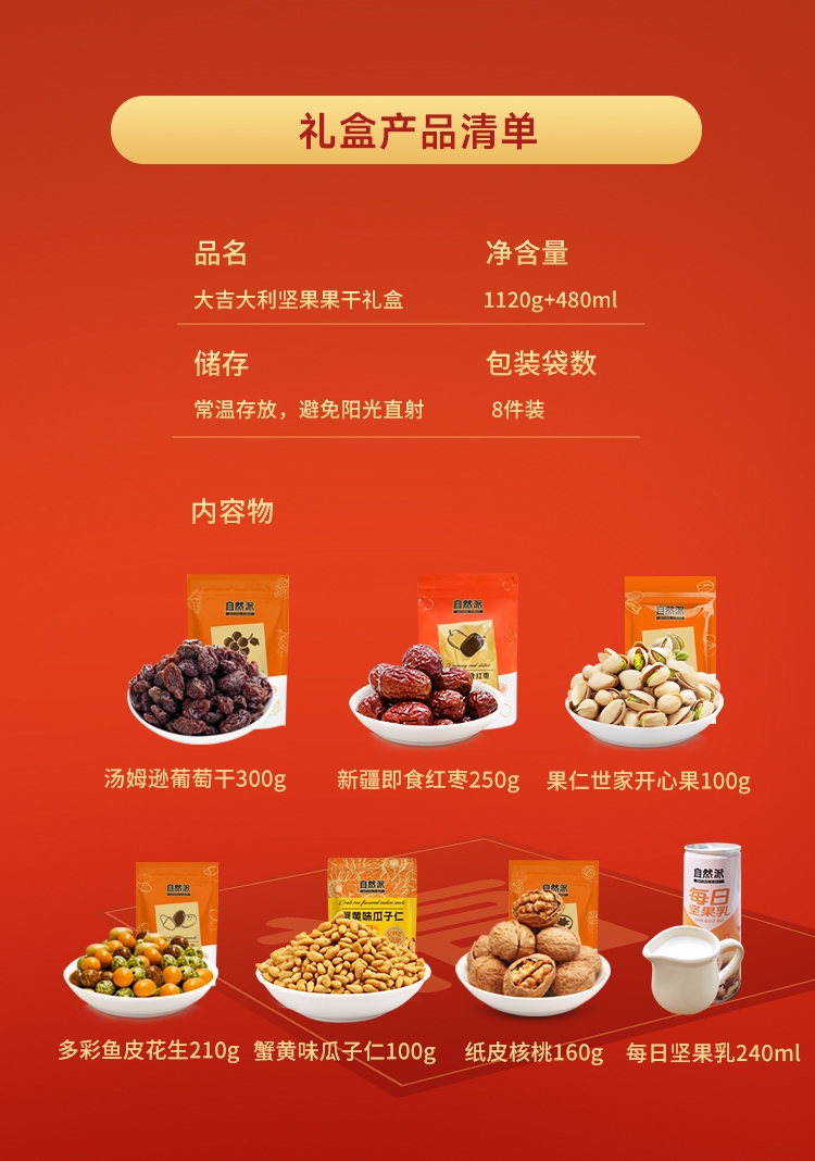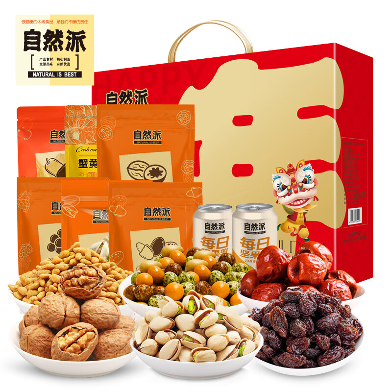 配置清单:自然派新疆即食红枣250g 自然派葡萄干300g 自然派果仁世家开心果100g 自然派蟹黄味瓜子仁100g 自然派草本味纸皮核桃160g 自然派多彩鱼皮花生210g 自然派每日坚果乳240ml*2