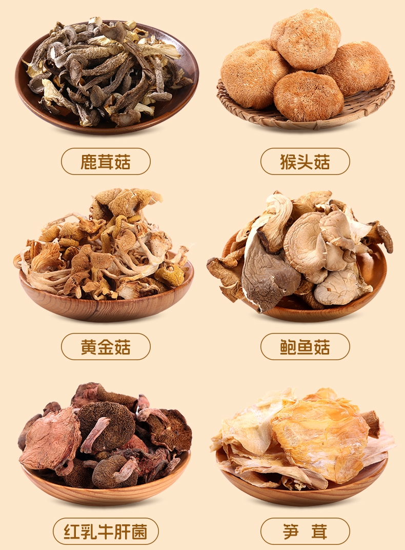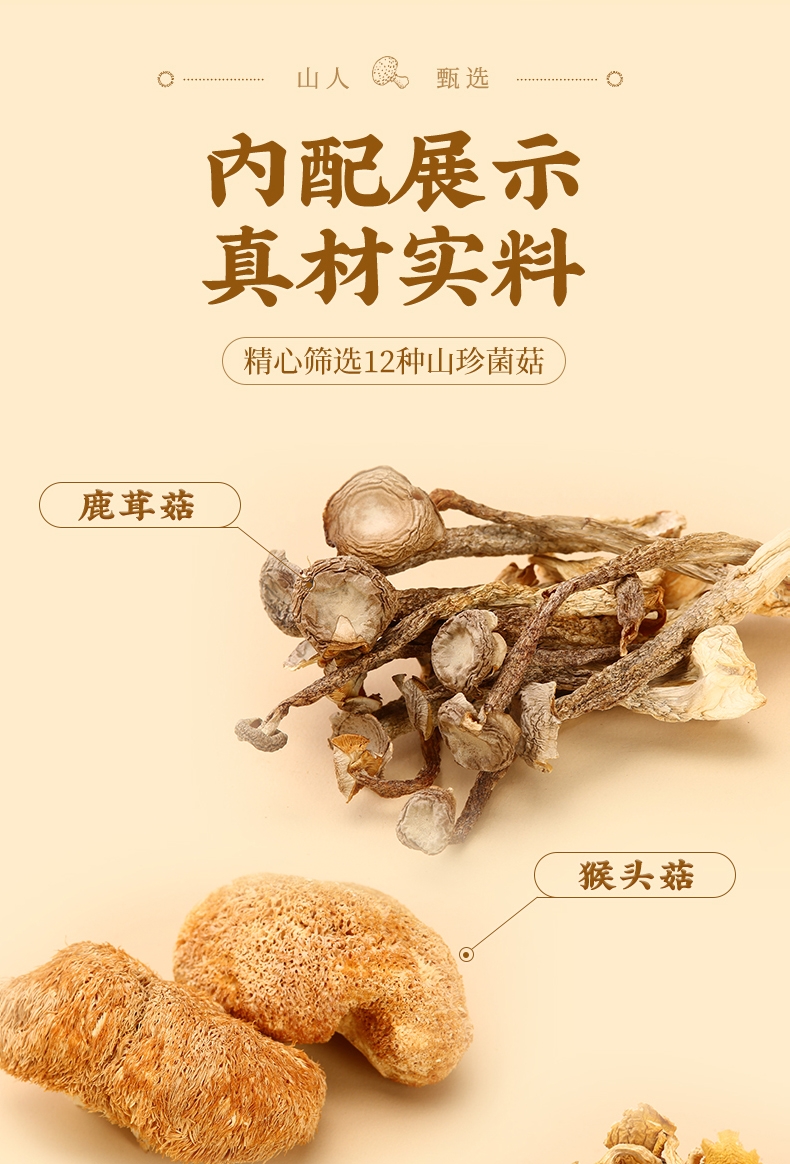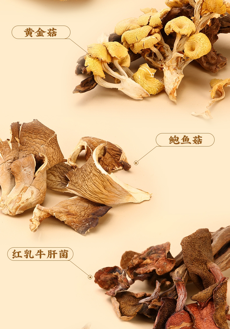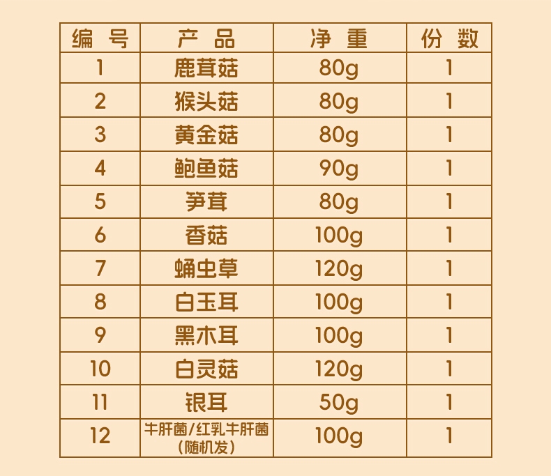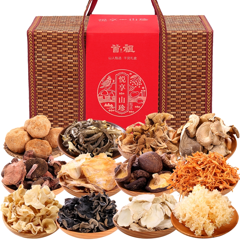 内配:银耳 50g 鲍鱼菇 90g 猴头菇 80g 笋茸 80g 黄金菇 80g 白玉耳 100g 黑木耳 100g 牛肝菌/红乳牛肝菌(随机发) 100g 香菇 100g 蛹虫草 120g 鹿茸菇 80g 白灵菇 120g