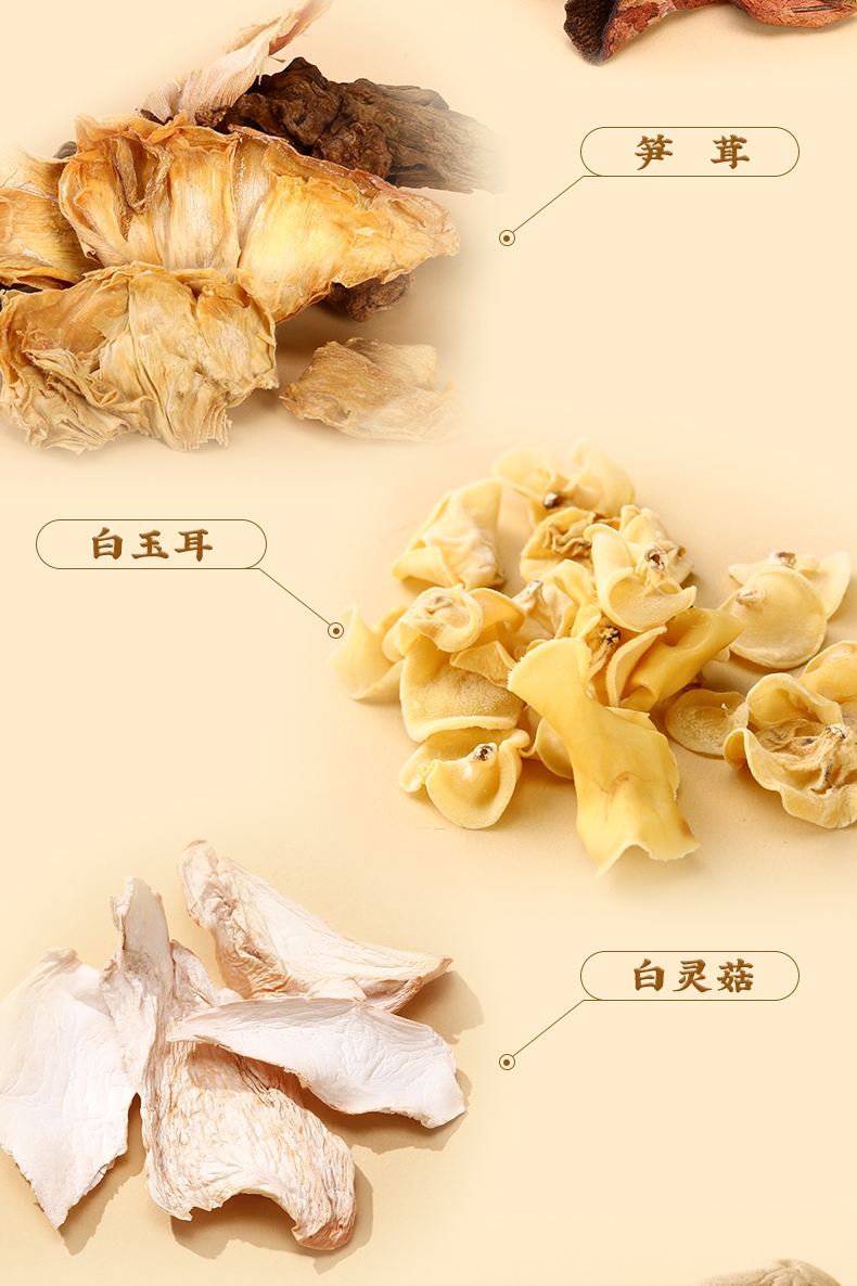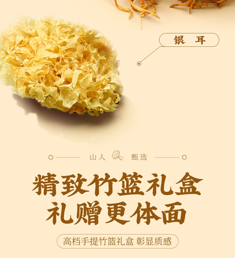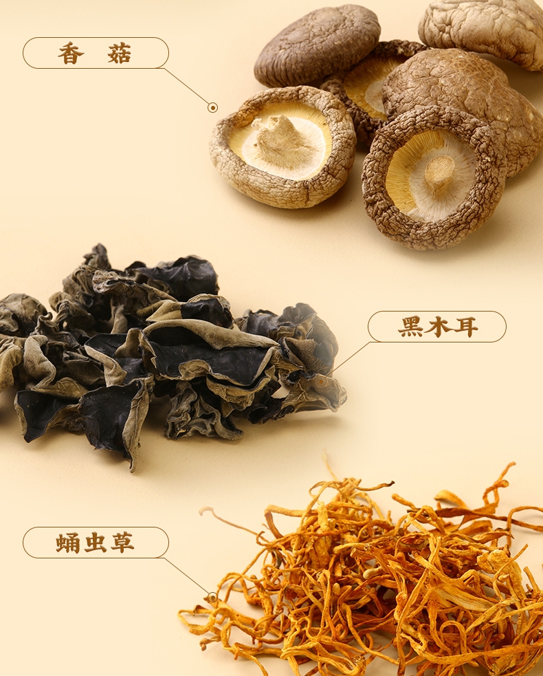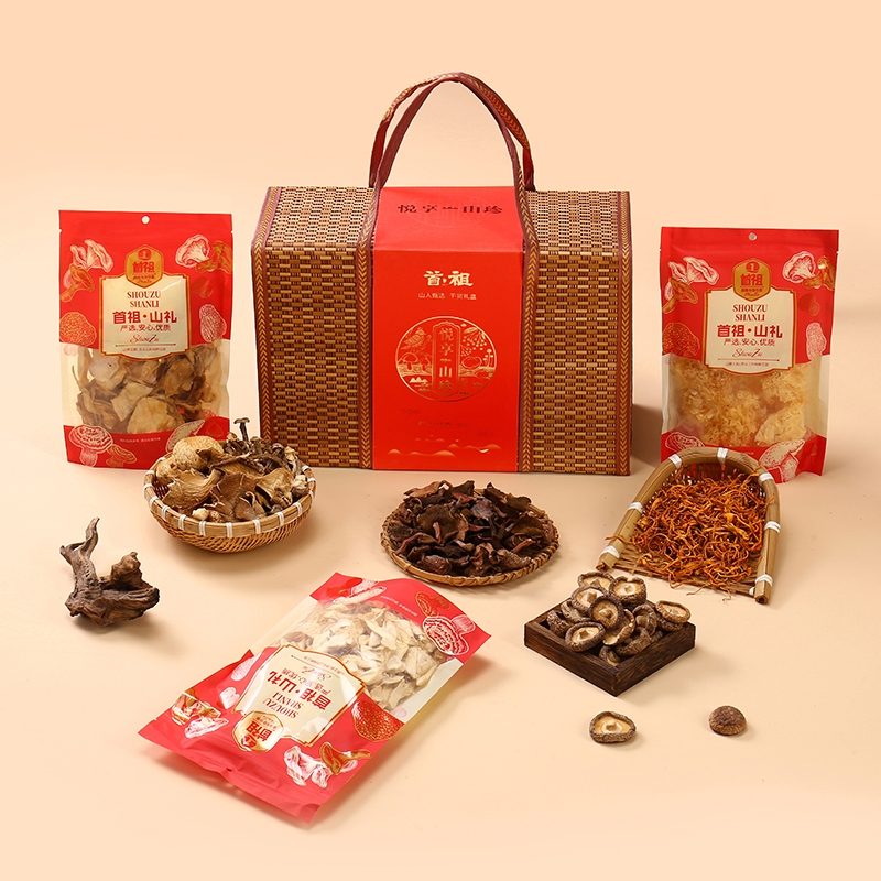 内配:银耳 50g 鲍鱼菇 90g 猴头菇 80g 笋茸 80g 黄金菇 80g 白玉耳 100g 黑木耳 100g 牛肝菌/红乳牛肝菌(随机发) 100g 香菇 100g 蛹虫草 120g 鹿茸菇 80g 白灵菇 120g