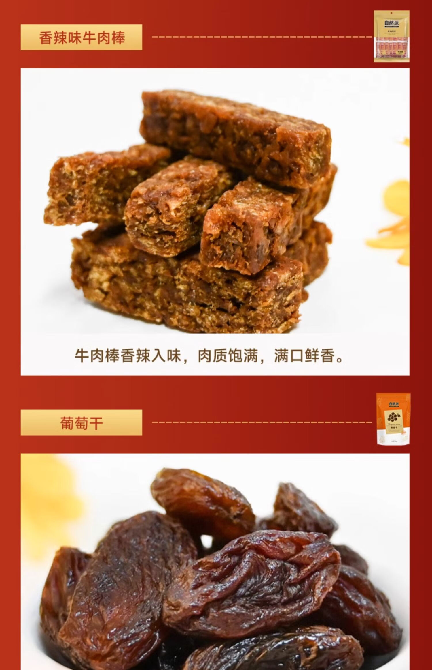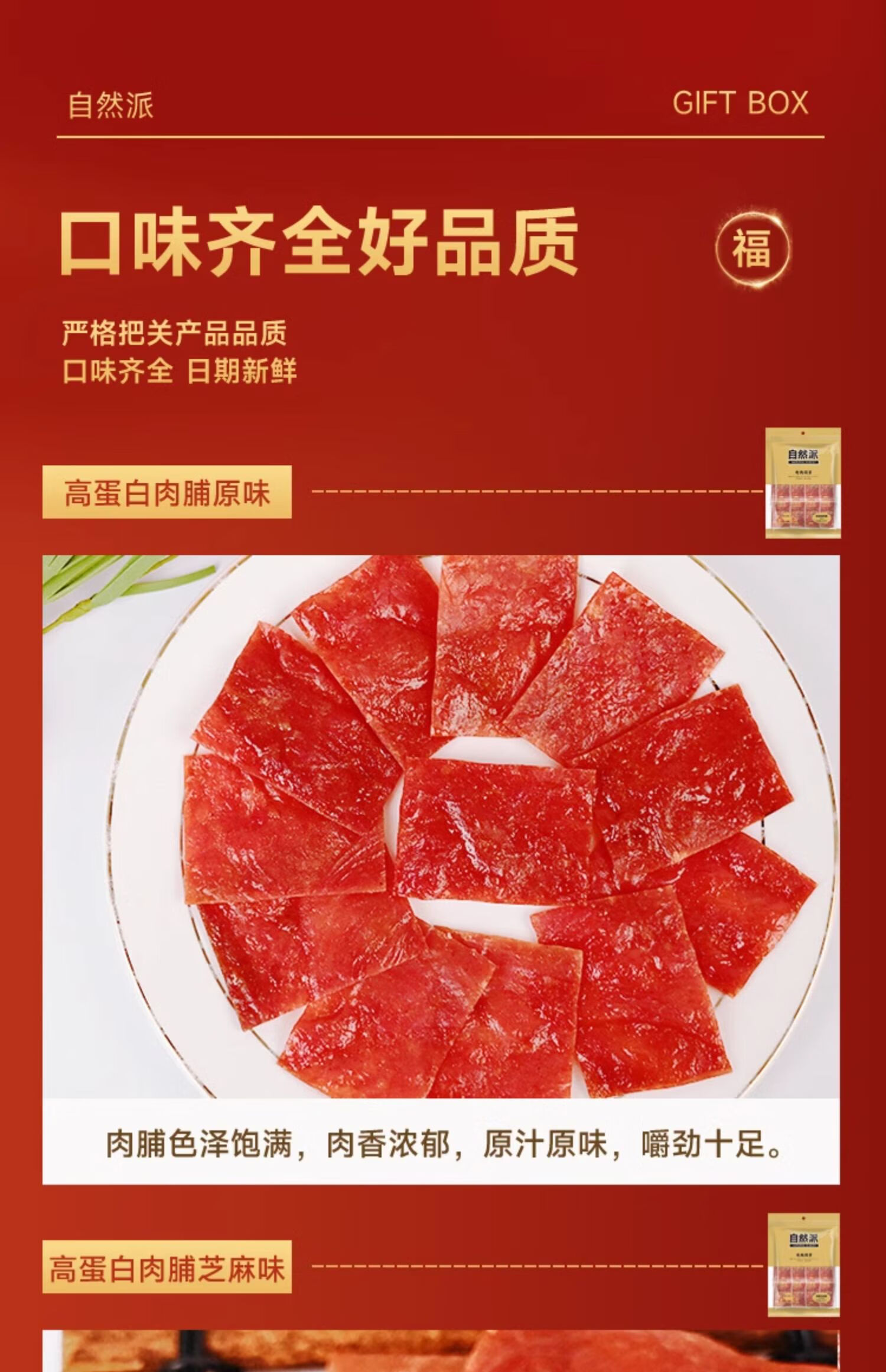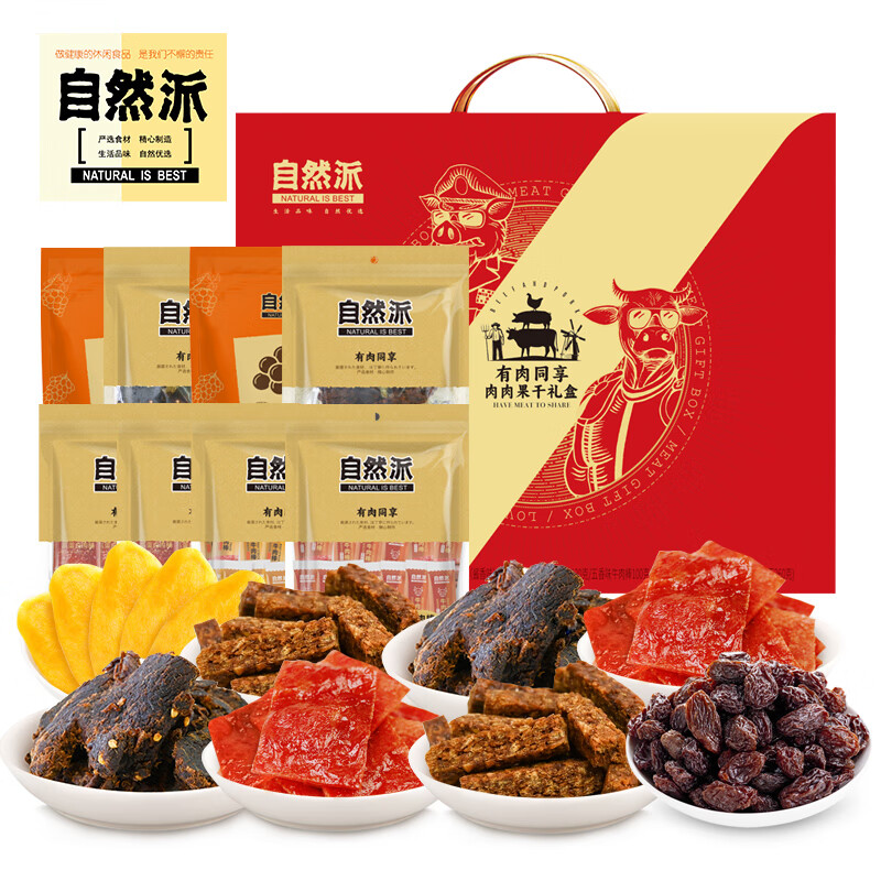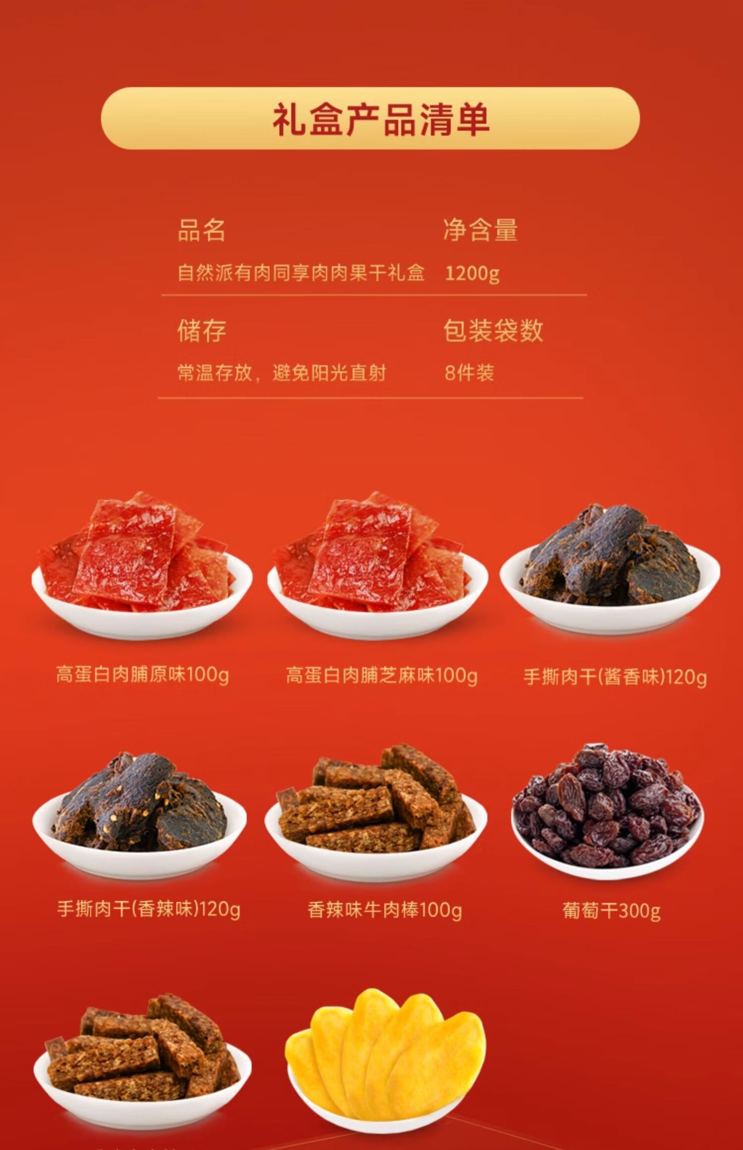 配置清单:自然派高蛋白肉脯(原味)100g 自然派高蛋白肉脯(白芝麻味)100g 自然派手撕肉干(酱香味)120g 自然派手撕肉干(香辣味)120g 自然派五香味牛肉棒100g 自然派香辣味牛肉棒100g 自然派葡萄干300g 自然派芒果干260g
