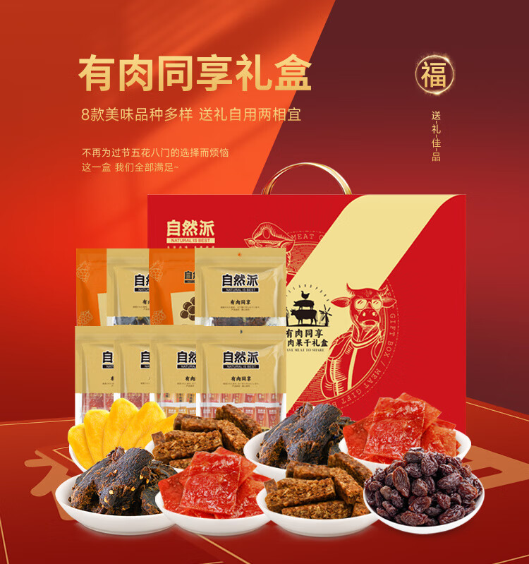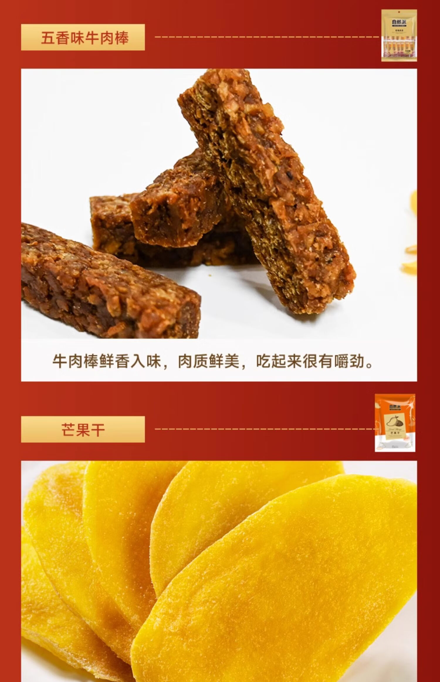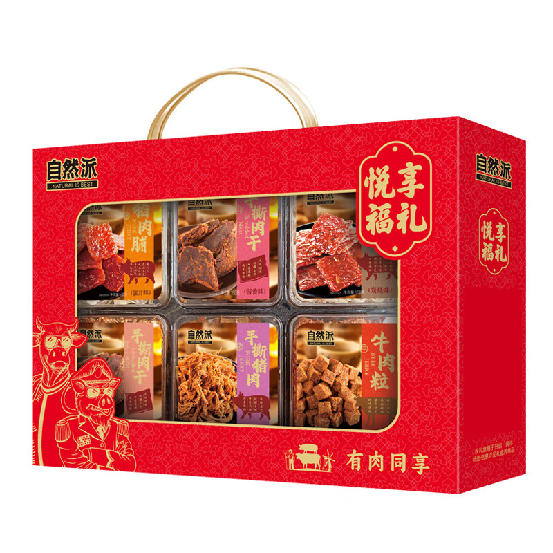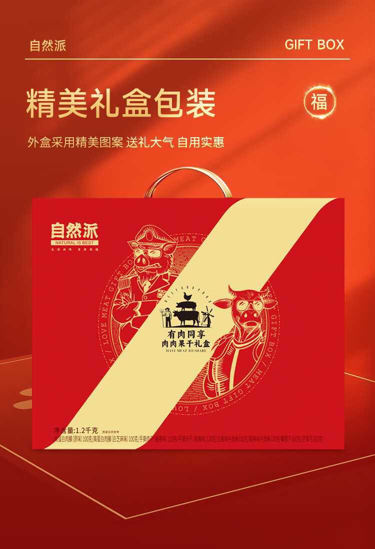 配置清单:自然派高蛋白肉脯(原味)100g 自然派高蛋白肉脯(白芝麻味)100g 自然派手撕肉干(酱香味)120g 自然派手撕肉干(香辣味)120g 自然派五香味牛肉棒100g 自然派香辣味牛肉棒100g 自然派葡萄干300g 自然派芒果干260g