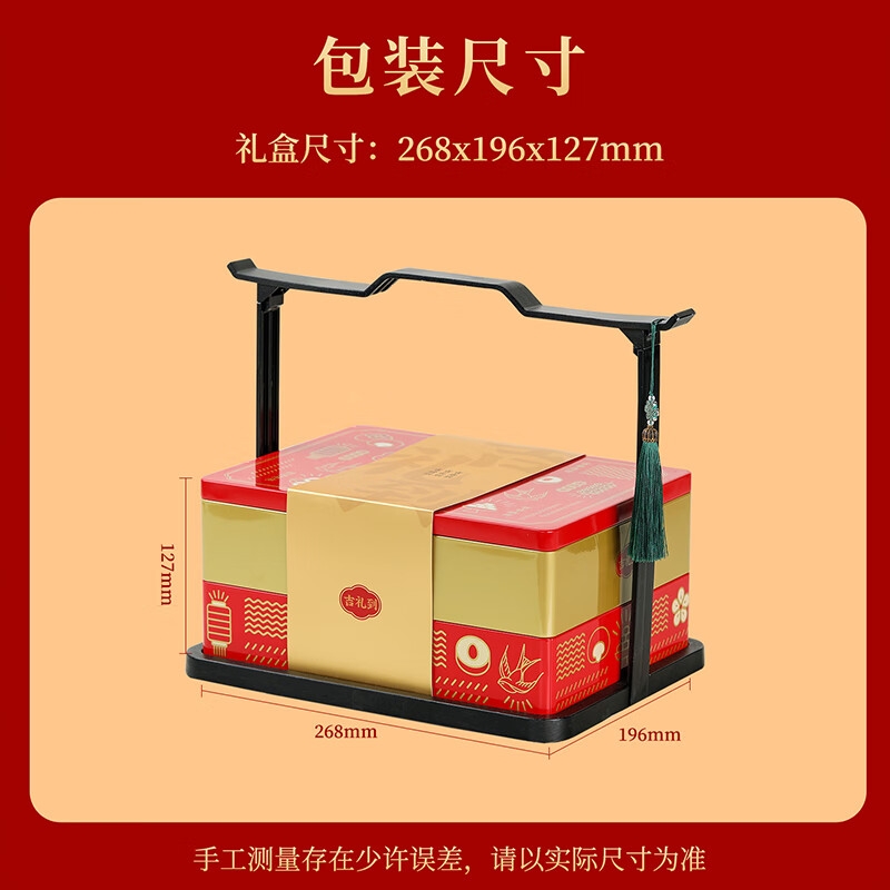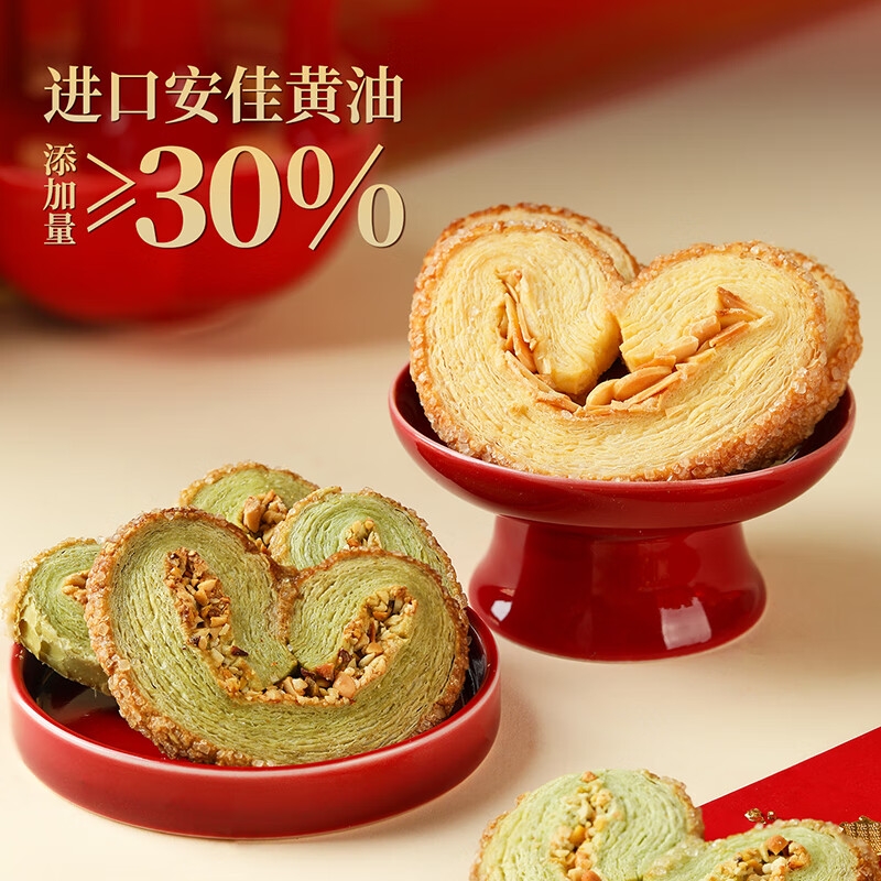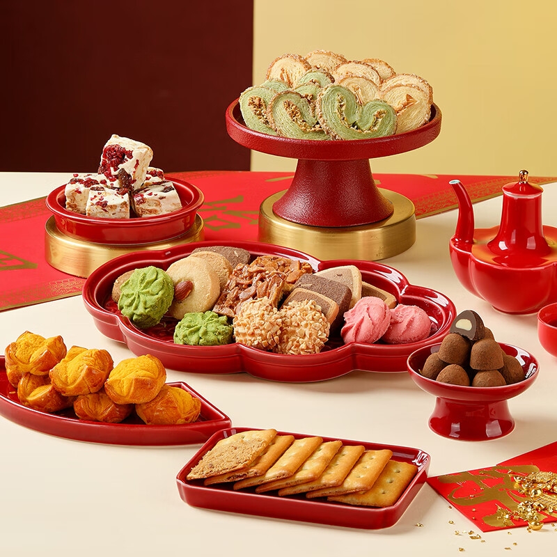 配置:葡萄饼干40g 抹茶曲奇40g 巨无霸果仁饼干32g 果仁小饼23g 可可味饼干68g 燕麦咖啡饼干22g 萌托斯饼干35g 玫瑰曲奇40g 蔓越莓雪花奶酥15g*10 真巧椰椰松露巧克力5*20 笑口蛋黄酥10g*10 牛肉馅酥脆饼干90g 扁桃仁蝴蝶酥10g*3 开心果蝴蝶酥10g*3